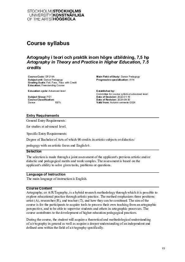 This exposition is part of that article: Østern, T.P., Reppen, C., O’Connell, S., & Daneberg, M. (2025). Choreographer/researcher/teacher: Developing a/r/tography as an approach to dance pedagogy at Stockholm University of the Arts in a professional learning community of teachers. Nordic Journal of Art & Research, 14(2). https://doi.org/10.7577/ar.5460
