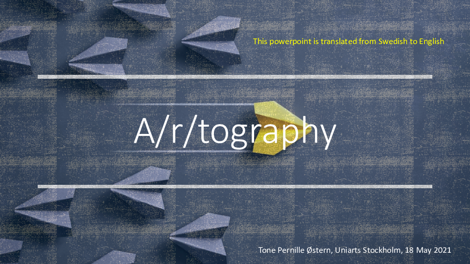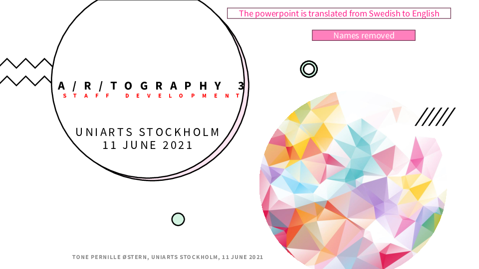 THE THIRD WORKSHOP centered on a discussion about how we could qualify ourselves as teachers within an a/r/tographic BA program. As a result of this third workshop, we decided to design an open course for staff, which would carry 7.5 ects. From that point on, the concrete design of the course began. At this point, Ylva Hofvander Trulsson was Dean.