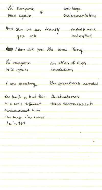 There's beauty in the opacity of others' acts, side by side with the opacity of titanium dioxide. There are twisty borders in the millimeters of tension of what is visible to the naked eye and what can only be seen through the machine, between what can be touched without danger and what’s endangered — in science and art. There's immense beauty in the vulgarity, in the volumes of data, and in the routines of others, but also in how all of this can be understood as phenomena, dances of precise injections, and beams of light. — How can one see beauty? - There's beauty everywhere here.