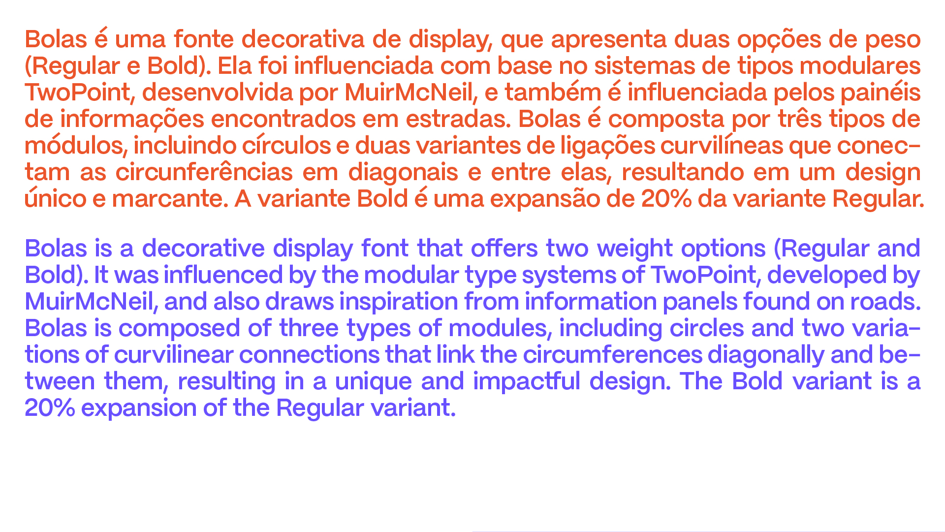 Bolas is a decorative display font that offers two weight options (Regular and Bold).