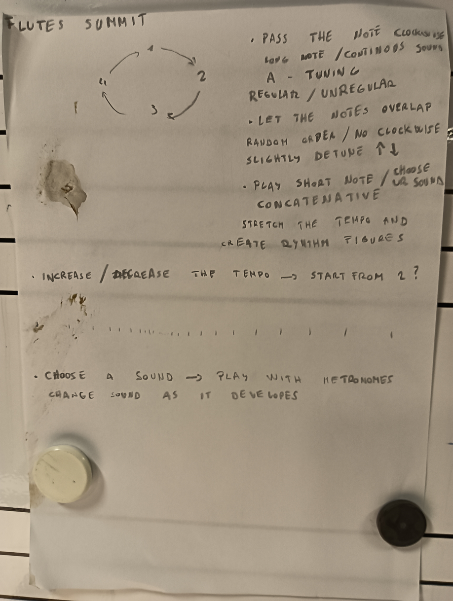 I aimed for the pulse to provide comfortable support for the musicians, typically using tempos ranging from 40 to 100 bpm. I experimented with various metronome intercorrelations, including sections where we started from the same bpm and then slightly diverged from it. I set each metronome differently with intervals of 2 to 5 bpm between them. This resulted in parts of the group playing at a slower tempo while others played at a faster tempo, and so on. The metronome provided them with a grid, and the challenge was to determine "what" and "how" they could move and expand within that framework.