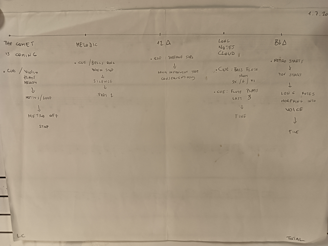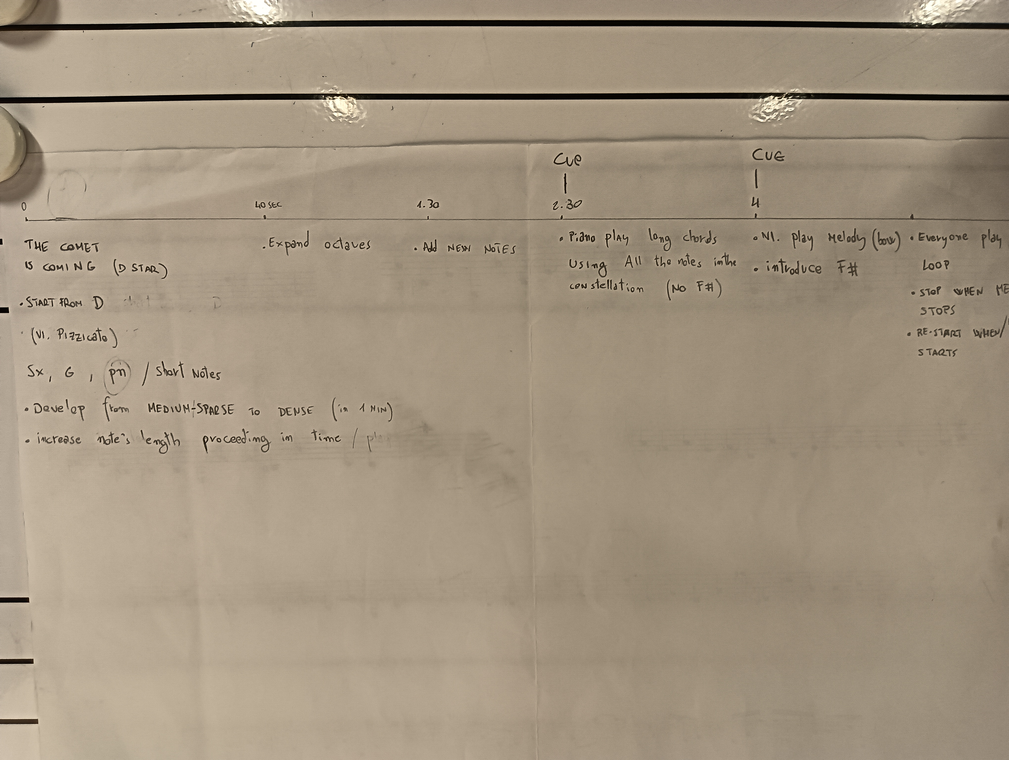 I also really like the idea of a cybernetic orchestra, an independent organism that is self-regulating, so most of the time I avoid giving cues or conducting the ensemble, but rather I want the performers to influence the rhythm of the music, so that they are in charge of the path to be taken, and to the action of one, in an immediate, intrinsic way, the reaction of the others. I believe this method is more engaging for the players, and for me it is surely more exciting, so at the moment I am designing cards of parameters, to fill and distribute to the musicians, in order to randomly test different combinations, aiming for more interaction and engagement from the participants.