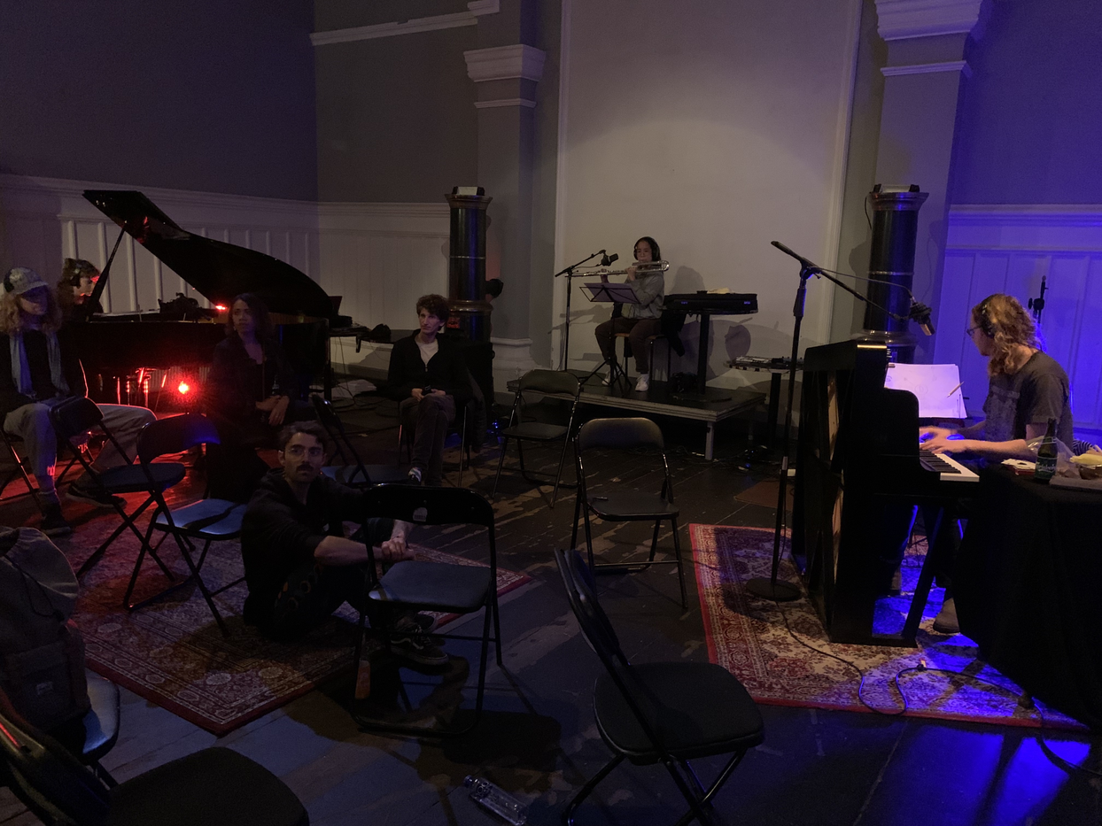 at our first meeting I had an organic of flute, 2 tenor saxophones, 2 classic and electric guitars, 2 pianos, vibraphone, and campanula. I disposed the band in a circle around the room, placing the doubled instruments in front of each other (hard panning), I was in the centre of the room, controlling the recording and the audio pulse sent to the musicians.