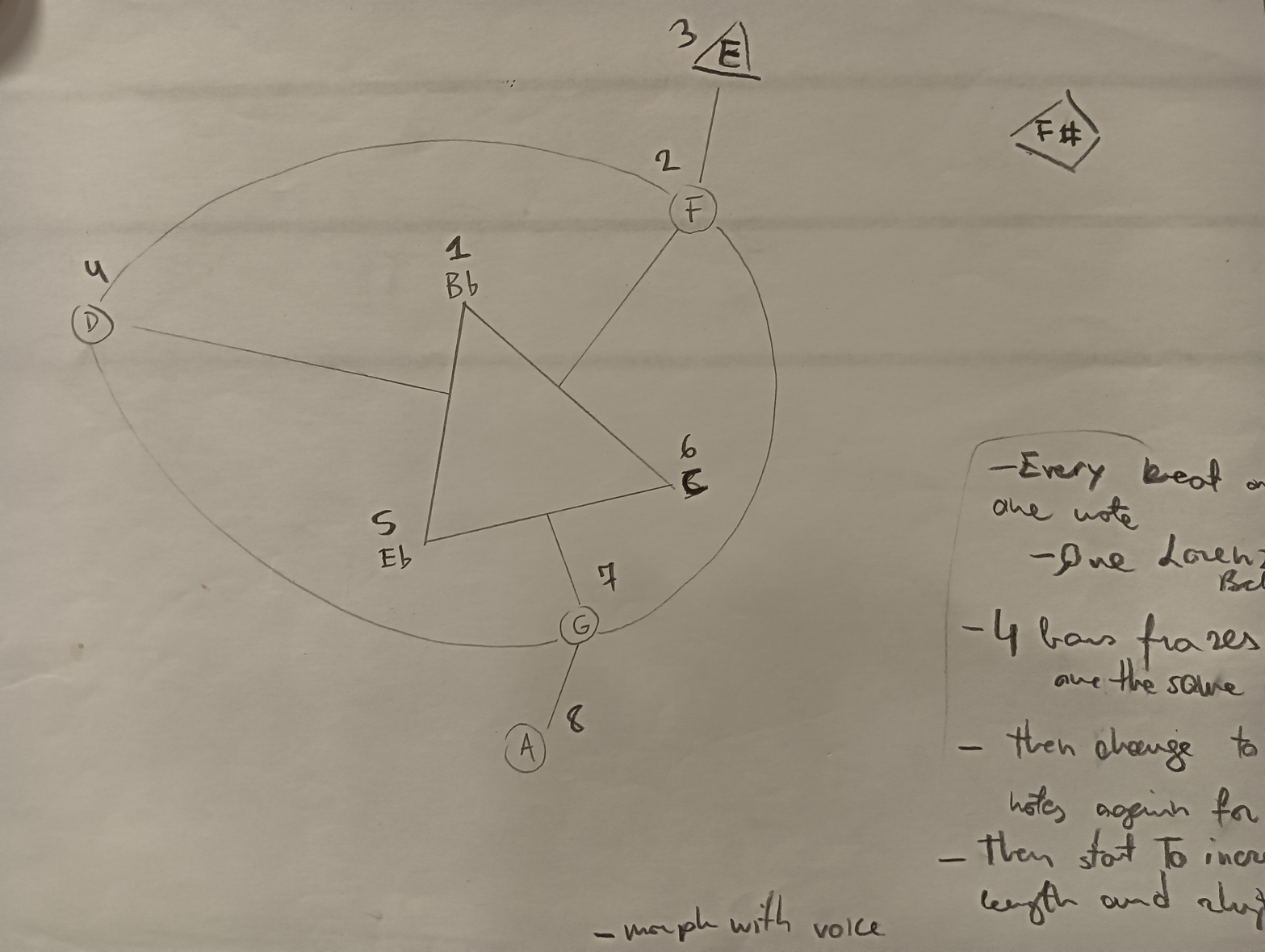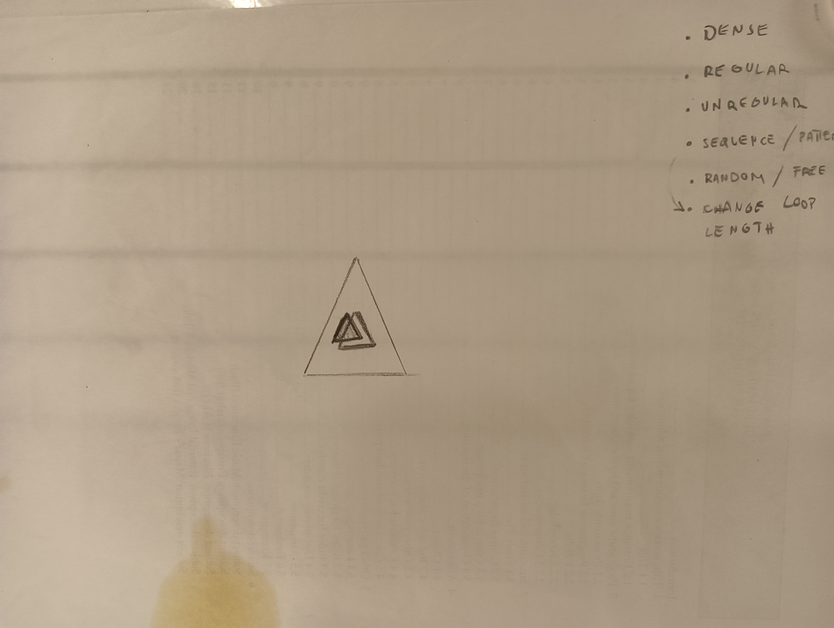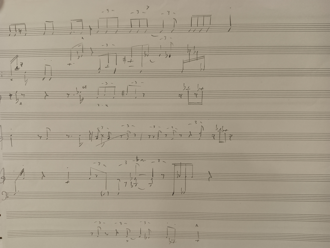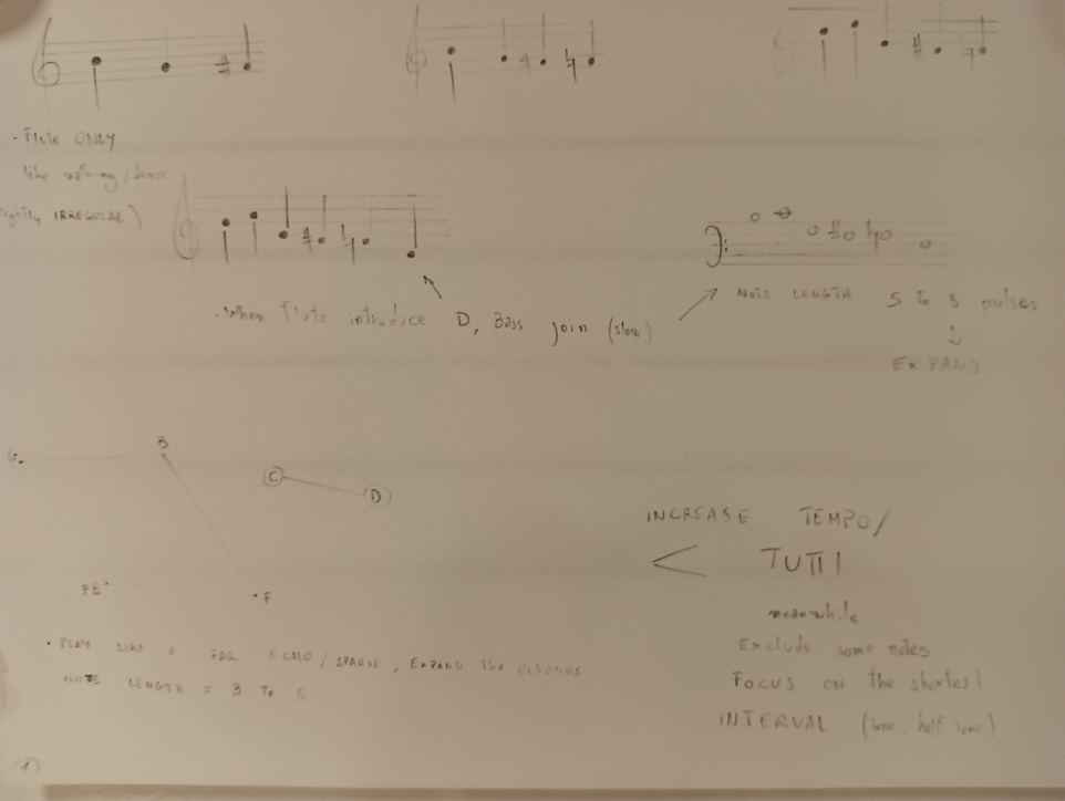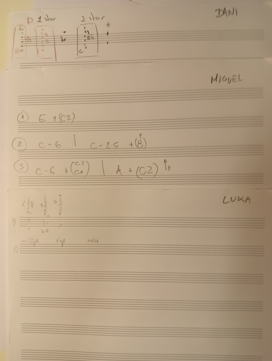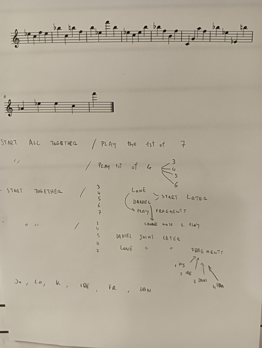 I started writing simple graphic scores using shapes and notes in letter’s form. Initially, I used notes I extrapolated from my previous transcription (see assessment II), later exploring different harmonic possibilities in different ways, like thinking in harmonic “regions”, using intervals layering, using the spectral image of one sound to derive the tonal material, finding tones at the piano, etc. The first scores usually consist of one paper, created with the purpose of testing the method, that can be treated in different ways. They provide a harmonic setting, as at the beginning I thought a harmonic coherence would help the performers “feel” the musicality in the process, compensating with a clear harmonic setting; I also wrote some but mainly, I tried to keep it simple, so that I could focus more on the rhythmic interactions. Below, you can listen to some audio excerpts demonstrating our exploration of various indications, parameters, and instrumentation, resulting in radically different musical outcomes. Through this experience, we defined more suitable structures and development for the compositions. You can find more about the parameters we explored through the laboratory HERE!