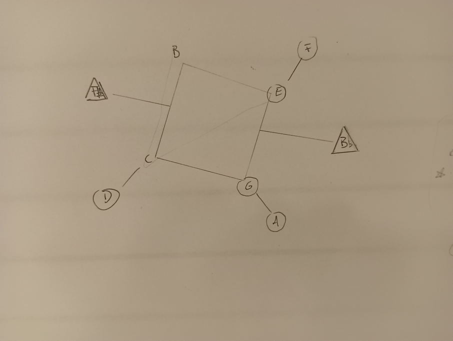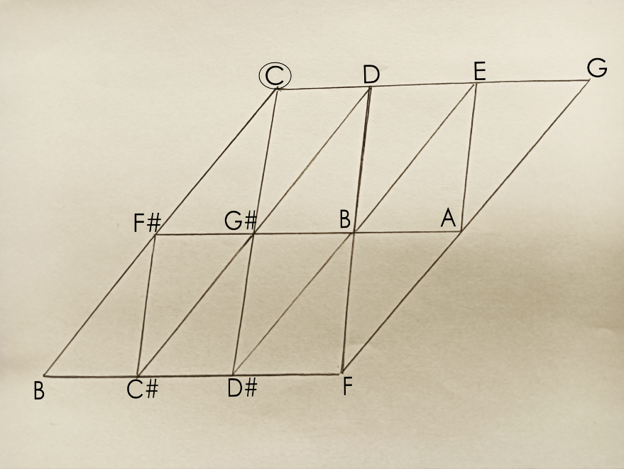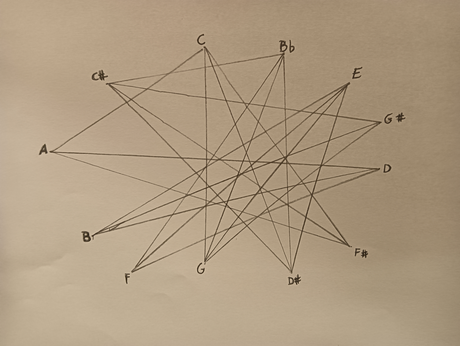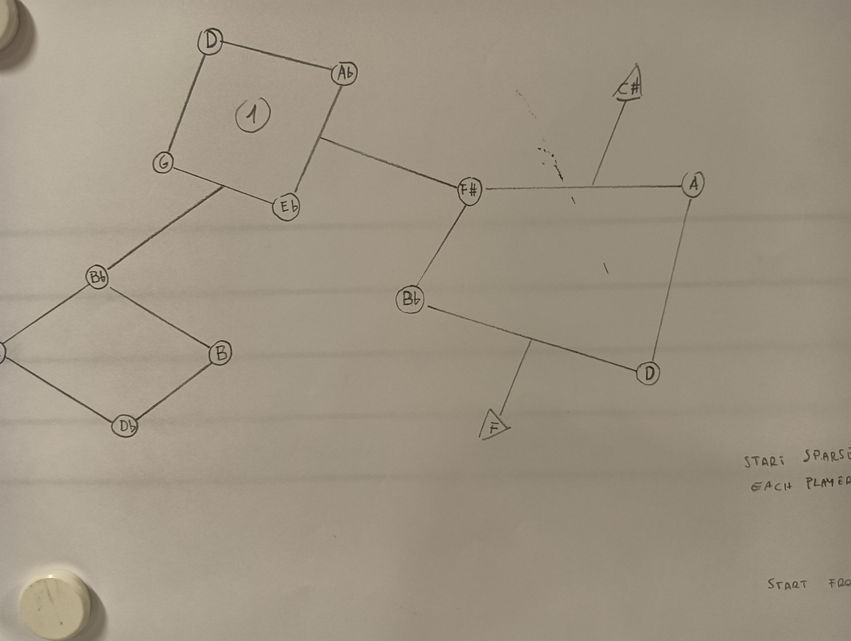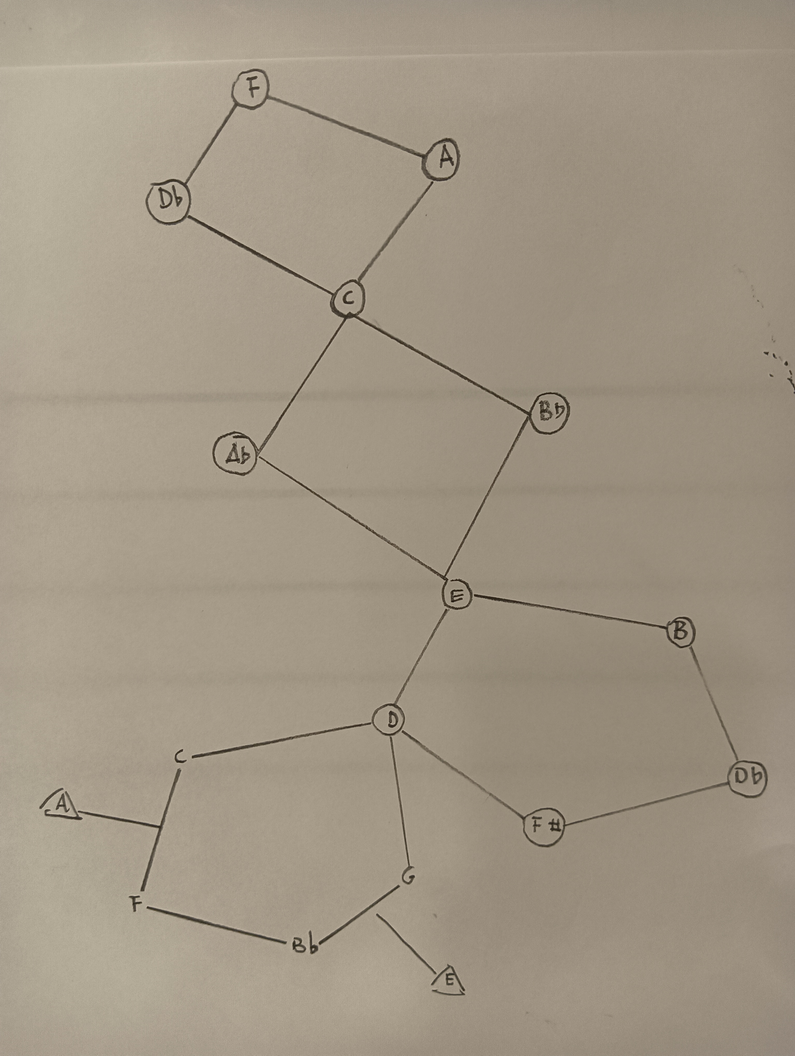 Ex.3_ In the piece "Dodecaphonic Constellation," every instrument begins from a distinct note. Each instrument progresses at its unique pace, following the designated lines, and forging its own musical path. Players have the liberty to take rests during the performance. There are two additional possibilities: 1) "Stuck," indicating the repetition of the same note, which allows other instruments to join in; or 2) "Freeze," signifying a prolonged hold on a single tone, where other instruments can also participate. Through individual decision-making in their musical journey, each instrument contributes to the creation of a random harmonic sequence, forming independent melodic movements and chords.