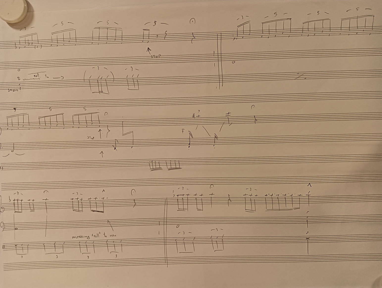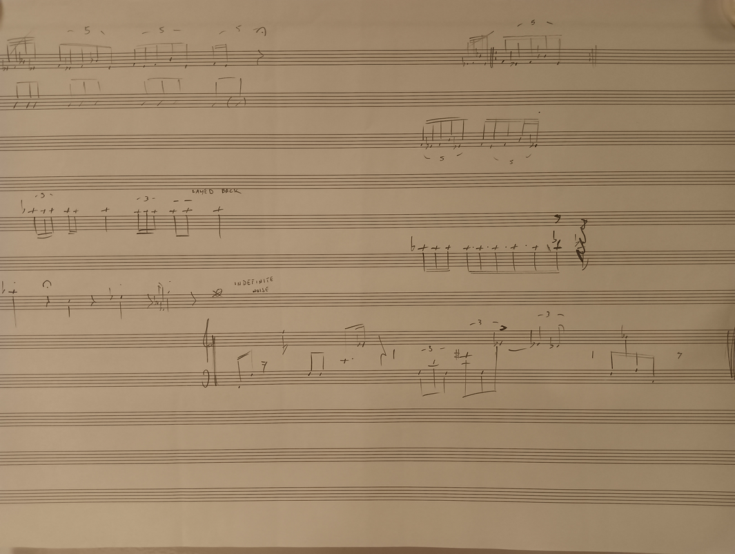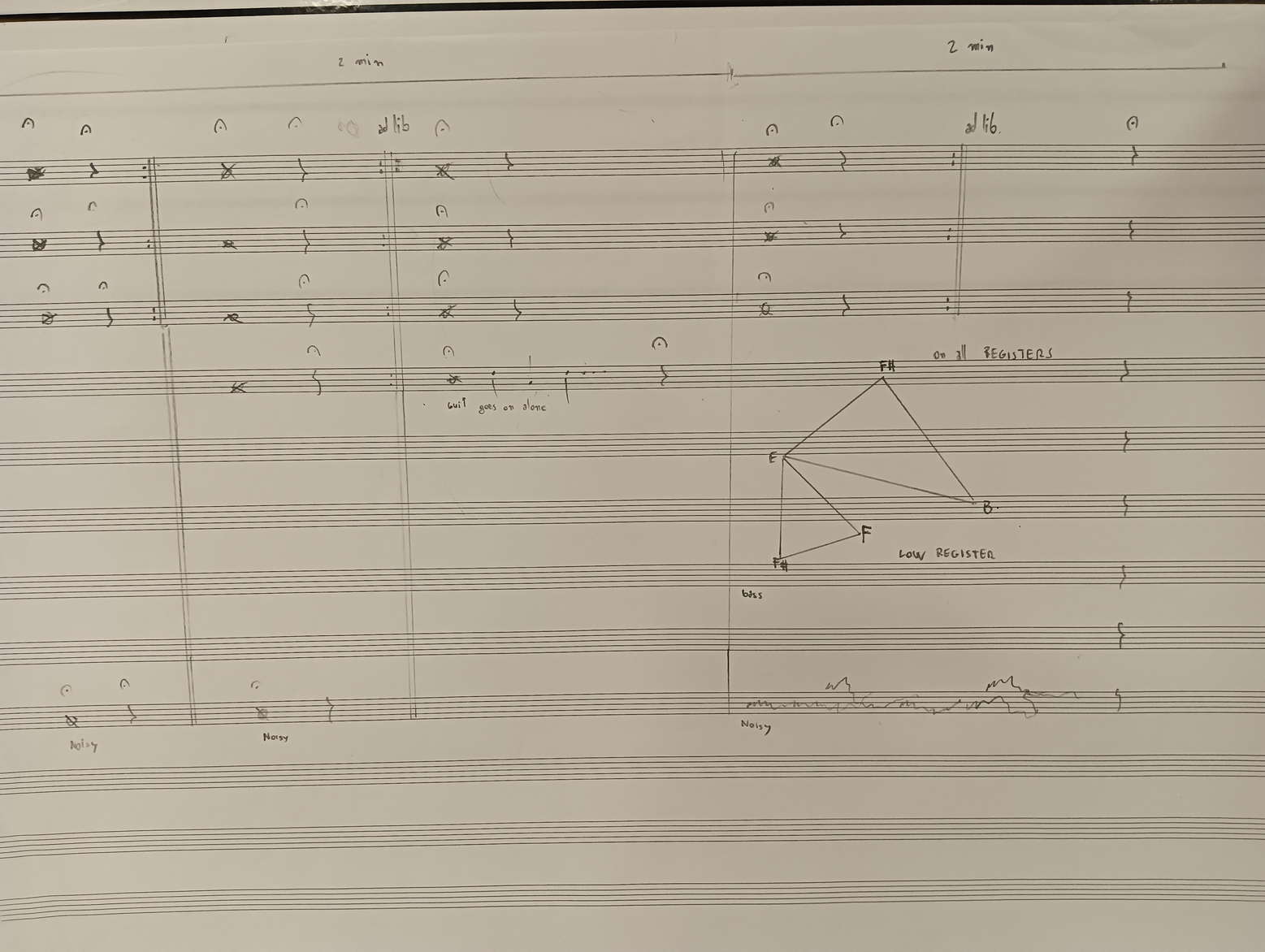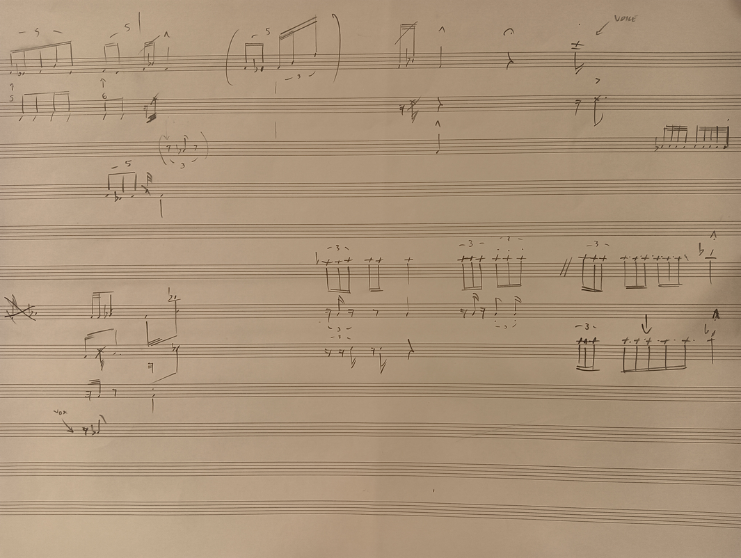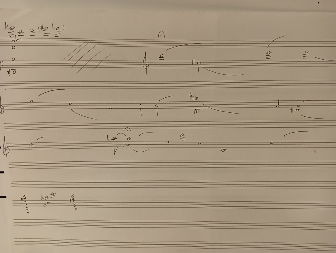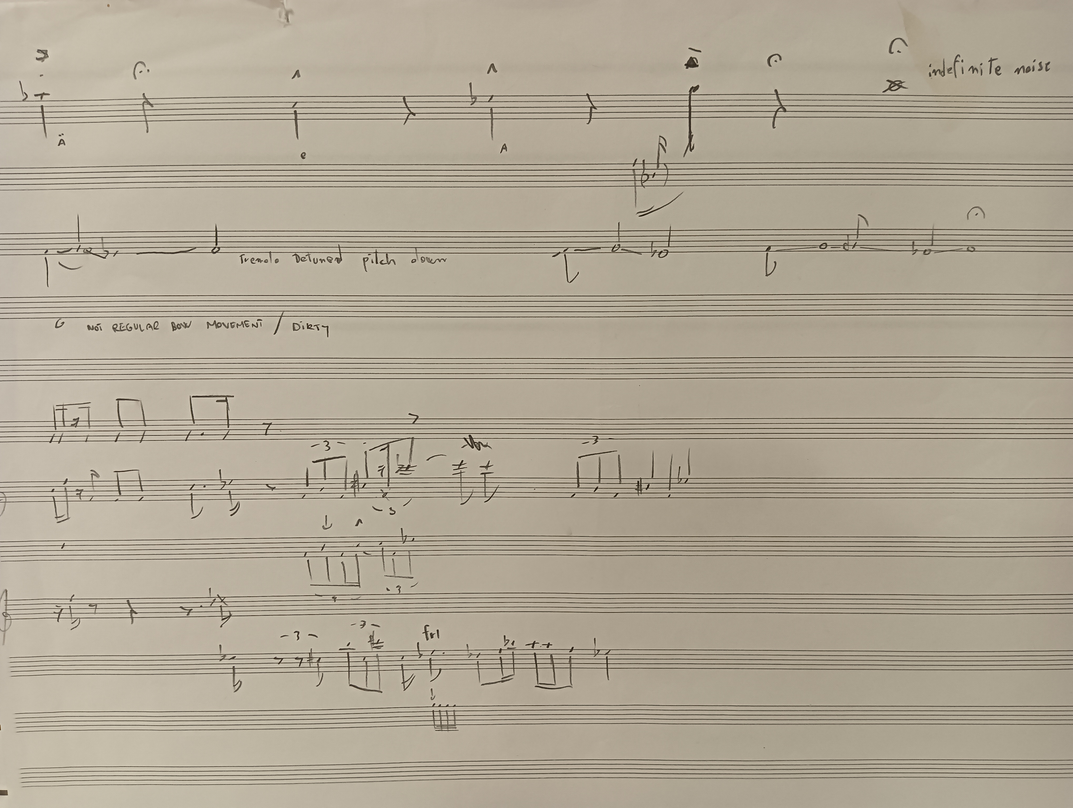 Ex.4_"The past is a black hole" is the result of layered instrumental recordings from Laboratory I. After creating the track, I transcribed it onto paper for the musicians to perform live. As of now, it is the only composition that follows a linear form, showcasing a succession of events occurring at the discretion of the musicians and concluding with a predetermined ending."