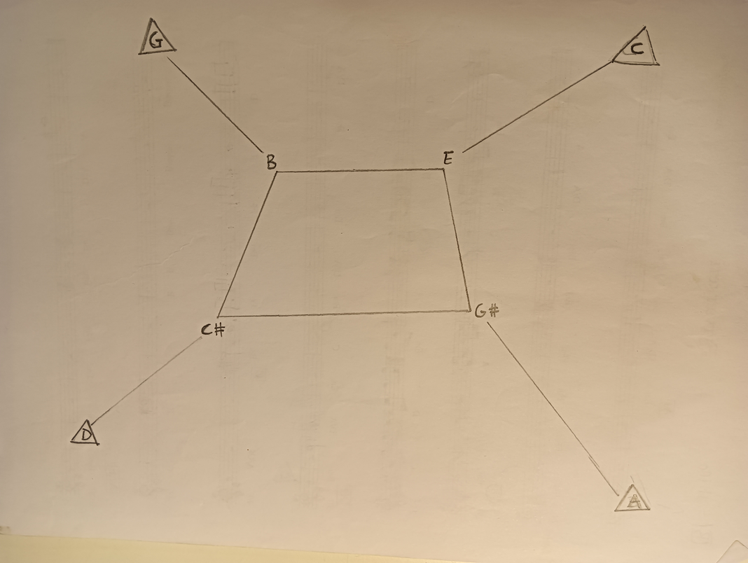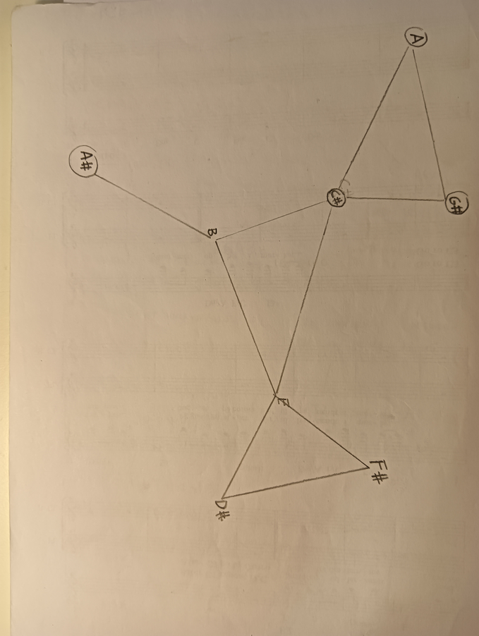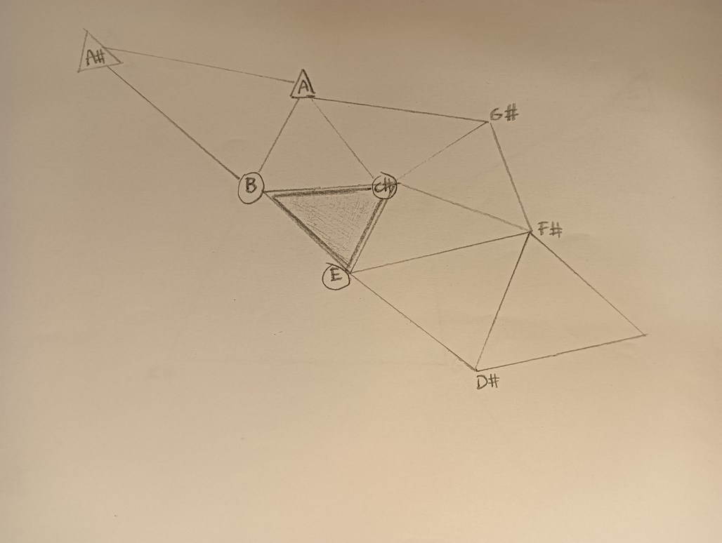 Ex.8_ In "12 Triangles," each instrument commences from Triangle N.1, crafting melodies utilizing the three notes contained within the triangle. Upon the arrival of the next instrument, the ongoing melody transitions to the subsequent triangle. This method gradually unfolds the harmonic spectrum, establishing a framework within which the musicians can generate a diverse musical panorama. During the laboratory session, we proceeded to the second segment of the composition without metronomic guidance. We began executing trills between two chosen notes from Triangles 12 and 11, subsequently expanding this practice to encompass Triangles 10, 9, 8, and 7. The trills were performed continuously, with all players shifting collectively to the next group of notes. Varying the speed of the trill created a new harmonic structure, generating random rhythmic interplay between the different layers, reminiscent of undulating waves.