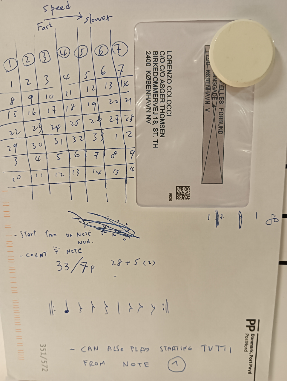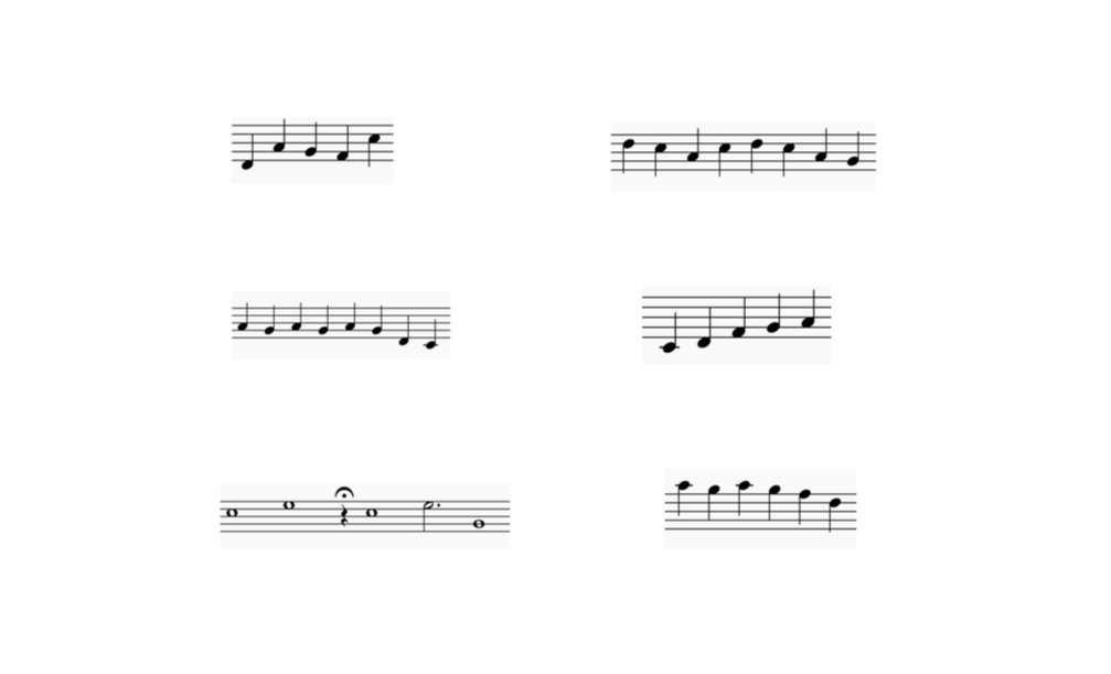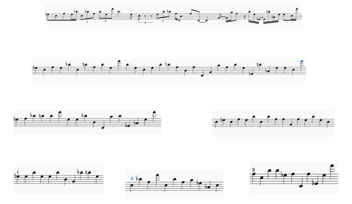 Ex.7_ "33 notes" is a melody I obtained by translating electronic glitches into acoustic notation through "OrchIdea"; The melody can be played in a variety of ways, for example, it can be proposed as a succession of quarter notes, where all musicians start together from the first note, following the melody but only playing the first of 5 tones: as they all have different pulses, the melodies will slowly start to diverge from each other, generating new rhythmic and harmonic structures.