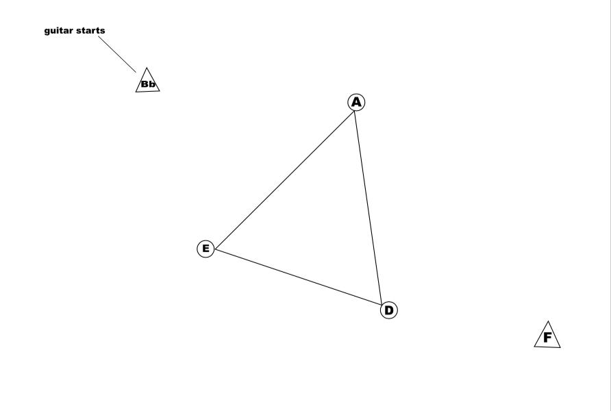 Ex.1_ “The Comet is coming”, is one the first scores I realised, and I am still using today, as it is very simple and clear to explain and usually really effective; Here we have a G minor modal sound, and we can decide the path of the instrument on the constellation; for example, we could have all the instruments 1)starting from the same note, the D in the middle, 2) extend the range (play the note on each register exponentially) 3)add the first coming note “star” in the chosen path (this action is decided by the musicians: when they hear one player changing note, they may follow, adding the next note from the chosen path) 4) the same thing as 3, adding the next tone 5) play the notes in a random order (without enhancing any of them) 6) to cue the end, one of the musicians introduce the “foreign” note/star (F#) 7) all the musicians add the foreign sound to their material 8) slowly take out all the notes from your material, except for the foreign “star” 9) end on a long unison. I would call this kind of composition “static”: when every player is following his different pulse, it sounds like a floating landscape, even though, as we have seen, it is actually possible to draw different ways of movement in the setting so that the composition has a development and a raw structure. But the totality of the material is not changing