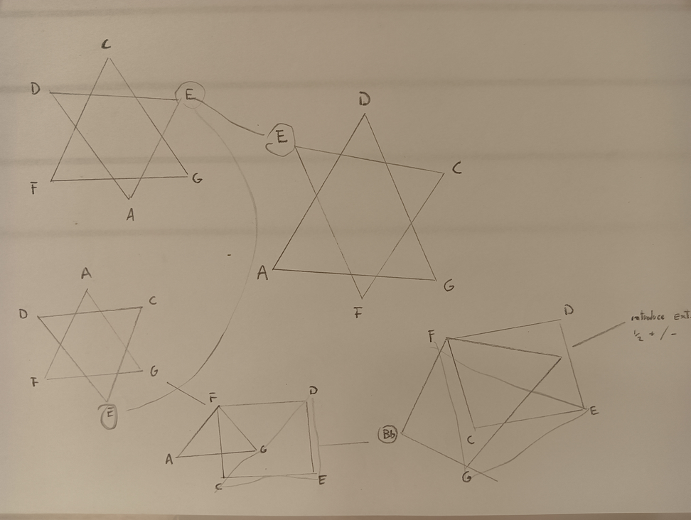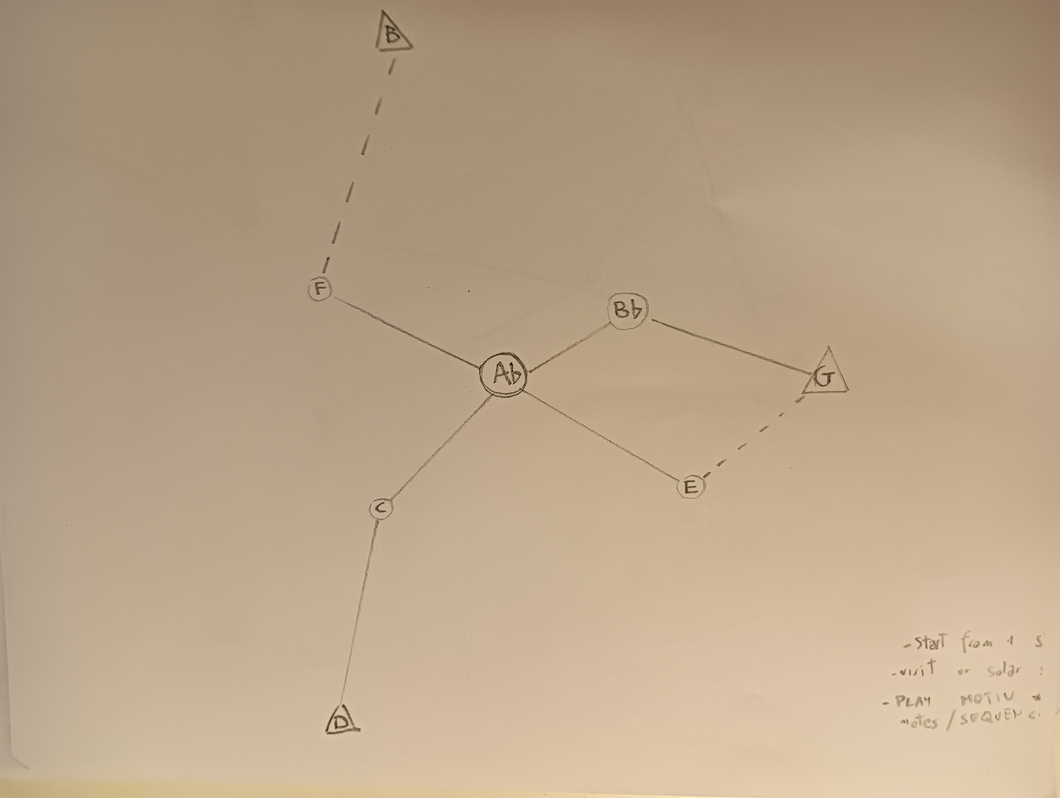 Ex.2_ In the "9 tones system," each instrument primarily executes a dense sequence stemming from a specific note, maintaining continuous repetition. Upon a signal, the players commence navigating the constellation, exploring potential pathways and repeating each note 16 times, thus moving in harmonic and rhythmic blocks. Gradually, the density of the notes decreases over time.