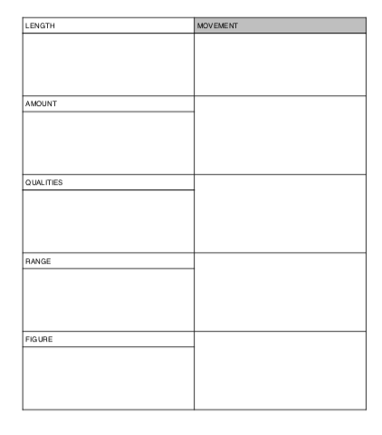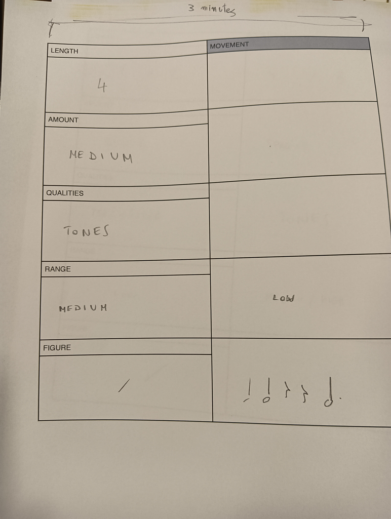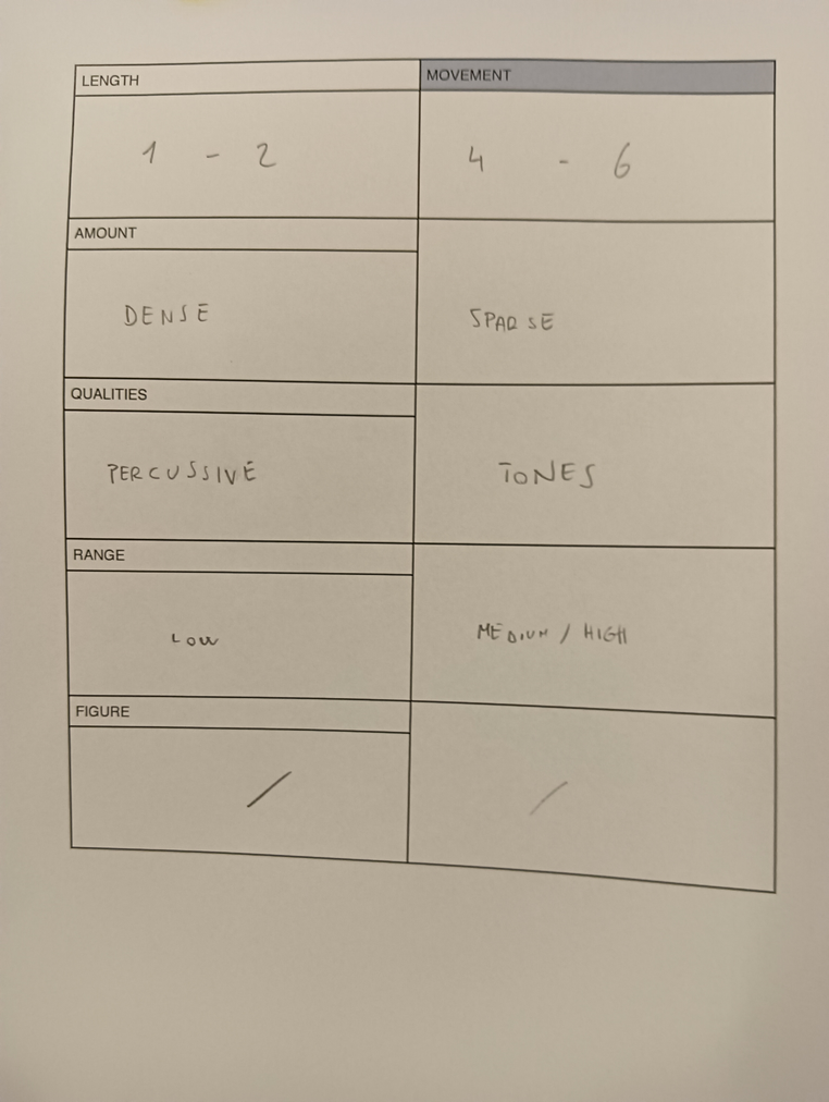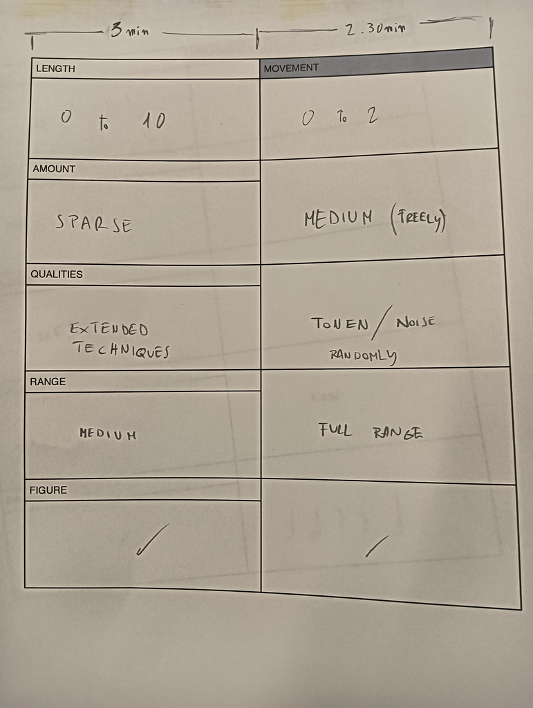 To test and further develop the parameters, I realized blank cards for indications defining the Length of the tones, the Amount, Qualities, Range, and eventual rhythmic figure. In the second row, they indicate the eventual developments in each of the given parameters: the transition can happen suddenly or in a given time lapse; the cards can be applied by all the musicians simultaneously, part of them, or individually. The cards are to be filled by the composer, or by the musicians collectively.