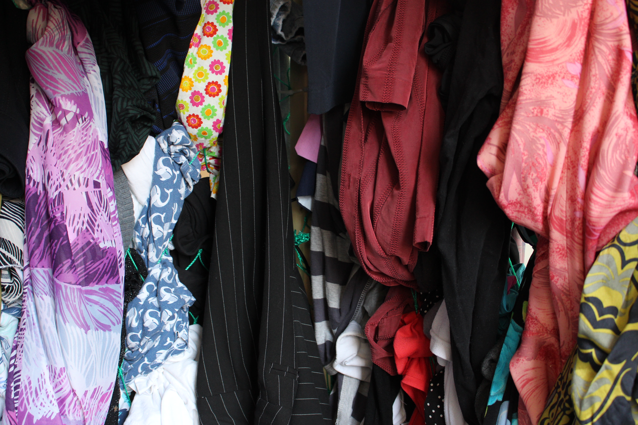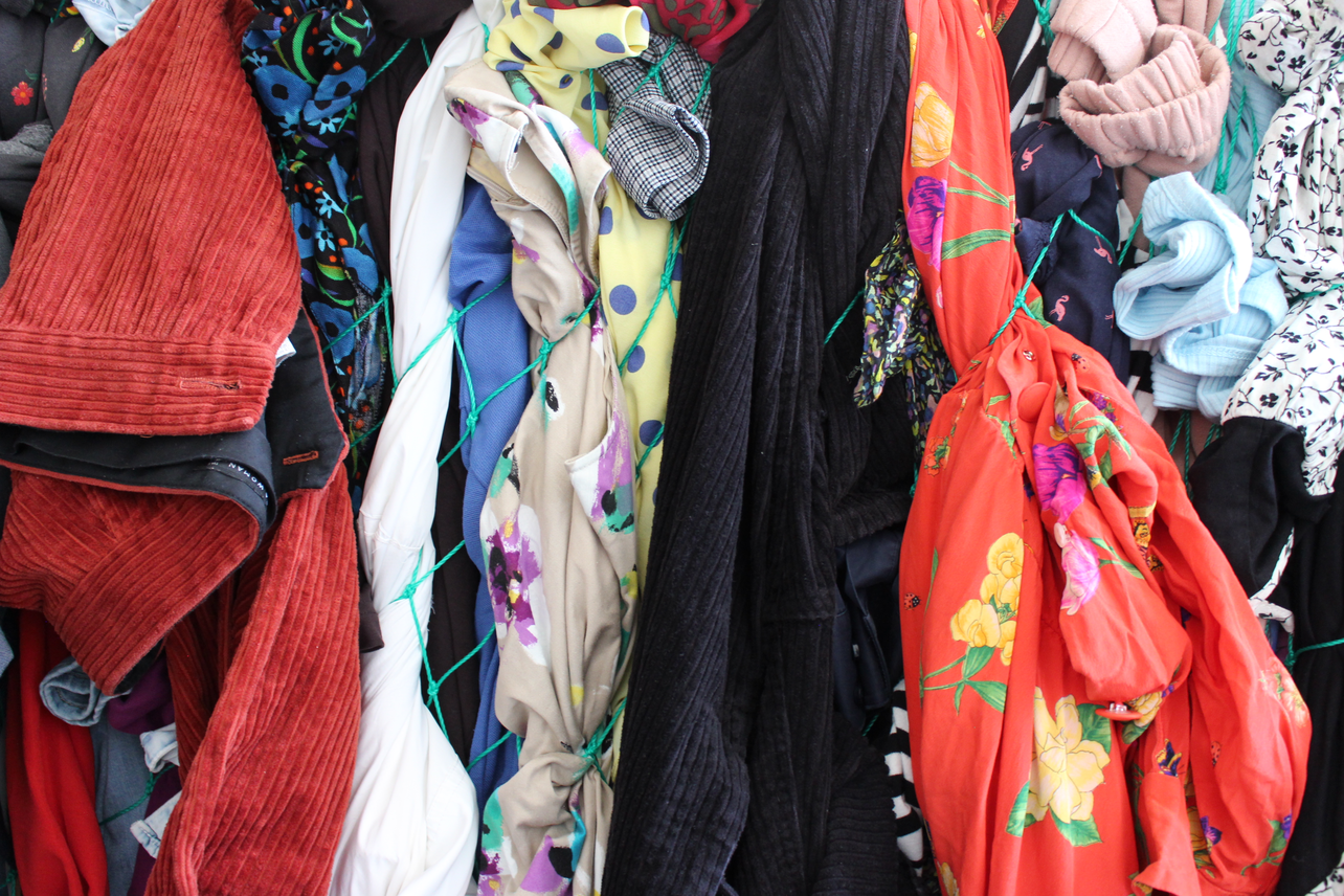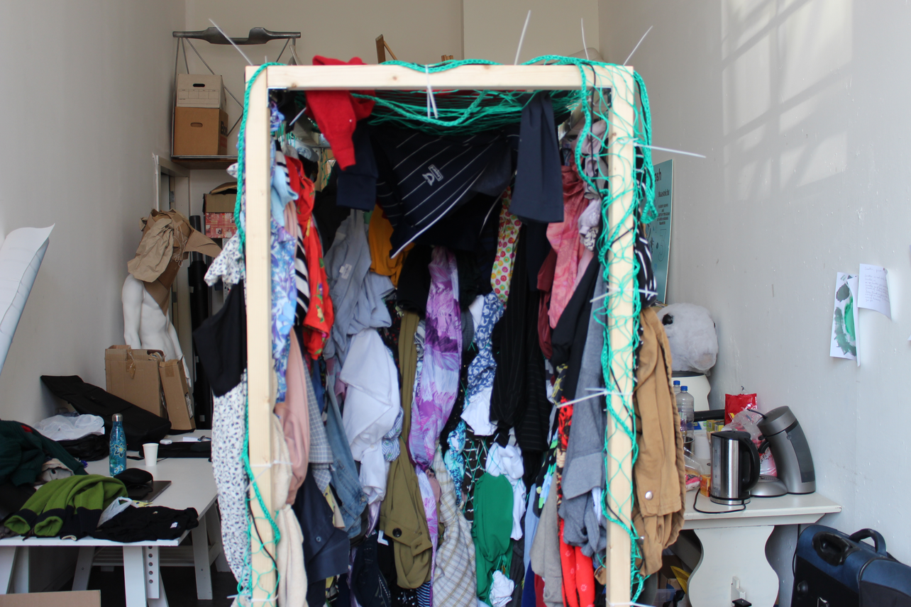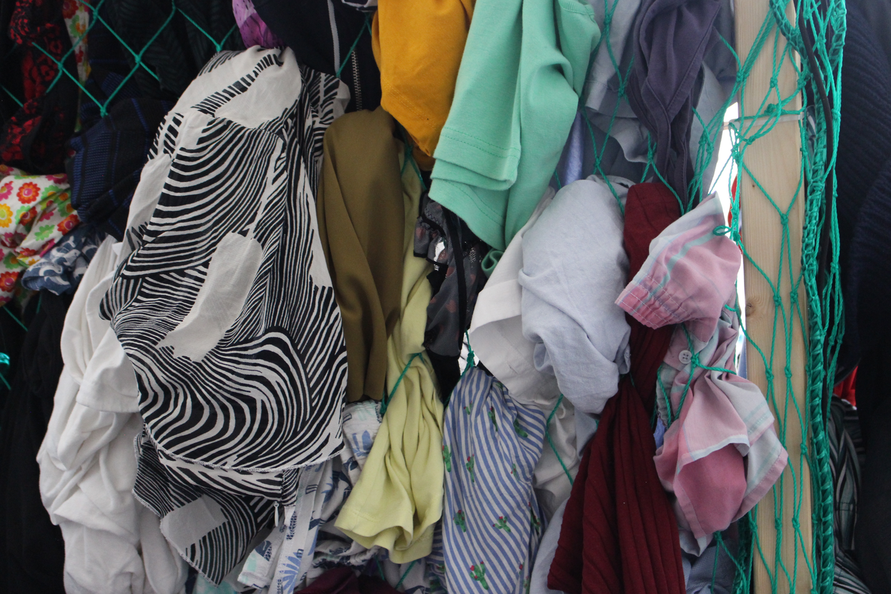 She collected clothes from second-hand shops in Maastricht and displayed it through a net, representing the tossed clothes that can be found snarled in sinner fillet on the coasts of Ghana.