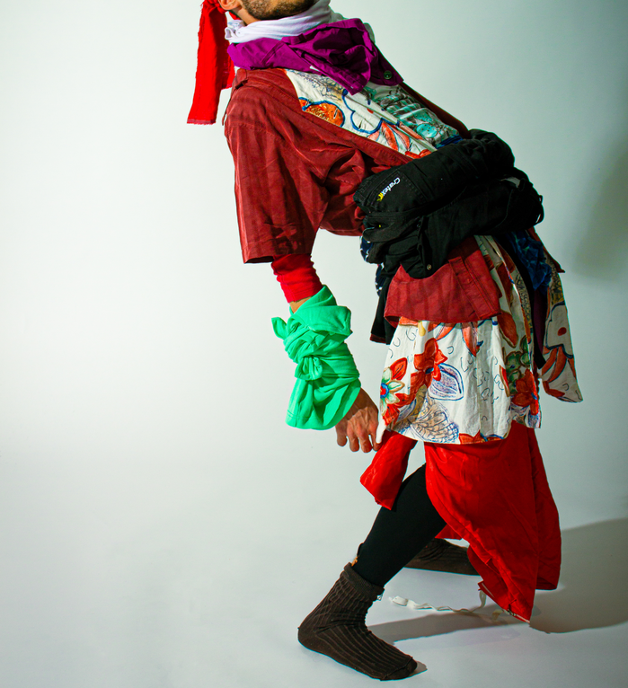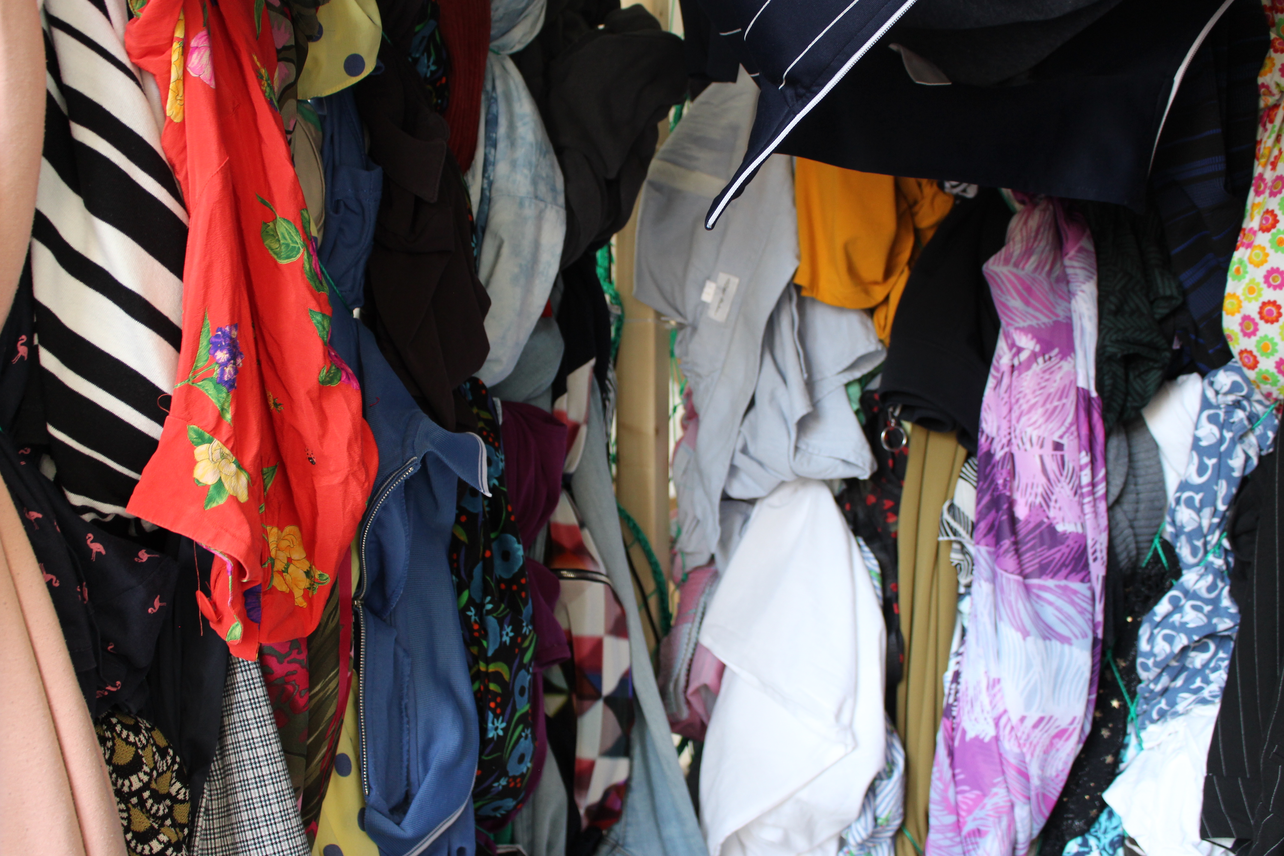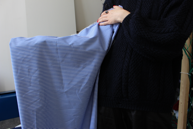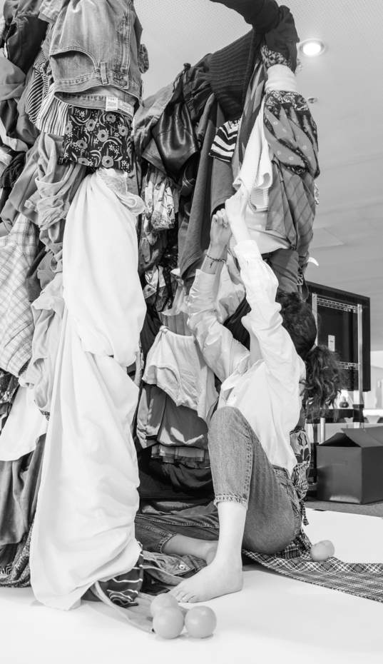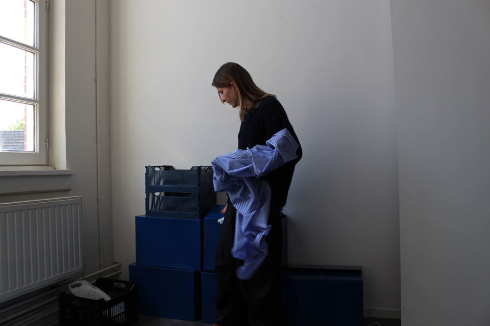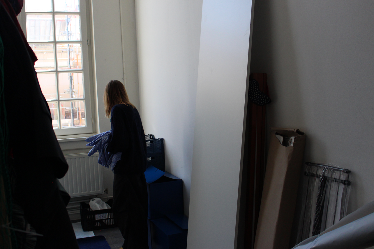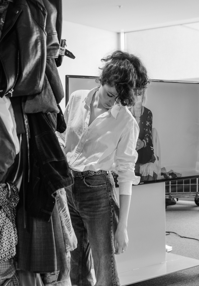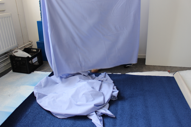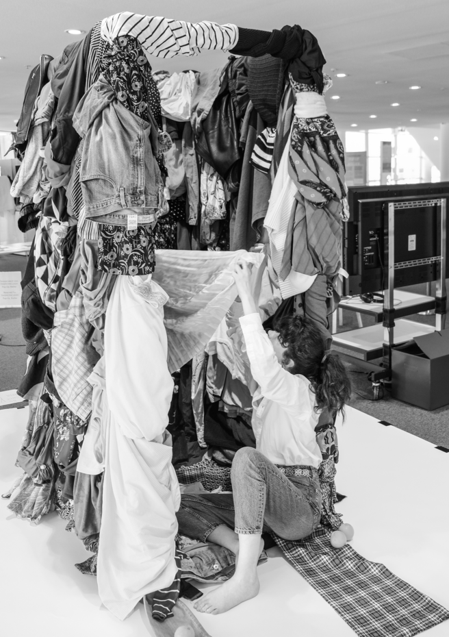 The visual gallery on the right was shooted in the studio where she is currently constructing the main structure of her workshop. It aims to be a fitting room completely covered with clothes. As explained beforehand, participants will be invited to enter the fitting-room and take the time to touch the clothes and to immerse within the clothes, which will potentially engage a reflexion regarding their own relation to it.