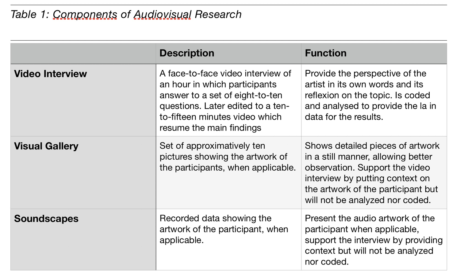 The research methodology being audiovisual research, it will consist of a combination of face-to-face video interviews of a sample of youth population (the participants), a visual gallery of the artwork of such participants to support the interview with still imagery or soundscape depending on the discipline, and an explanatory text to summarise the profile and the main information collected. The final content for analysis will be articulated around the five profiles of participants and their presentations. Afterward, a result section will compile the relevant data acquired with respect to the research questions.
