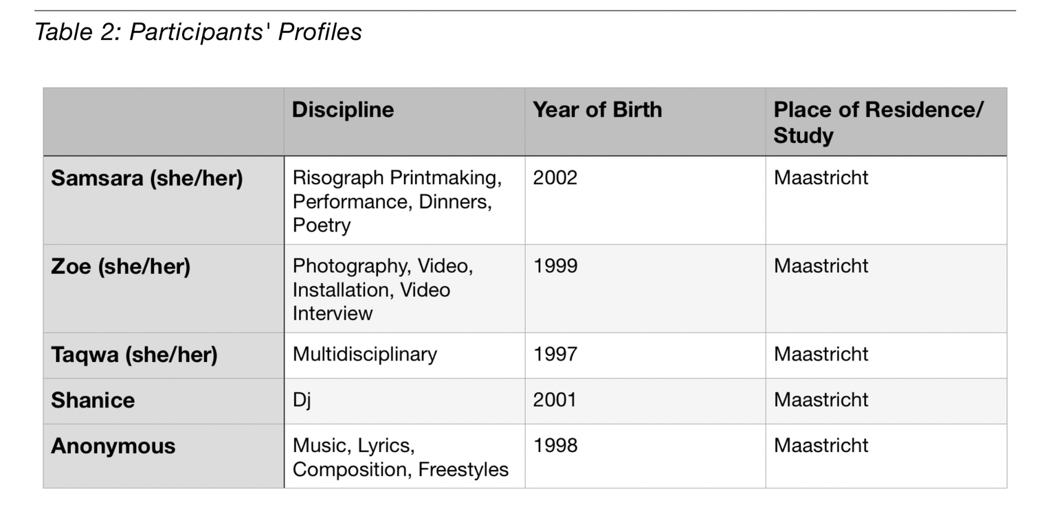 The selection of the participants was based on the three main criteria mentioned in the research questions. The person chosen needs to (i) fit within the target population being a Generation Z artist, (ii) have an artistic activity that is pretty central to its life and hobbies and (iii) be living or studying in Maastricht. The five participants have been recruited on such a basis, and will be presented through their artwork and its meaning to them.