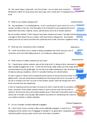 As the final product of my bachelor in Global Studies, I wished to assess the presence of political engagement in the artwork of young artists in Maastricht. To do so, I undertook an audiovisual research combining video interviews, visual galleries and soundscapes as a content for analysis. This exposition is the result of my research and analysis. It resumes my findings into an interactive documentary. Political Participation among youth populations is shaped by its distinctive patterns of actions but remains difficult to properly frame and define. Within the multitude of behaviors that can be observed among this target group, I wish to take a look at a very specific one; Artistic Activism. To do so, I undertook audiovisual research to understand the involvement of Artistic Activism, as a non-institutionalized form of political participation, in the artistic practice of Generation Z artists in Maastricht.