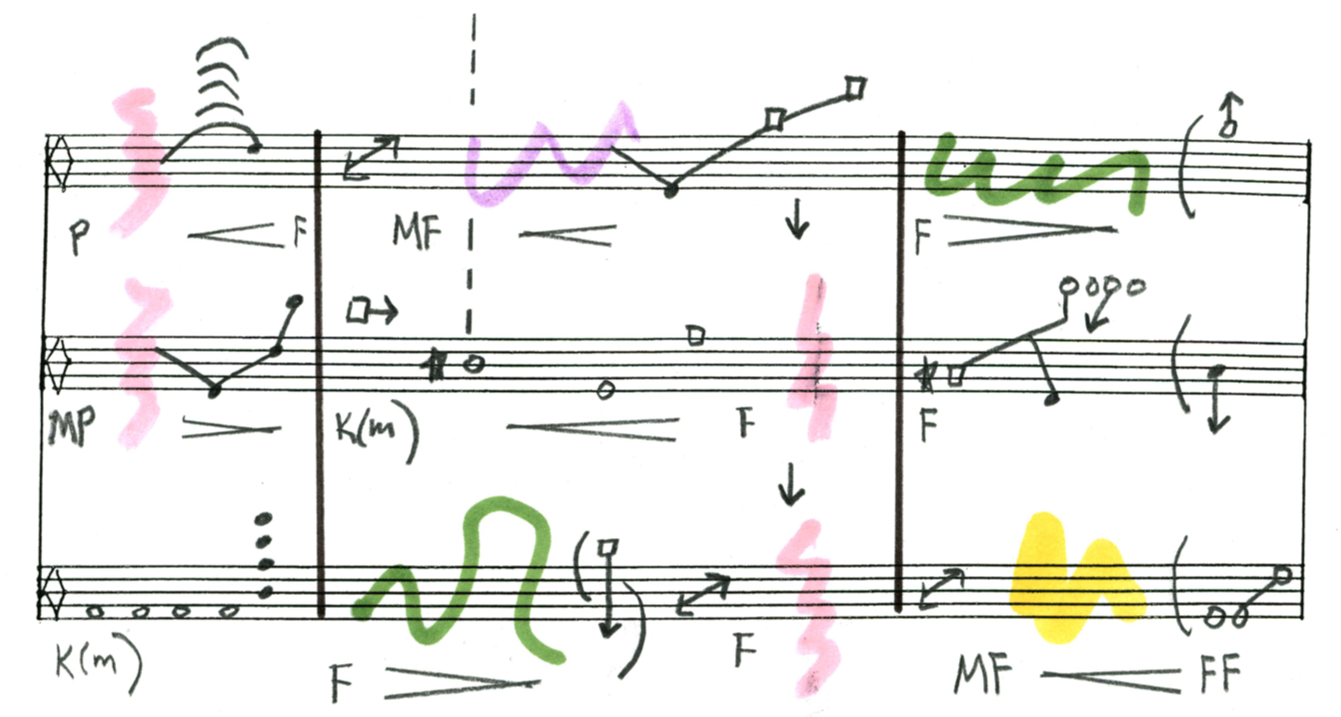 On a basic level, the Synthesis Logics refer to the aspect of intuition and the unknown outcomes when Stable and Mutable Logics are combined or juxtaposed. In a broader sense, this third side of the Tri-Centric Model exemplifies Braxton’s multi-dimensional way of thinking in music, never contenting to fixed definitions and always leaving space for the unknown. The Synthesis Logics are linked to the Ritual & Ceremonial Logics of his music, part of which emphasizes the importance of community and collaboration and the way different musicians with different (social/musical) backgrounds can come together, each shaping the music in their own way to unforeseen results. The discipline for the unknown then also becomes a shared responsibility. The Synthesis Logics in Braxton’s Tri-Centric Model embodies the many social dimensions that are at the heart of his music and which are not written in the scores. They foster a sense of shared purpose and collective identity among musicians, encouraging a spirit of openness, curiosity, and mutual respect. From this point of view, and despite the complexity of Braxton’s theories and scores, the music is actually very accessible for anyone, regardless of musical level or background, willing to engage with it.