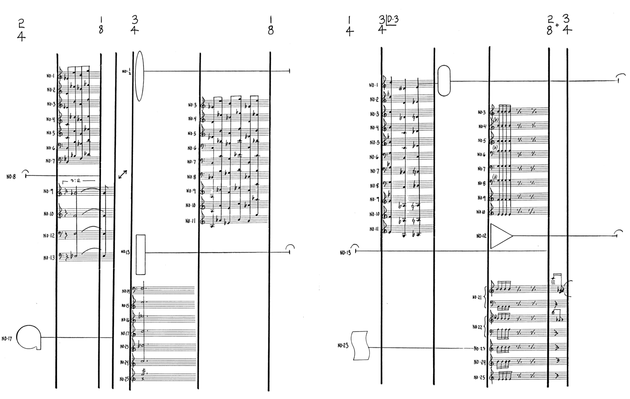 The post Ayler/AACM structural and vibrational dynamics are evident in parts of No. 25 where Braxton employs what he calls 'sound environments,' a kind of collective sonic texture based on his specific verbal instructions. For example, Unit A starts with 'airsounds’, where all performers are asked to blow air through their instruments. In Unit G, Braxton creates a 'sound environment' using 112 bells played by the musicians with the specific instruction to create a static texture without actively trying to control the music. Once these sonic textures are established, Braxton allows room for individual solos and improvisations. It is in this emphasis on texture and the use of small percussion instruments that the influence of the AACM becomes clearly audible.19 At the same time, these static sonic textures are also related to well-known works from the 1960s by European composers like Ligeti (Atmospheres) or Penderecki.20 Braxton's 'sound environments' do not rely on traditional music notation but rather stem from verbal instructions that are, on the one hand, linked to the jazz tradition where oral transmission of information was common, and on the other hand, Braxton documented detailed verbal instructions in his Composition Notes.