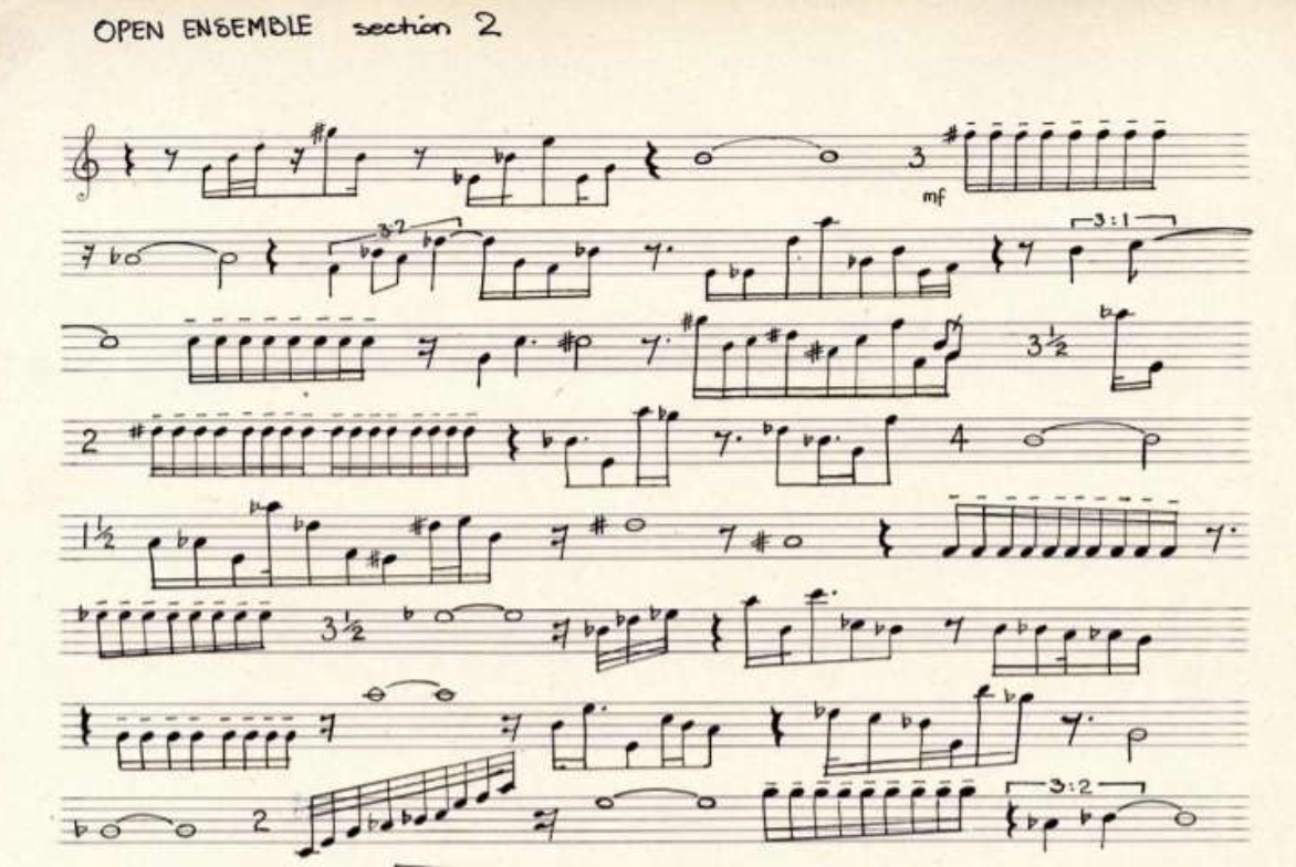 The traditionally notated passages or stable logics in No. 151, like the majority of Braxton's compositions, are remarkably conventional. Braxton does not prescribe any ‘extended techniques’ (multiphonics, key noises, slap tongue, etc.), which are commonly used in post-war Western art music and characteristic of Braxton's own saxophone playing. For Braxton, this belongs to the performer's personal vocabulary, something that the composer doesn't need to specify. As Braxton stated, "Duke Ellington didn't write multiphonics - but his musicians played multiphonics. He didn't have to write them."41 The stable logics in No. 151 are constructed from short motifs or cells that Braxton transforms through repetition and rhythmic variation. He does not rely on traditional harmony but orchestrates the various motifs and cells into clusters. Similar to the typical chord voicings in the works of Morton Feldman, Braxton plays with density and openness in the orchestral sound by spreading the clusters across multiple octaves and then reducing them. Interwoven within this orchestral texture are the different open and improvised passages, blurring the distinction between stable and mutable logics.