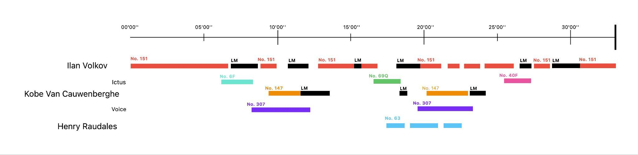 The performance in Bruges was filmed, and based on the footage, I made a detailed analysis of the full performance (see fig. d). For the first six minutes of the performance, Volkov conducted No. 151. I then cued in the Ictus players to start No. 6F. Shortly after that, Volkov switched to LM with the rest of the orchestra. When No. 6F wound down at around 08’15’’, the solo voice part from No. 307 emerged, and Volkov brought part of the orchestra back into No. 151. At 09’30’’, I started conducting No. 147; Volkov paused No. 151 while the vocal line continued for a few minutes more. Just before 11’, Volkov started giving LM cues again. Shortly after this, I moved from No. 147 into LM as well. After a brief pause, Volkov picked up No. 151, bringing back the full orchestra as soon as I stopped cueing LM. Apart from a brief LM interruption, the orchestra remained in No. 151 with Volkov until I brought in Ictus again at 16’45’’ with No. 69Q. Volkov paused as we moved into the densest part of the performance when, at 17’35’’, the 3rd conductor Raudales started conducting No. 63, which he continued with two brief pauses until 22’33’’. While Raudales conducted, the Ictus musicians moved from No. 69Q into LM, and Volkov also started giving LM cues. The singer picked up the vocal line from No. 307 again, and at the same time, Volkov started conducting No. 151, while I brought in No. 147. From here on, Volkov mostly stayed with No. 151, but with short breaks to leave space for the other material to emerge. The density reduced when I ended No. 147 shortly after Raudales stopped No. 63, but I then continued briefly with LM. I brought in the Ictus musicians one last time, now with No. 40F, a little after 25’ while Volkov went back to LM. For the last five minutes of the performance, the full orchestra returned to Volkov, who alternated No. 151 with a brief LM section and finally ended the performance in No. 151.