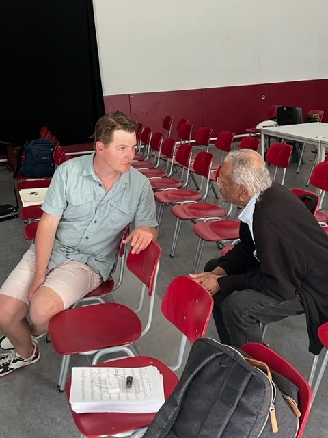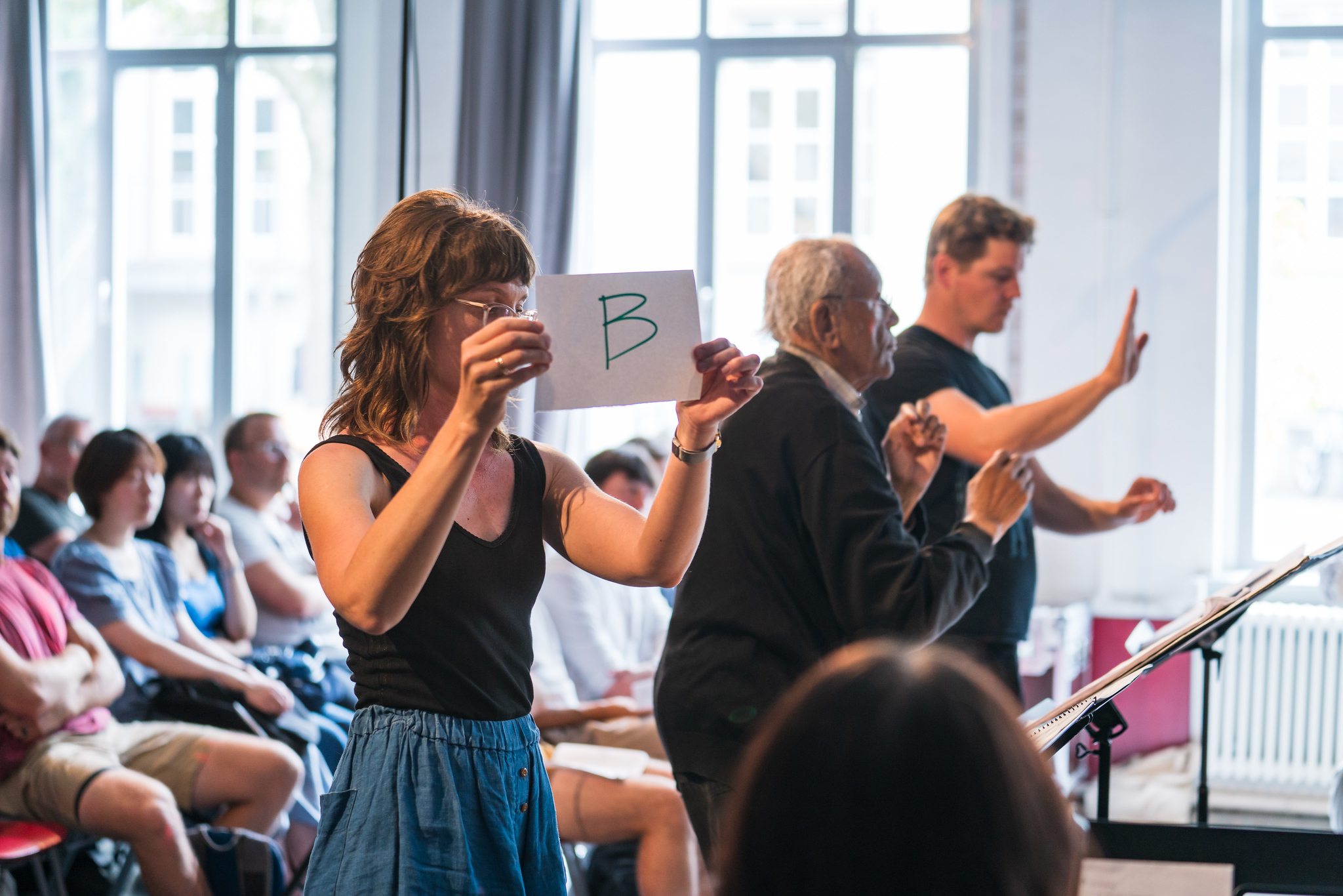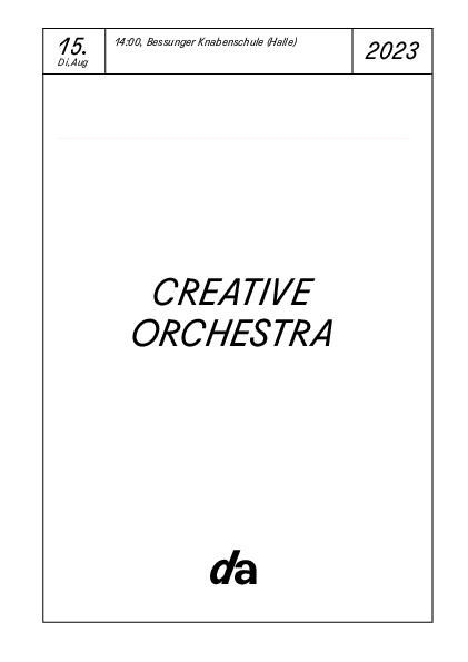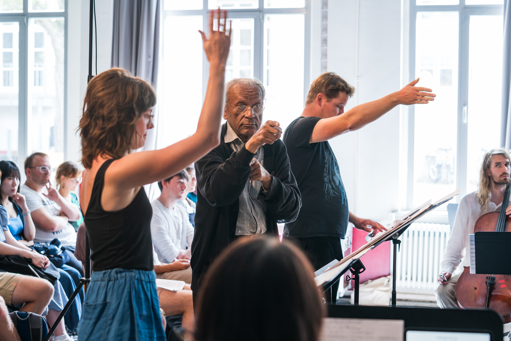 In August 2023, Anthony Braxton was invited as one of the central guests of the International Summer Course for New Music in Darmstadt, Germany. This bi-annual festival has been historically very influential for the development of post-war Western art music and still today is considered one of the most important gatherings of the international new music community. Anthony Braxton’s extensive body of work has existed largely outside the official discourse and historical canon of Western Art Music. His presence at the Darmstadt Summer Course was an important statement to give his life’s work the attention it deserves. Several performances around his work were planned, as well as a two-day international conference which I co-curated with Prof. Timo Hoyer.11 After my experience performing Creative Orchestra music with the students of the RCA, I suggested to festival director Thomas Schaeffer the idea of organizing a workshop around Braxton’s Creative Orchestra for participants of the Summer Course. He gladly accepted, and in turn, suggested I would co-lead the workshop together with Braxton himself. We decided on a four-day workshop with 3-hour sessions on each day from August 11 to 14, followed by a public performance on August 15.