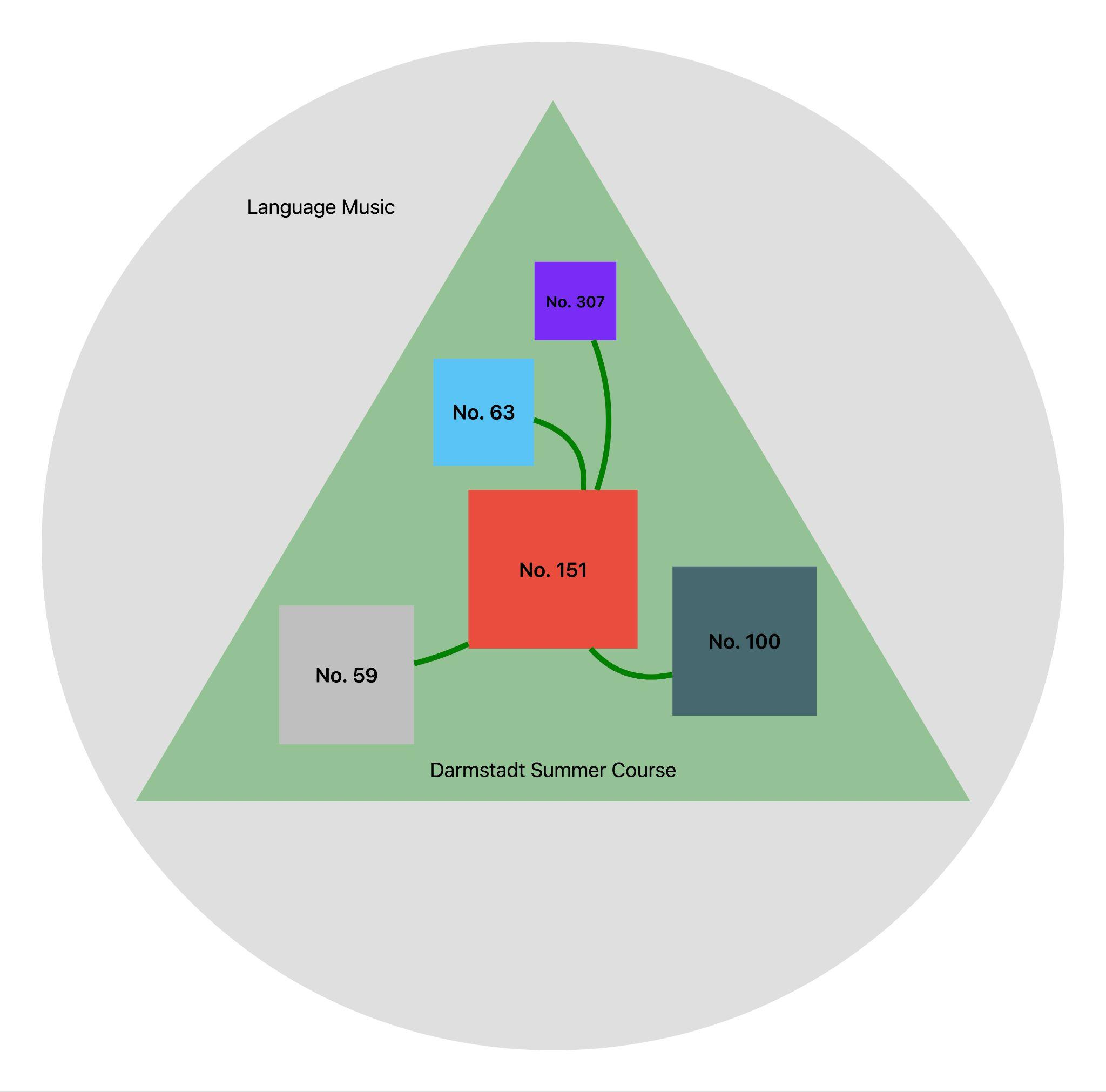 The workshop was open to all participants of the summer course who could apply through a call published by the festival. There was a total of 33 participants, coming from different parts of the world and mostly with backgrounds in classical/contemporary music (click the program booklet on the for more details).The instrumentation was left open, and as there was a significant string and wind section, the overall instrumentation of this Creative Orchestra came much closer to a classical orchestra than a big band. Carl Testa from the Tri-Centric Foundation had provided me with several possible compositions to use for the workshop. I made a selection of scores and, when in Darmstadt, I sat down with Braxton to decide which pieces to use for the workshop. I suggested Composition No. 151, an extensive piece for a creative orchestra of 25 players, as our central composition or “primary territory” for the workshop.12 I also selected Composition No. 63 (for two soloists and chamber orchestra) and the compositions I had done previously with RCA (Compositions No. 56, No. 58, and No. 59). Braxton accepted my suggestion of Composition No. 151 and Composition No. 63. He then added Composition No. 100 (for 15 instrumentalists) and kept Composition No. 59.13 Since there was a vocalist in the orchestra, I also added the solo-voice line of Composition No. 307 (for soprano and orchestra).14