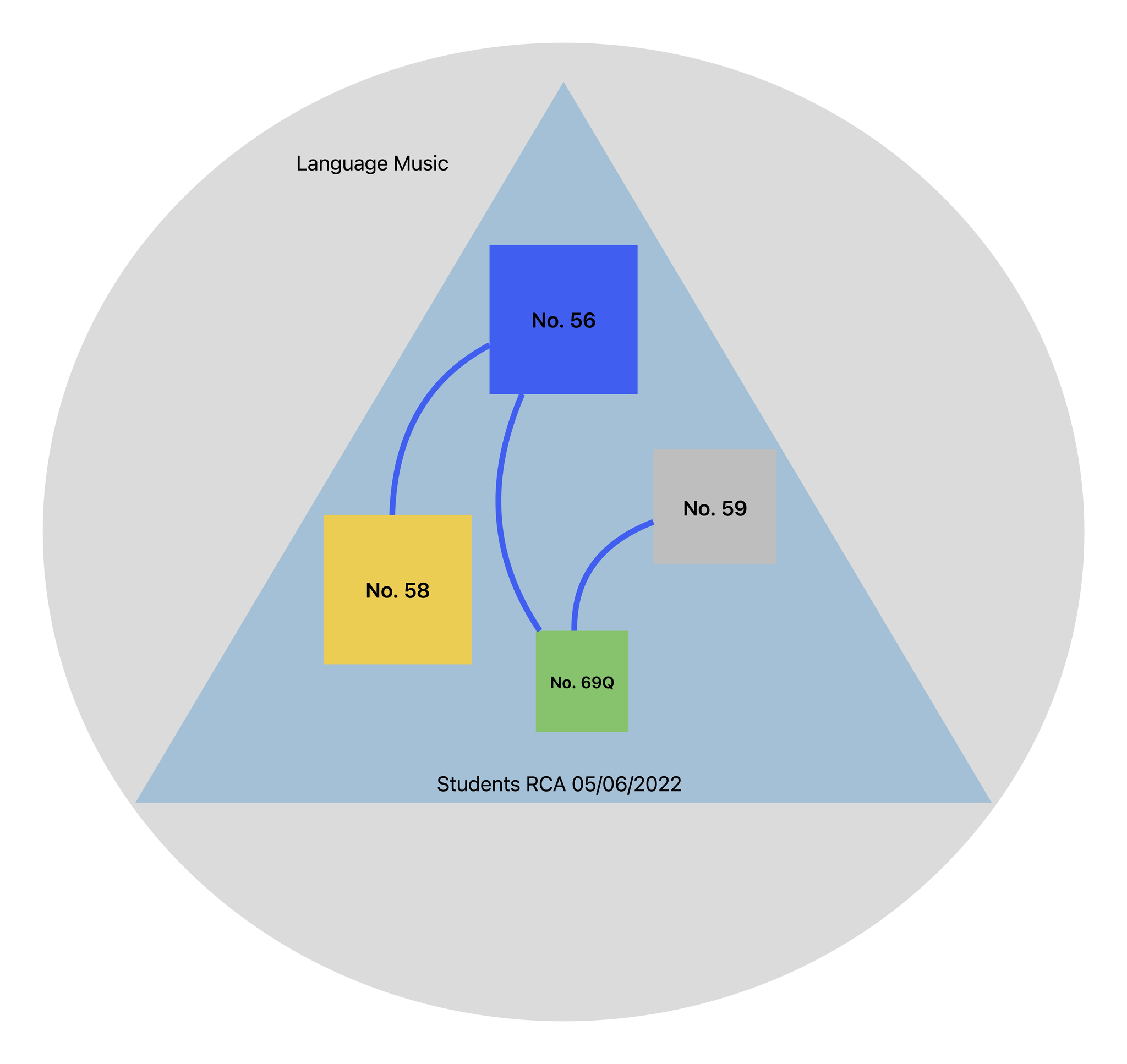 I was aware of Braxton's holistic Tri-Centric philosophy, where he encourages musicians to try and connect the different compositions. I decided to apply what Braxton calls "coordinate music" for our eventual performance. This is a process where the different compositions are performed separately but connected through improvisation into a continuous suite, using LM to ‘glue’ the pieces together.9 So in practice, when we played the compositions, my role was that of a traditional conductor, keeping time. But, instead of ending each composition, we transitioned from one composition to the next through collective improvisations using the Language Music system.