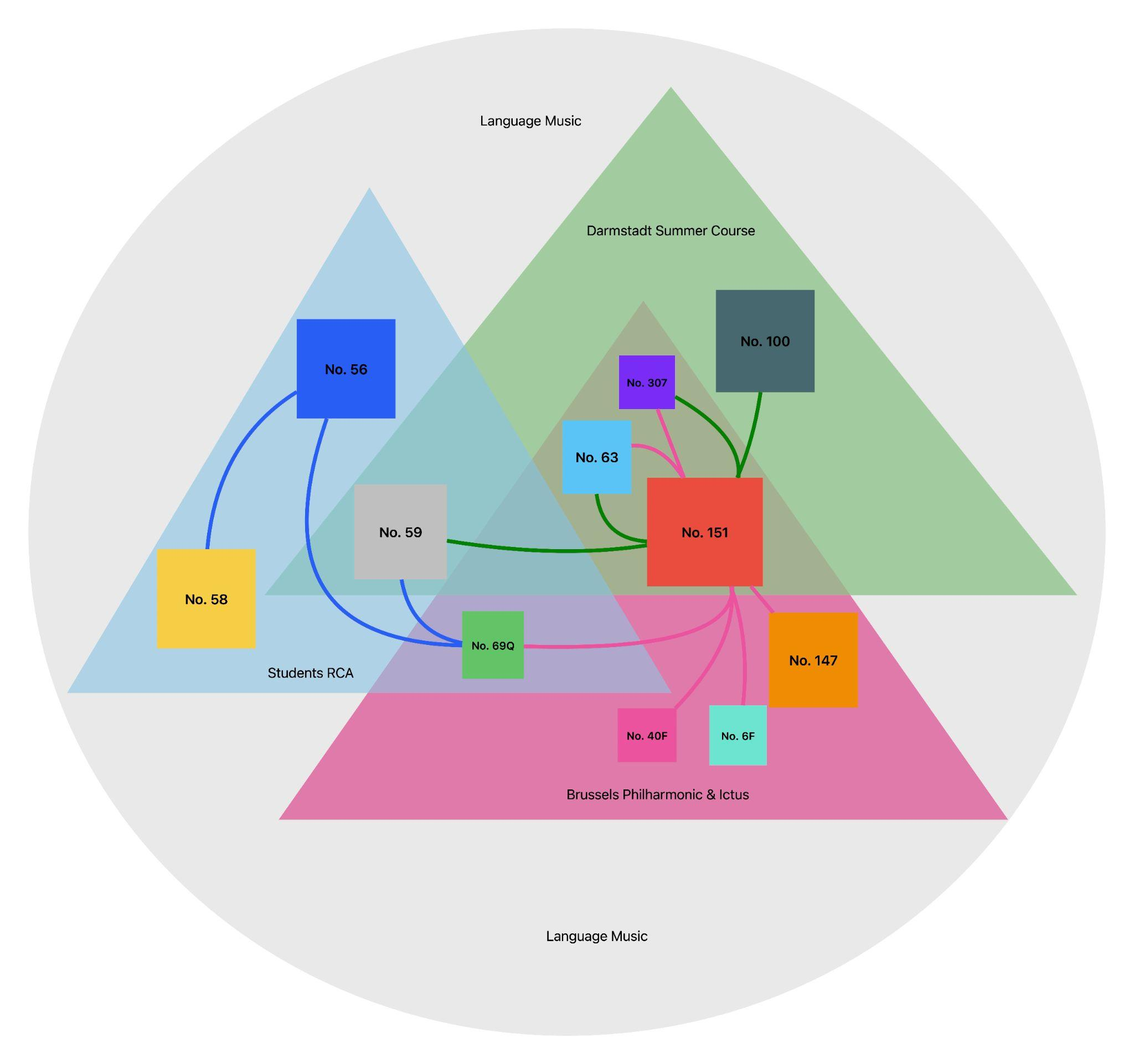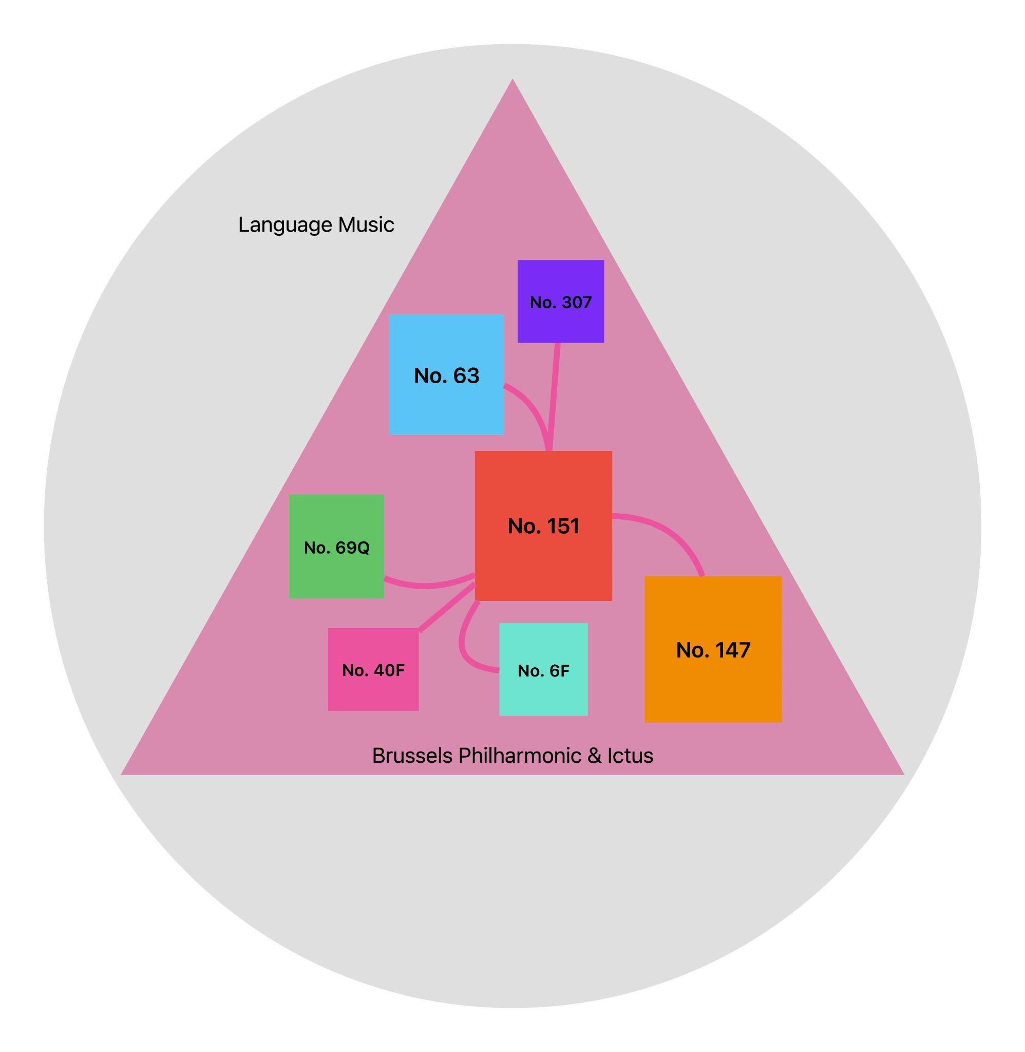 When comparing the (audio-only) recording from Antwerp to the version from Bruges, performed one day earlier, it clearly shows how vastly different both performances were in terms of their development because of the multi-layered and multi-hierarchical possibilities of Braxton’s music and the many choices that are made on the spot by the conductors and the individual players. Feedback from musicians and audience members who attended both performances often favored the performance in Bruges, citing its heightened energy and musical intensity. This is maybe due to the fact that it was the first performance, and everybody was a bit more ‘on edge’. The difference in acoustics between both venues also might have played a role in how it was perceived. I personally experienced the second performance as having more musical depth, I felt the orchestra was listening more attentively while navigating the material, which made it texturally richer. We kept the same compositions and overall structure for both performances, so even though in a linear representation the blocks would likely shift around quite a bit, a general "Tri-Centric map" of both performances still looks the same (see fig. e).