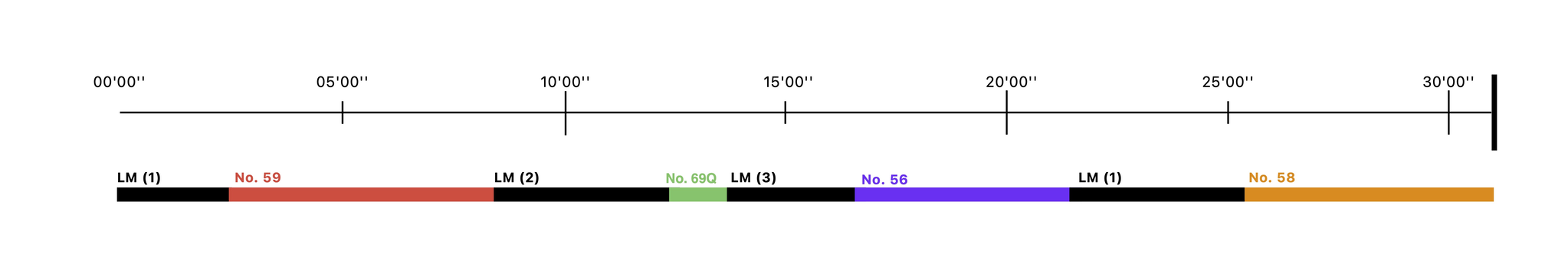The performance on June 5th, 2022 started with a short section of LM (1st procedure) and then at 02’39’’, went into No. 59. This lasted for about 6 minutes, after which we went back to a longer stretch of LM, this time exploring the 2nd procedure. At 12’21’’, we jumped into No. 69Q, which only lasted for a little more than two minutes and was immediately followed by another stretch of LM. This time we applied the 3rd procedure where I briefly left the stage, and the section leaders in the orchestra took over the role of cueing. This took us past the first half of the performance as I returned to the stage and brought the orchestra into the slow-paced sonic textures of No. 56 at 16’38’’. At 21’20’’, we went back to the last stretch of LM (1st procedure) where I guided the orchestra to the grand finale of the set at 25’15’’ with the exciting march of No. 58, which lasted about 8’. The last note of No. 58 also marked the end of the performance.
