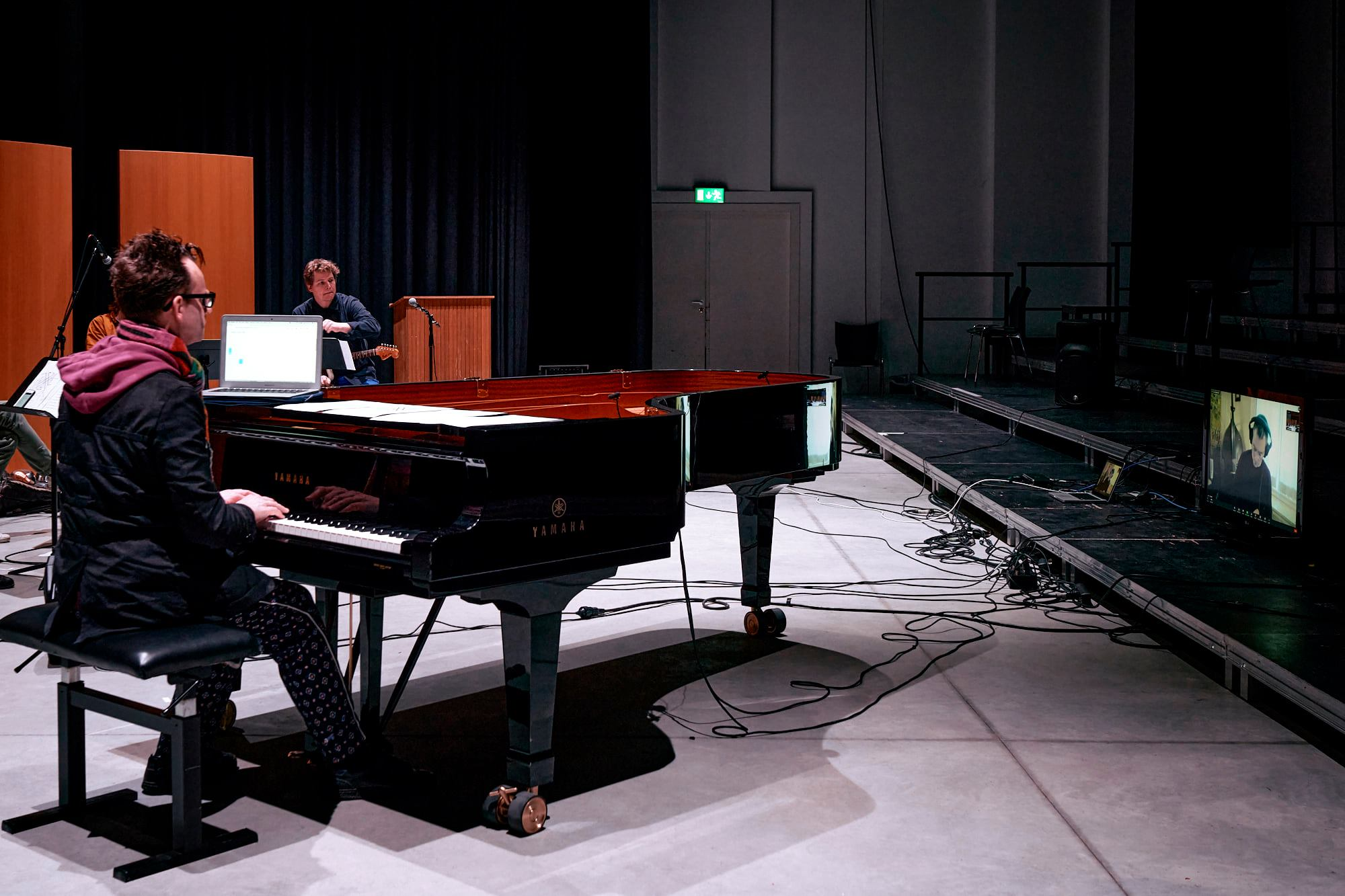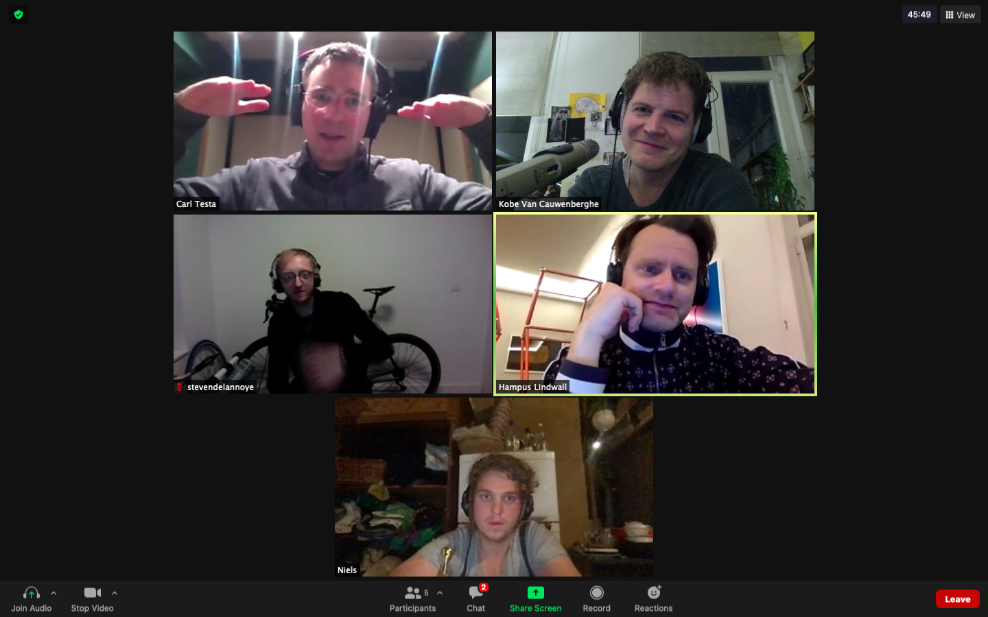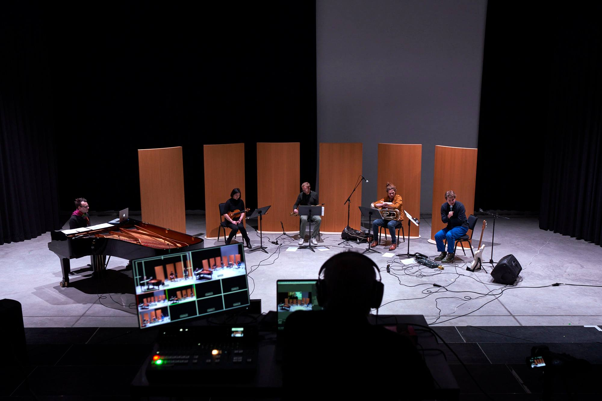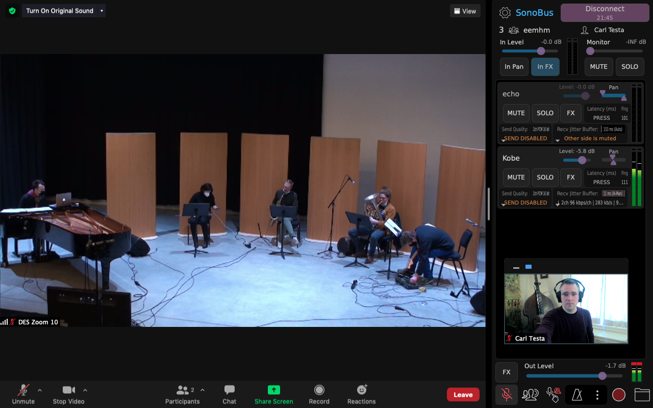 Carl and I started with a few test sessions in October 2020 to check if the software worked, and if the EEMHM sound collage and my live-playing could travel back and forth between New Haven and Brussels without too much trouble. We used JackTrip and SonoBus software to have high quality sound with minimal latency, with Carl controlling the collage and me playing guitar. It immediately worked really well. Unfortunately the planned public performance in November in Antwerp was canceled due to a second wave of Covid-19 infections in Belgium, but since the system was functioning between Carl and myself, we decided to continue more online test sessions, with musicians joining in from our homes in Brussels, Antwerp and New Haven. This proved to be a little more complicated, but we did manage to play a first version of Composition 381 where five players were virtually connected, playing music together. Then, on February 1, we got a second chance to do an actual public performance via live-stream at the conservatory in Antwerp. For this version, we were five musicians playing live in Antwerp with Carl giving conducting cues from his home in New Haven, and all of us connected to the EEMHM web-based controller, sending sound via a server in Amsterdam.