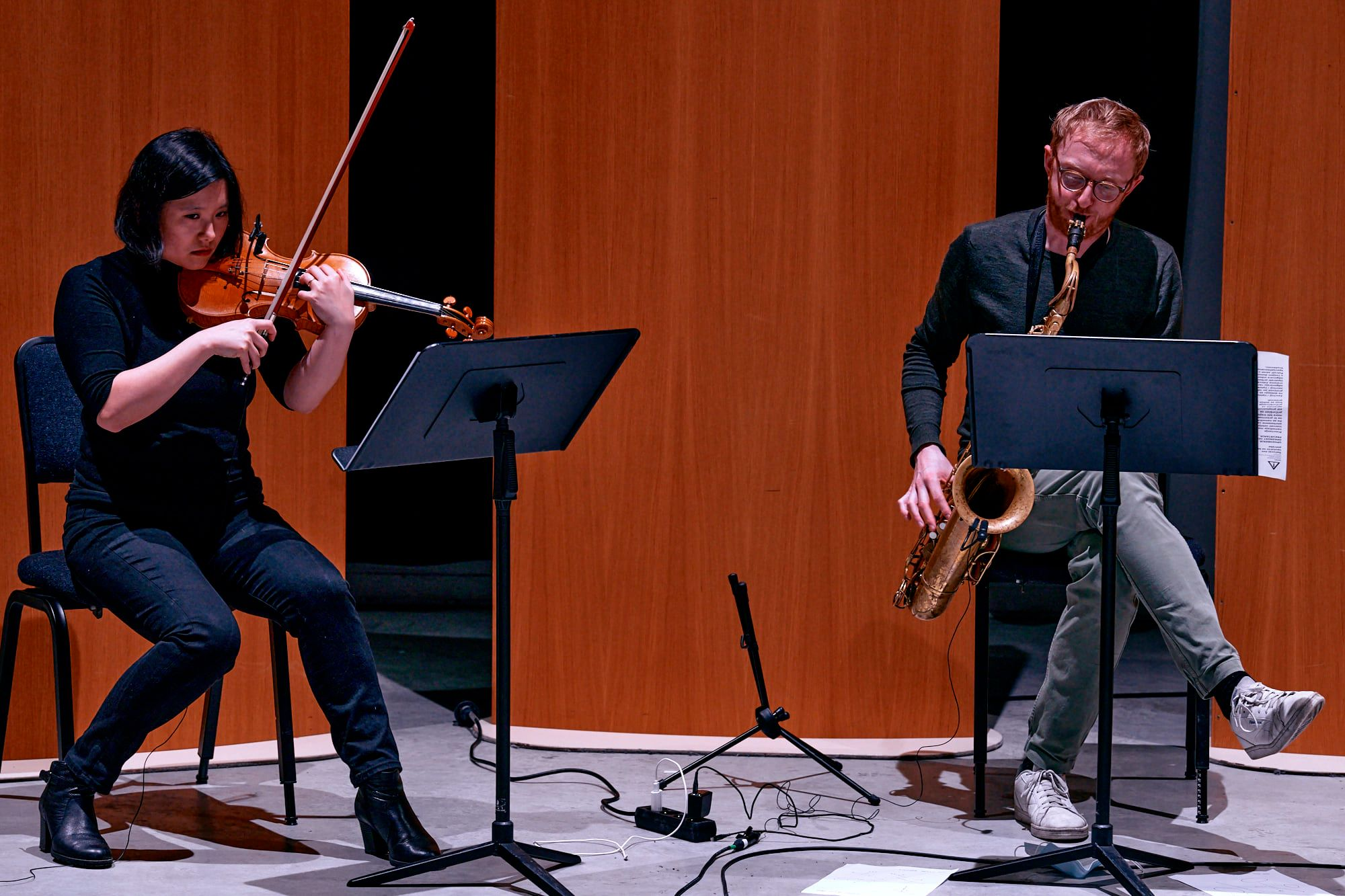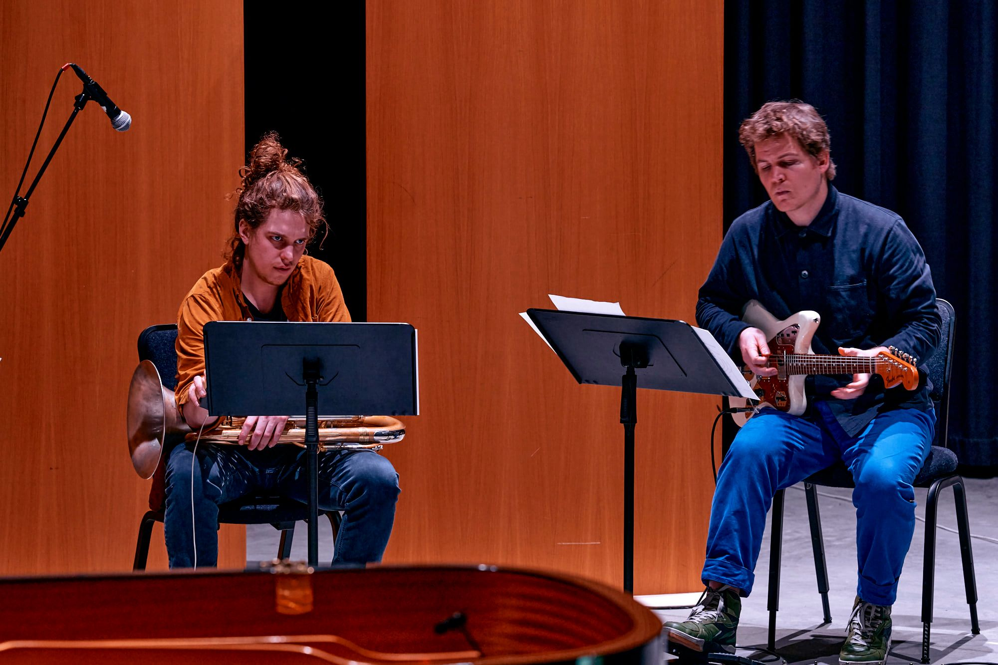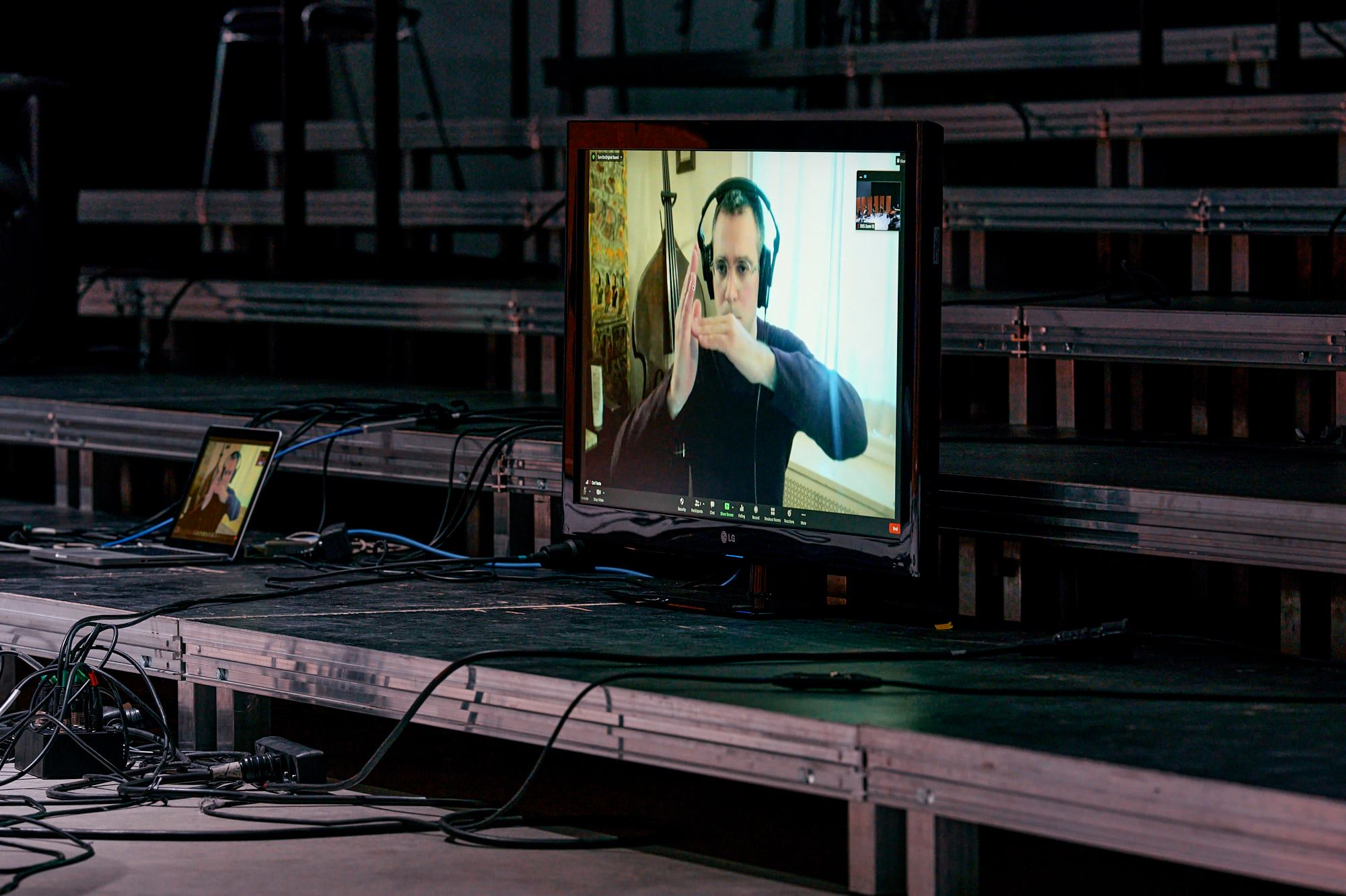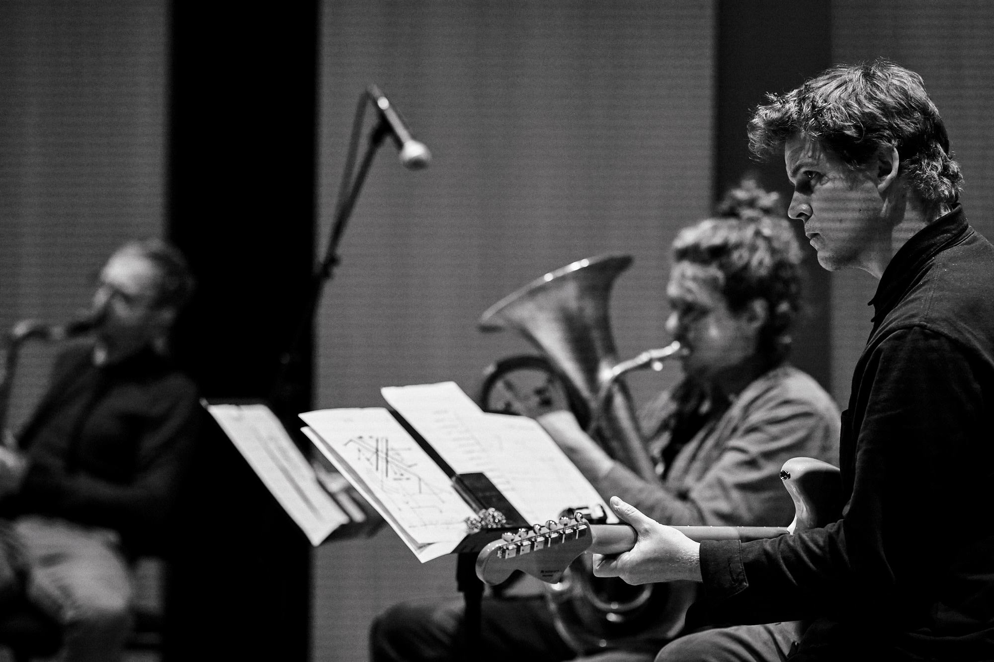 Carl and I started with a few test sessions in October 2020 to check if the software worked, and if the EEMHM sound collage and my live-playing could travel back and forth between New Haven and Brussels without too much trouble. We used JackTrip and SonoBus software to have high quality sound with minimal latency, with Carl controlling the collage and me playing guitar. It immediately worked really well. Unfortunately the planned public performance in November in Antwerp was canceled due to a second wave of Covid-19 infections in Belgium, but since the system was functioning between Carl and myself, we decided to continue more online test sessions, with musicians joining in from our homes in Brussels, Antwerp and New Haven. This proved to be a little more complicated, but we did manage to play a first version of Composition 381 where five players were virtually connected, playing music together. Then, on February 1, we got a second chance to do an actual public performance via live-stream at the conservatory in Antwerp. For this version, we were five musicians playing live in Antwerp with Carl giving conducting cues from his home in New Haven, and all of us connected to the EEMHM web-based controller, sending sound via a server in Amsterdam.