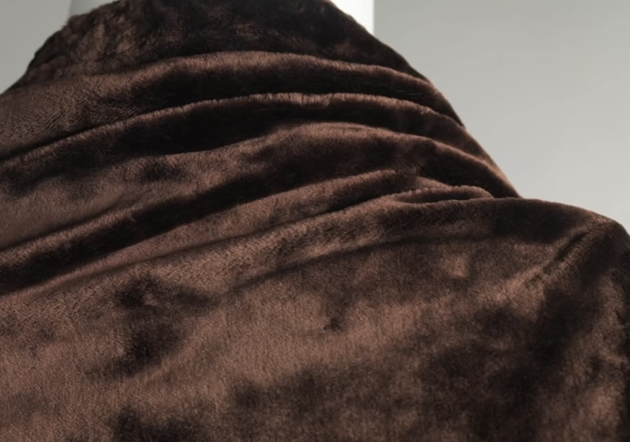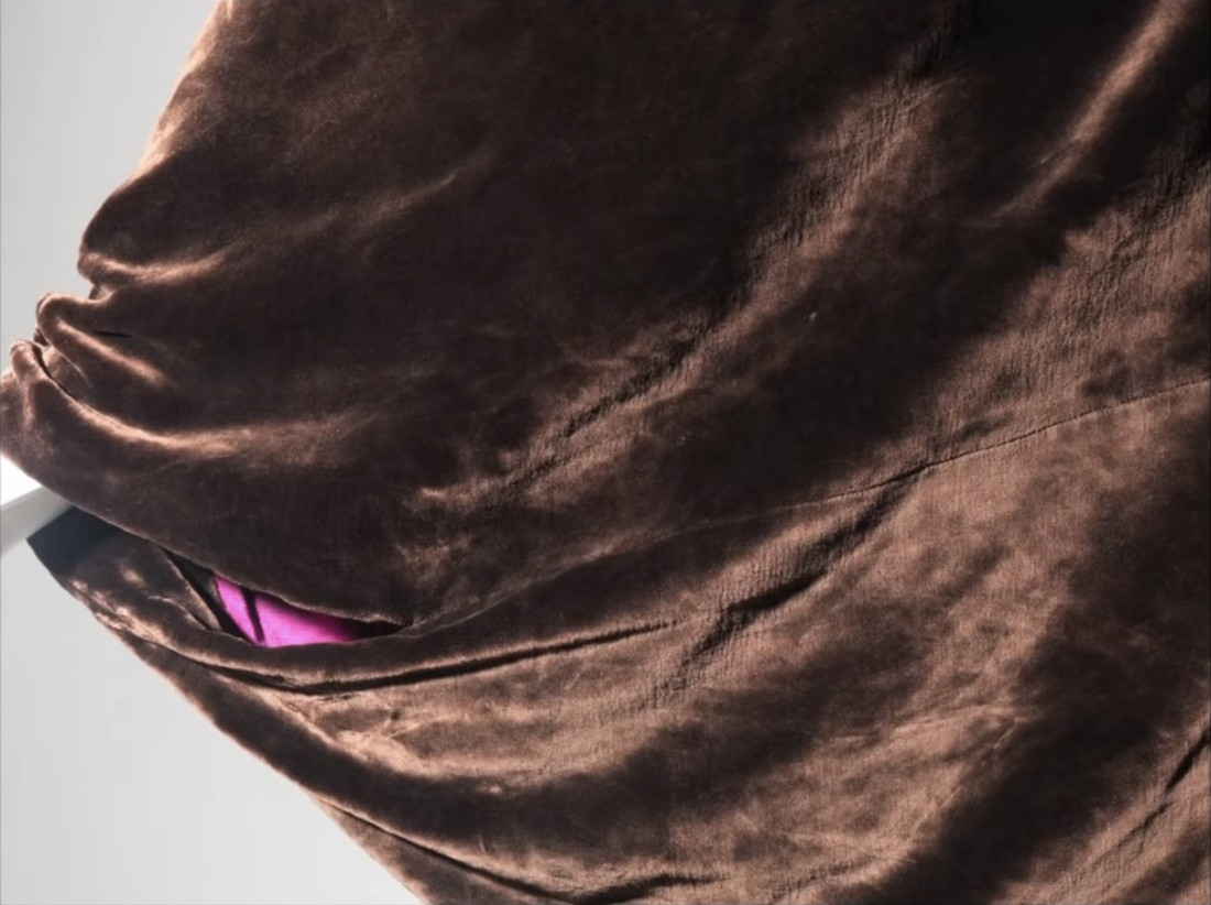 Then by opening it up we discover the vivid color of the interior contrasting with the severe brown. Although the velvet offers many reflects, even more thanks to the pleats, which suggest a fire burnt color. I think the material choosen here, reminds all the more the coccon feeling usually expressed by japanee kimono.