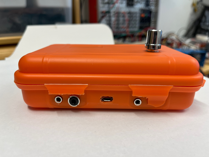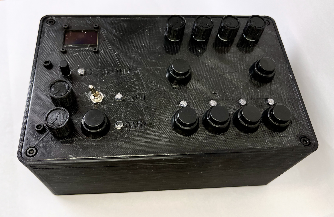 The housing is made of 3D printed PLA and measures 184 x 117,5 x 77mm. The top panel is fitted with an OLED screen, 6 potentiometers, 8 push-buttons, one rocker-switch and 7 LED-lights. The left side has two mini jack inputs for microphones, two USB micro and one USB-A input. The right side has two mini jack outputs for loudspeakers.