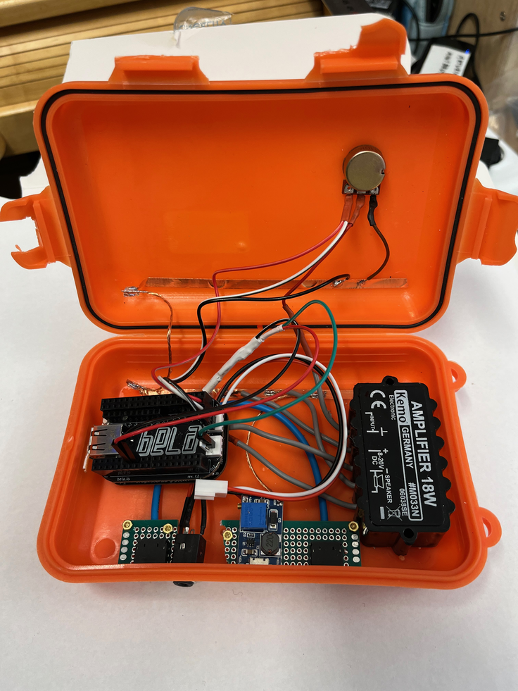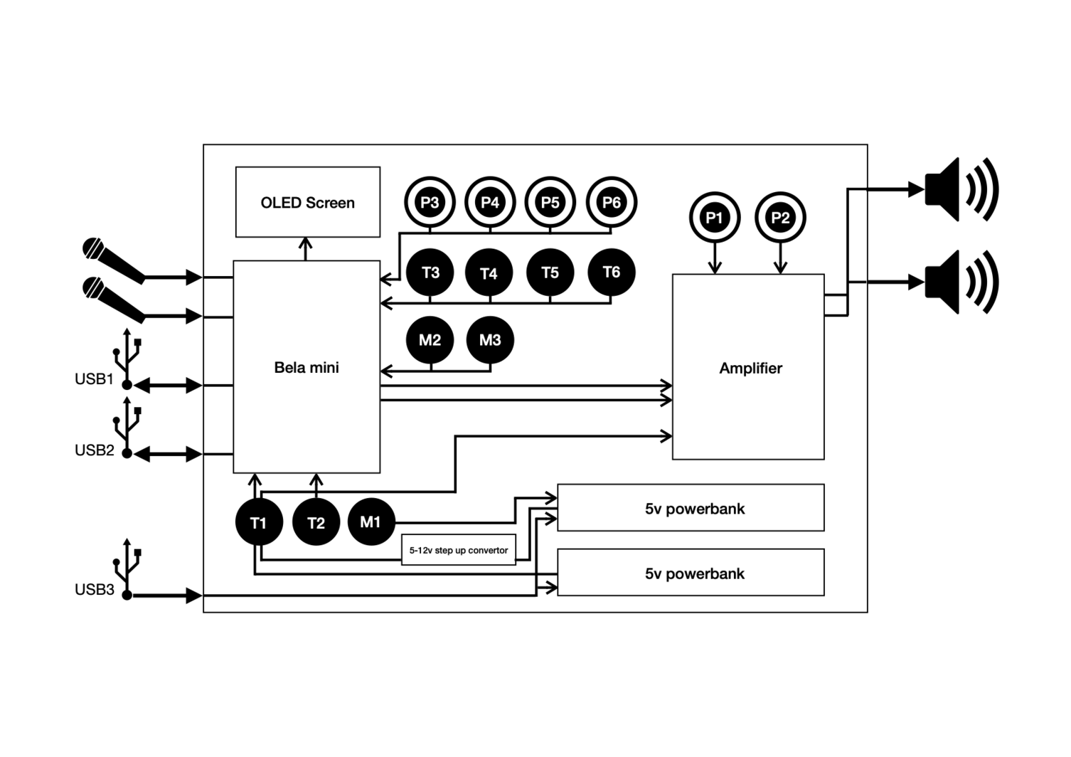 The hardware design is based around the Bela Mini system and a XH-M190 2x100W power amplifier and is mainly battery operated.
