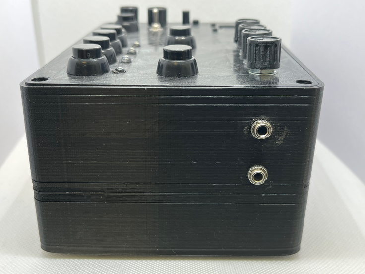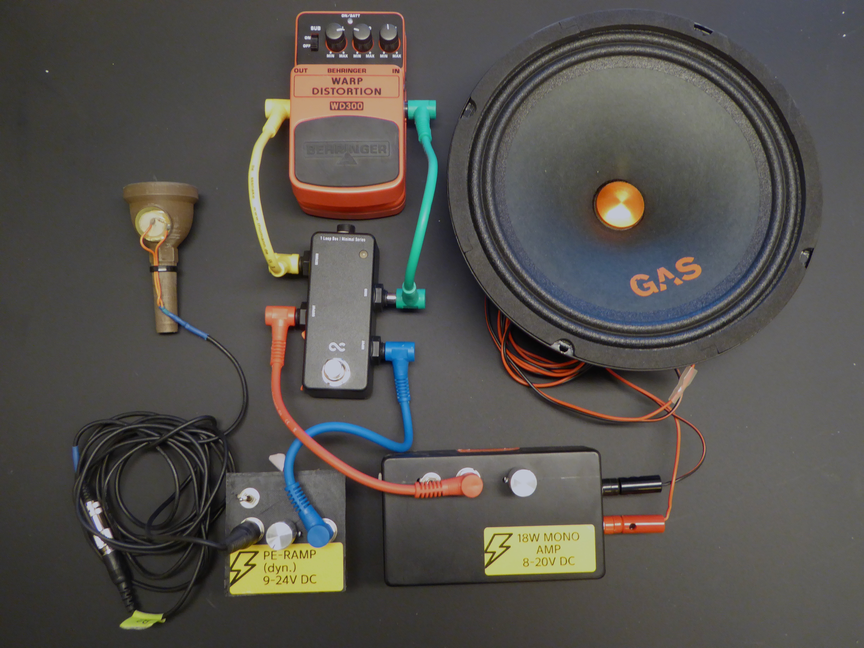 When starting my PhD project in 2021, I started looking at the Thranophone-project again with the aim to learn the electronic-part better, and to create a more reliable device. To better understand the signal path, I separated all the components and built individual modules that could be connected by instrument cables. Quite similar to how a guitarist’s effect rig would look like. The microphone is connected to a pre-amplifier with a gain control. The microphone you see on the picture is a piezo-disc glued to a customised, 3D-printed euphonium mouthpiece. The output from the preamplifier is connected to a power-amplifier via an effect-loop-switch. The loudspeaker has a volume control and a loudspeaker is connected. Any type of effect module can be connected to the loop-switch, which can be turned on or off by the built in button. The effect module shown on the picture is a generic distortion pedal representing any type of effect. All modules run separately on power adapters or batteries. This modular setup proved to be very flexible and I could easily test different modules. Even though the setup was a bit bulky it worked as intended and I soon realised that instead of effect modules, I could connect a computer, which opened up a whole new world of possibilities, either using a DAW like Ableton LIVE, or a programming software like Max/MSP, PureData or SuperCollider for sound processing. Adding a sound card to the computer, I could also leave out both the loop-switch and the pre-amplifier, making the setup more simple. And a more simple setup means less things that can go wrong.
