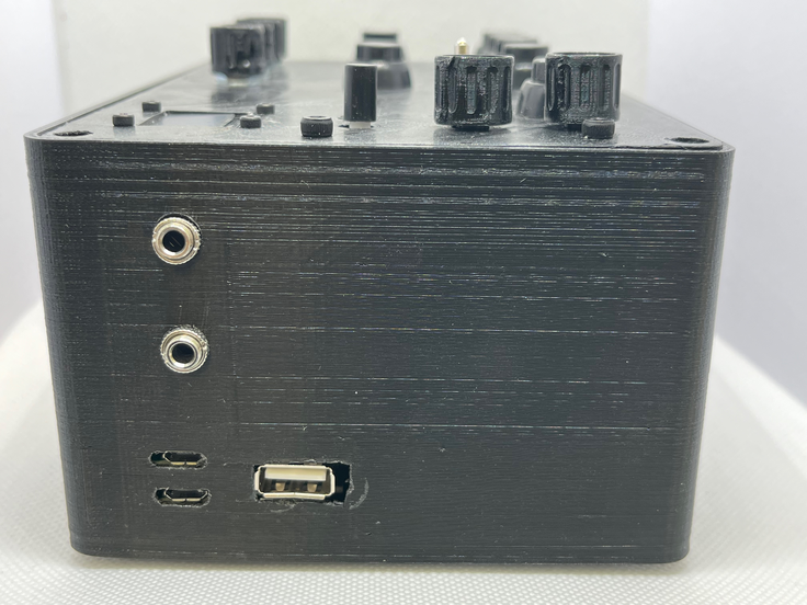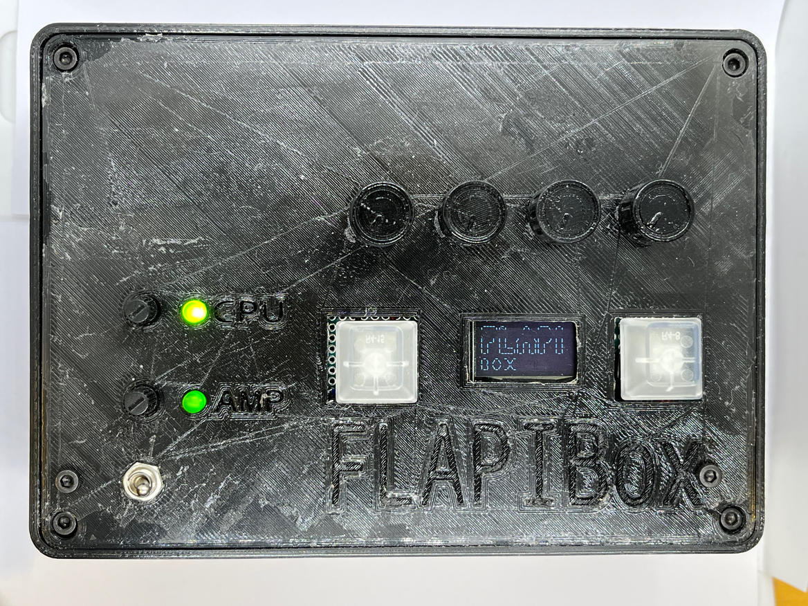 The FLAPIBox prototype #1 is an embedded version of the Breadboard Prototype. Digital Rotary Encoders are controlling the Raspberry Pi. These ones also works as push-buttons. An LCD screen is added for visual feedback. On the front are audio in- and outputs with corresponding input gain and output volume controls. On the backside are the two power inputs. A RNBO by Max-patch is running on the Raspberry Pi, and a Python script is running in the background for handling the rotary encoders and the LCD-screen.