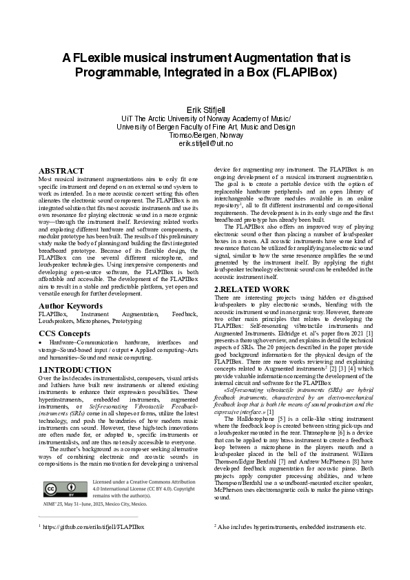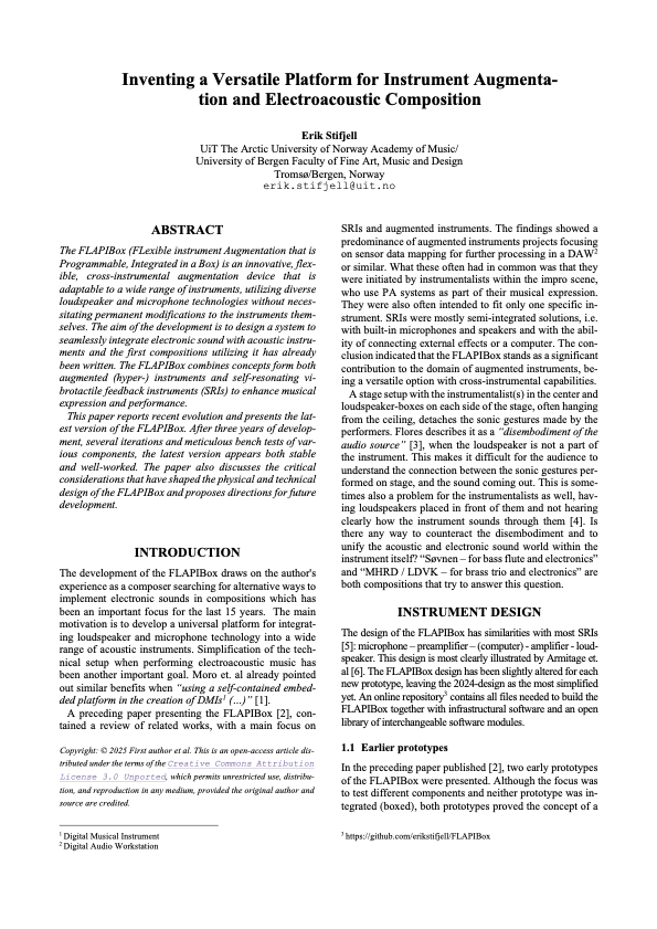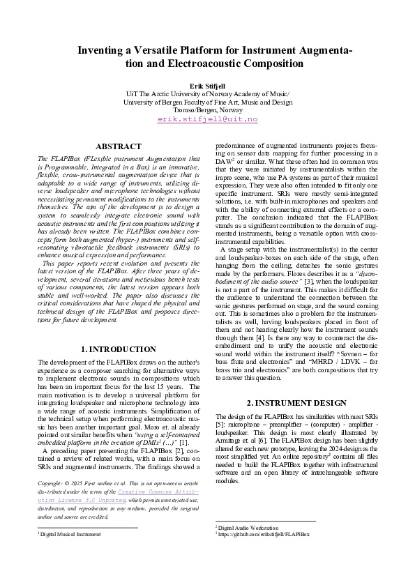 Many of the related projects I have studied are motivated by performers wanting to enhance their instrument and many of these performers are improvisers. Most comparable projects developed are only able to enhance one single instrument, the developer’s instrument. My motivation for developing new technology is from a composer’s view. I’m not enhancing my instrument for extended timbral possibilities as a performer. I’m creating a platform, or device, that will fit any instrument and can be commonly used by myself and others, both performers and composers. The goal is that it should be as reliable, or controllable as any already known instruments, making it easy to integrate in compositions.