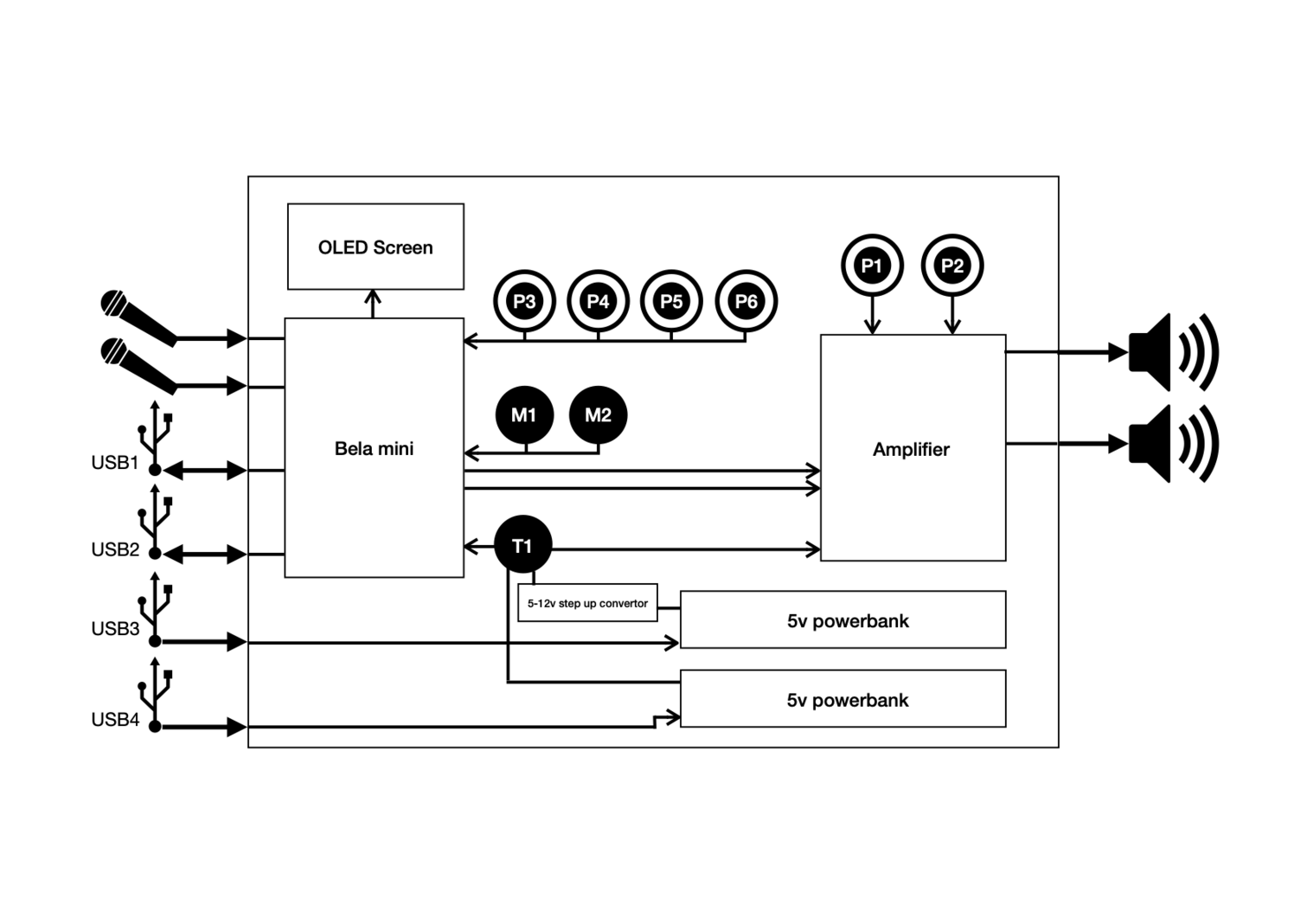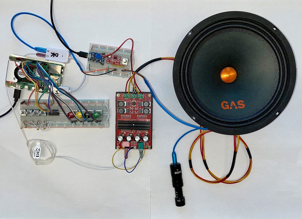 I started looking at options for creating an integrated unit, like the first Thranophone. I believe that an extensive technical setup can sometimes lead the attention away from the performer and hence the music piece itself. Making an integrated unit would, in my opinion, hide the complexity of the technical setup for the audience and focus the attention towards the music. The breadboard prototype is based around the Raspberry Pi 4 mini computer that run either RNBO by Max for sound processing. The software is controlled by buttons and potentiometers, connected to the Raspberry Pi via GPIO pins. The Raspberry Pi has only digital GPIO-pins, meaning that without extra hardware you can only connect binary switches. For using Analogue potentiometers you need either a micro controller or a Digital-To-Analogue converter, or you can use digital rotary encoders. Either way, you need extra programming code in a different language to make these work. On the large breadboard you see both a analogue potentiometers setup and a digital rotary encoders setup. Both setups were tested and require a Python code to work with Max/MSP. Further the setup is similar to the Modular prototype: A microphone connected to a pre-amplifier on the small breadboard, running to a generic sound card connected to the Raspberry Pi. The sound output from the computer’s sound card runs to a power amplifier with a loudspeaker connected. Two separate power sources are needed, one for the amplifier and one for the computer.