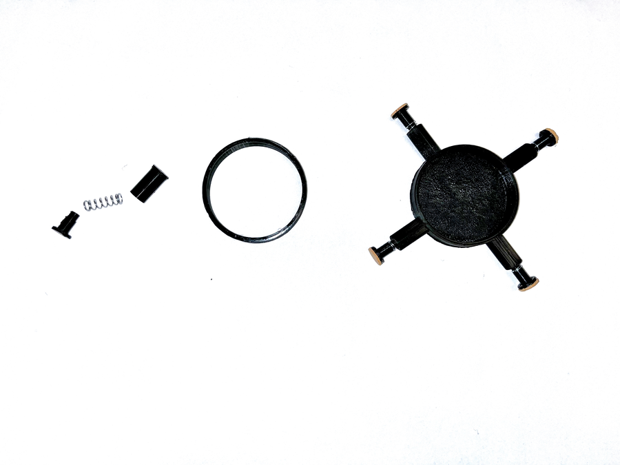 3D printed parts (from left): 1) Foot, spring and tube 2) Ring for testing diameter 3) Ring becomes tray with 4 spring-loaded feet
