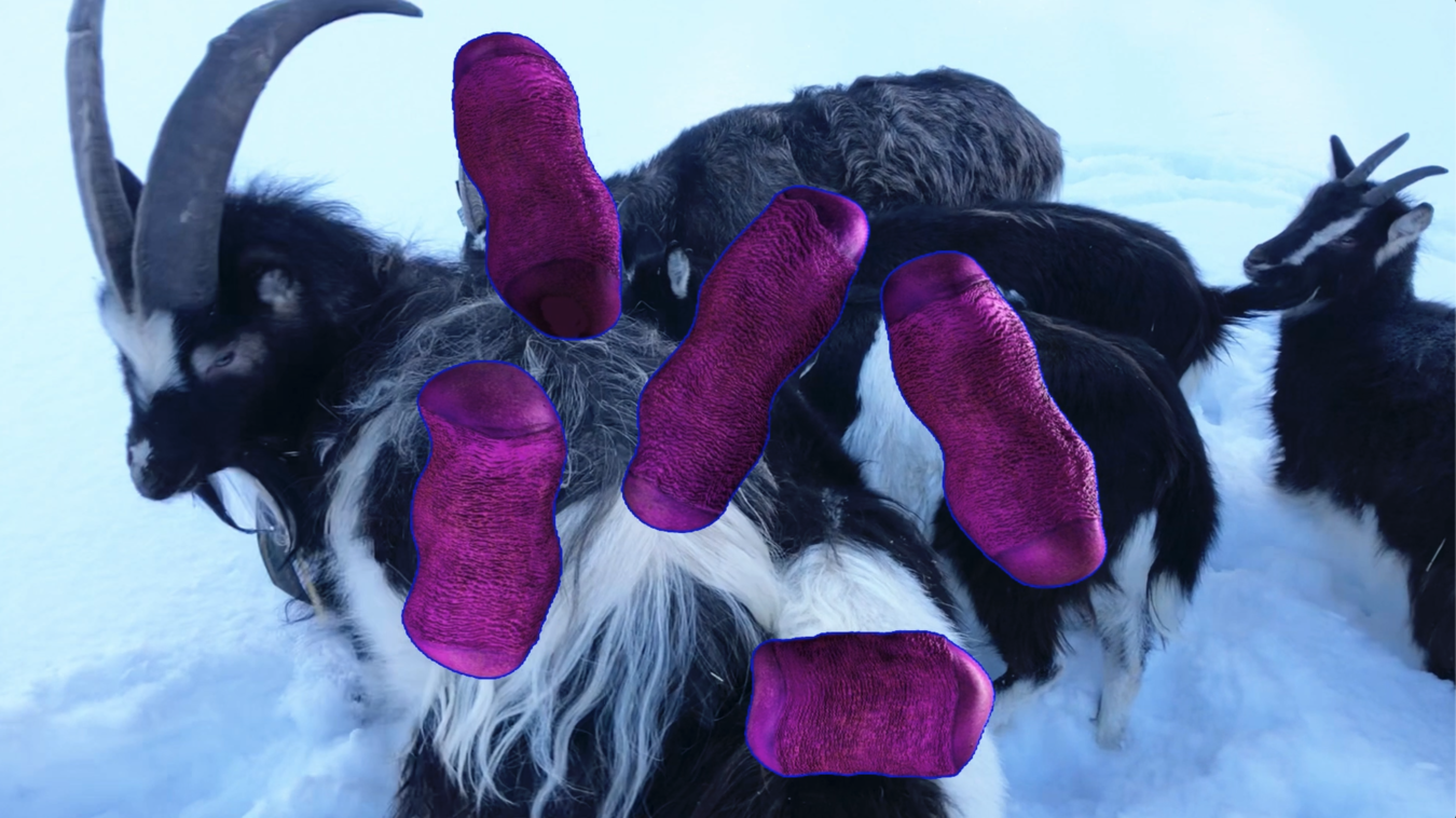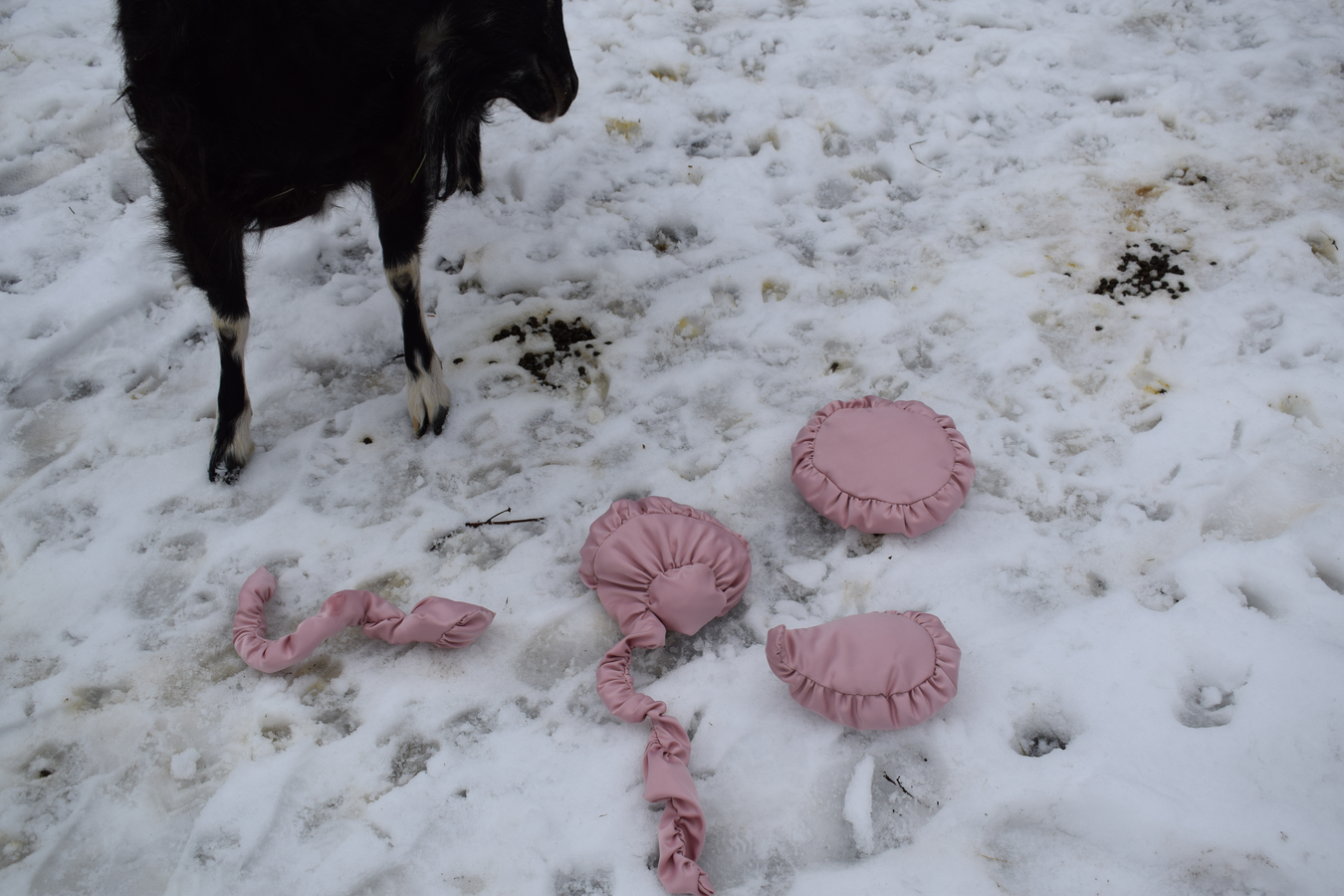 The story, which is also to be followed in ethnographic vignettes describing the fieldwork, is grounded in my multi-species home. It is a site where the material compositions of the artworks are implemented. I had been living in the countryside for about ten years, to have a garden and foraging access to wild plants, berries, and mushrooms, and to learn about the co-dependence of ecosystems in practice. During these years, our home became populated with other animals that had been abandoned. I had embedded collaboration with the more-than-human world already for years in my artistic practice. The affective, material, and messy events depict the entanglements that enabled empirical, embodied evidence to be brought forth from the encounters. These fieldnotes are found hovering from some of the images of this exposition. The notes demonstrate how instead of treating other animals, microbes, or soils and their metabolic processes as a (passive) matter or instrumentalising them as a medium for art, we were affective animals to animals, sympathetic matter to matter to each other. Affect is here treated in a new materialist configuration, where it is not reduced to categorical feelings but rather unravels the impact between bodies and things toward leaky compositions (Massumi 2014). The goal was to cultivate sensitivity and attentiveness toward especially sentient beings such as goats but also to emphasise the biodiverse composition that potentially enhances living conditions for all.