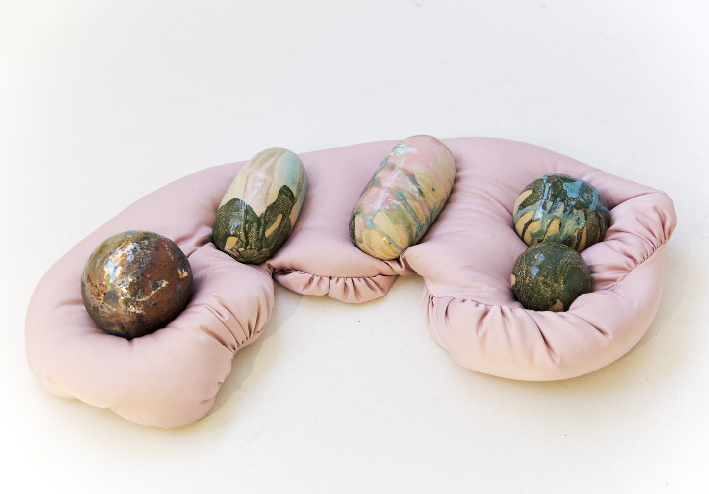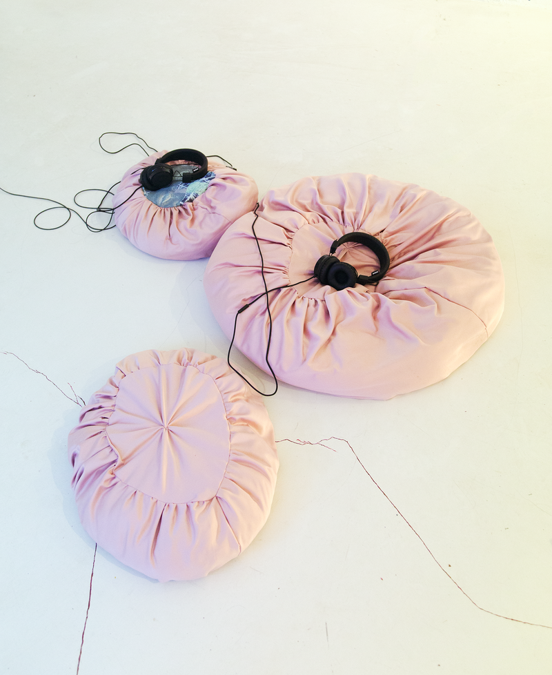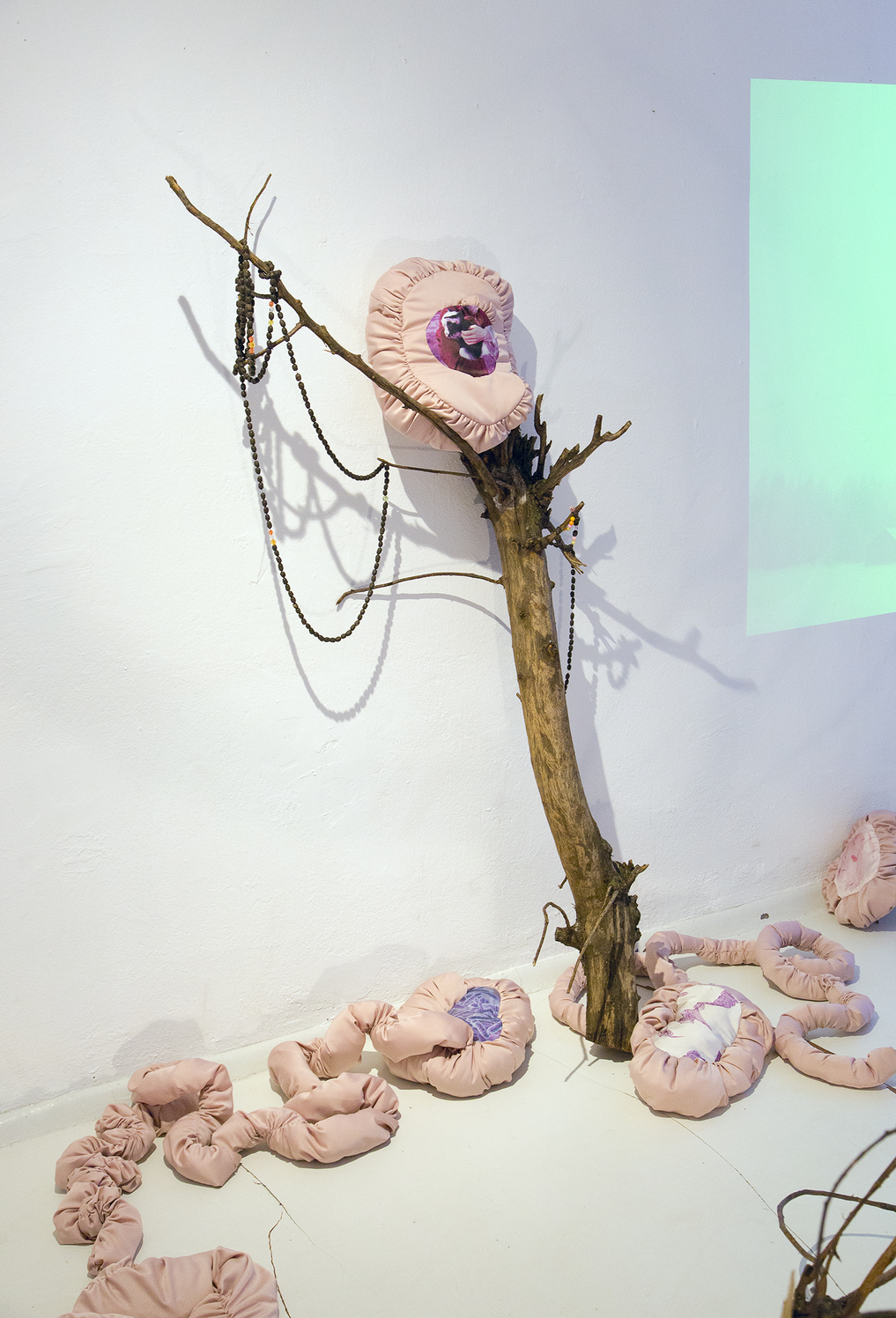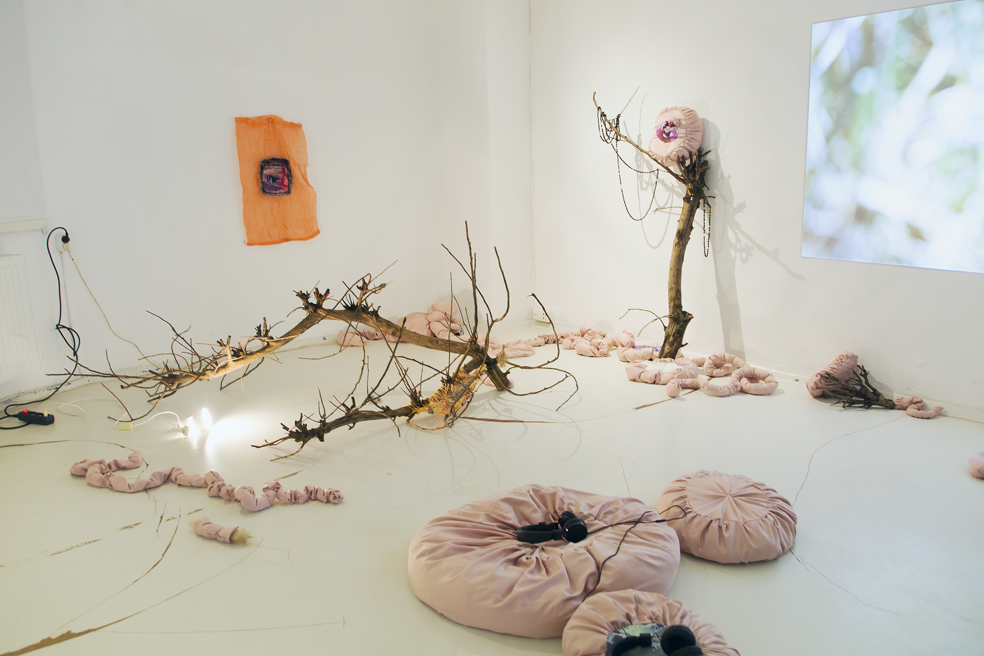 Sculpture-like materials that were left from goats secreting and excreting were exhibited in SOLU / Bioart Society gallery in Helsinki, within the project called ‘m/other becomings’ (2022). This exposition and the artworks would have not been possible without the co-production with goats. The Gaia story of Agential Guts took different forms. In pink textile works, I wanted to approach the visceral feeling of guts. Other elements were objects that emerged from the matters of care, out of faecal pellets, salt stones, and branches gnawed by goats. The story was also told in the form of a video essay. Proposing that we collaborated with goats was overshadowed by human animals having more agency over other animals, and I cannot—and do not wish to—deny that asymmetry or any other asymmetries of the assemblage. This staying with a trouble, as Haraway (2016) famously formulates, led to further thinking about what care, creativity, and collaboration might mean in the post-anthropocentric context.