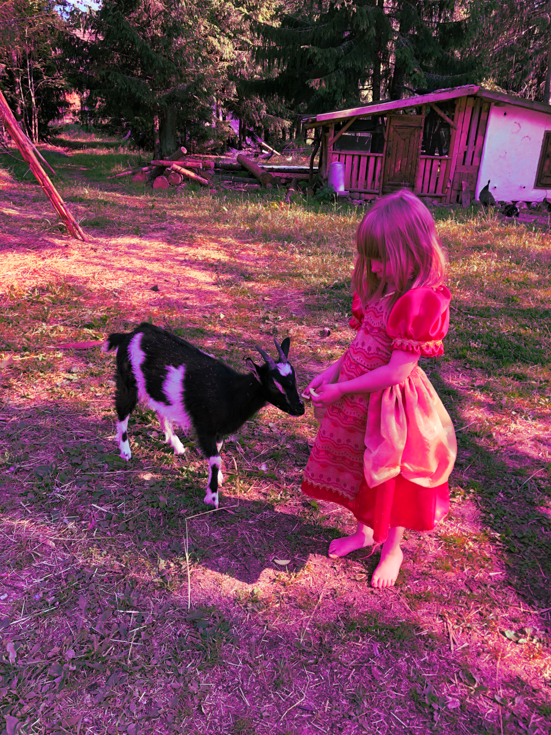 Moving around with goats and collecting materials was part of the daily practices of care where the aesthetic choices were made on the go, almost as if they were not my choices but aesthetico-political choices; animal politics (Massumi 2014). The shaky camera and unfocused frames hint at the emergence of ethnographic situations that were sudden and directed by unruly turns of events. Breaks in character, where the human sometimes performed and then became a caretaker more casually, also referred to the possibility of changes in subjectivity, eco-philosophically constituted by multiple relatings (Braidotti 2013: 49). We had to cross the monoculture fields to reach the forest. It felt stunning to belong to this cluster, where we were glued together by our sensory, affective, and material belonging. I felt like goats were inviting me to revolt against the plantationocene. Trekking in the forest was a way to get to know my companion goats in a way that allowed them to make collective choices of where to turn, and when it was time to return home. Their fierce looks were unforgettable when they entered the forest, rewilding us all.