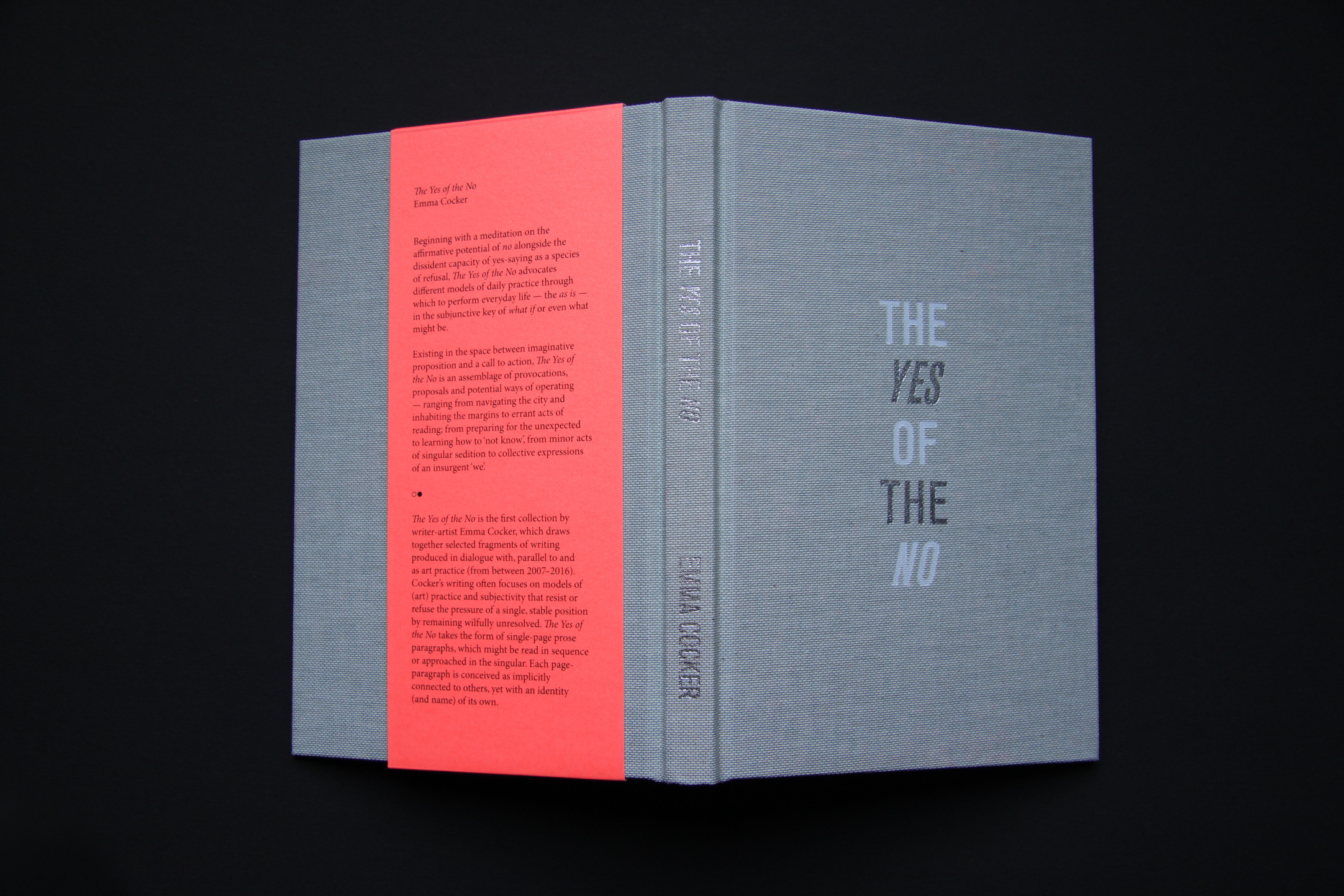 Beginning with a meditation on the affirmative potential of no alongside the dissident capacity of yes-saying as a species of refusal, The Yes of the No advocates different models of daily practice through which to perform everyday life — the as is — in the subjunctive key of what if or even what might be. Existing in the space between imaginative proposition and a call to action, The Yes of the No is an assemblage of provocations, proposals and potential ways of operating — ranging from navigating the city and inhabiting the margins to errant acts of reading; from preparing for the unexpected to learning how to ‘not know’, from minor acts of singular sedition to collective expressions of an insurgent ‘we’. The Yes of the No is the first collection by writer-artist Emma Cocker, which draws together selected fragments of writing produced in dialogue with, parallel to and as art practice (from between 2007–2016). Cocker’s writing often focuses on models of (art) practice and subjectivity that resist or refuse the pressure of a single, stable position by remaining wilfully unresolved. The Yes of the No takes the form of single-page prose paragraphs, which might be read in sequence or approached in the singular. Each page-paragraph is conceived as implicitly connected to others, yet with an identity (and name) of its own.