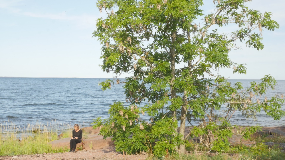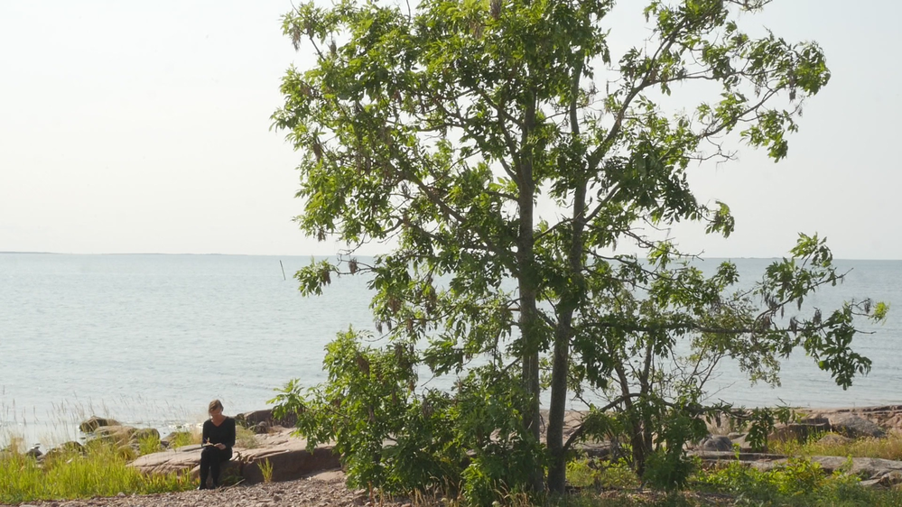 The second experiment “Askträdet på Eckerö – The Ash Tree on Eckerö” (med text – with text) (6 min 11 sec.) was performed on 8 July 2021, the same “Perform – Respond – Extend” event, sitting on the rock next to the tree and shot from a middle distance, showing the leaves of the tree in greater detail. I am writing a letter to the tree, in Swedish, discussing the myth of Daphne, who was transformed into a tree to avoid the harassment by Apollon, and wondering, whether the tree is a human in disguise. The letter is read and recorded as a voice-over and translated into English subtitles added to the video.