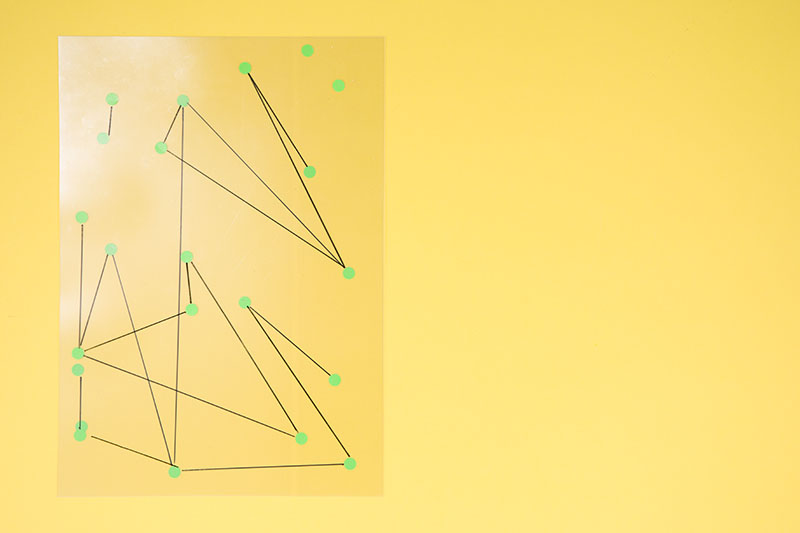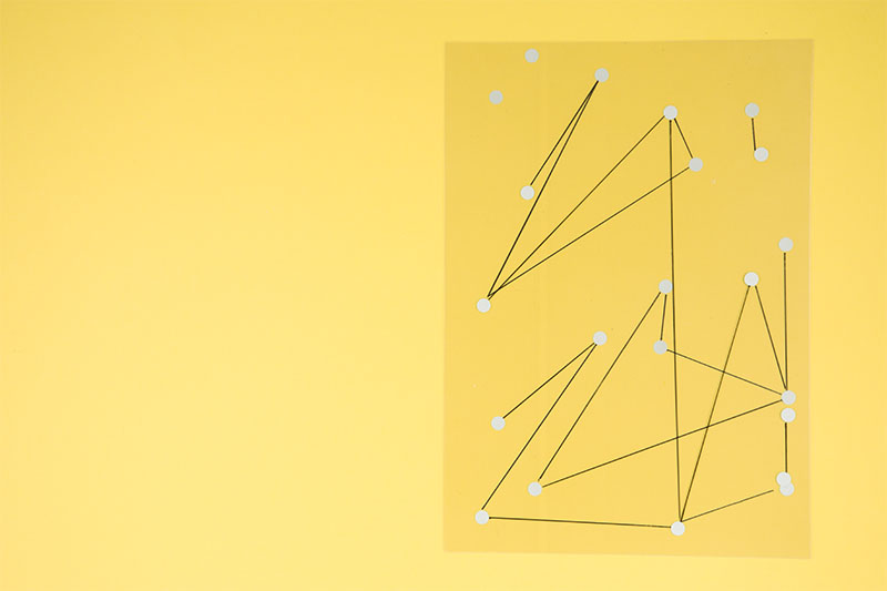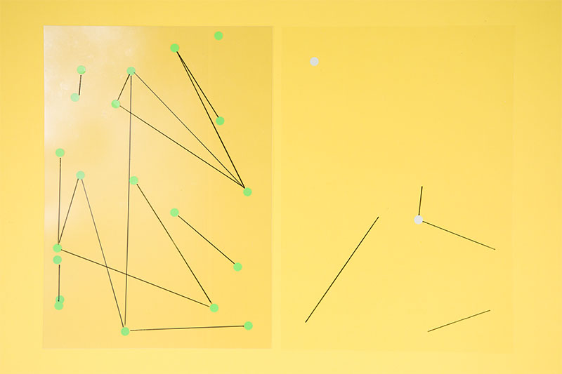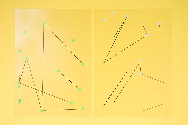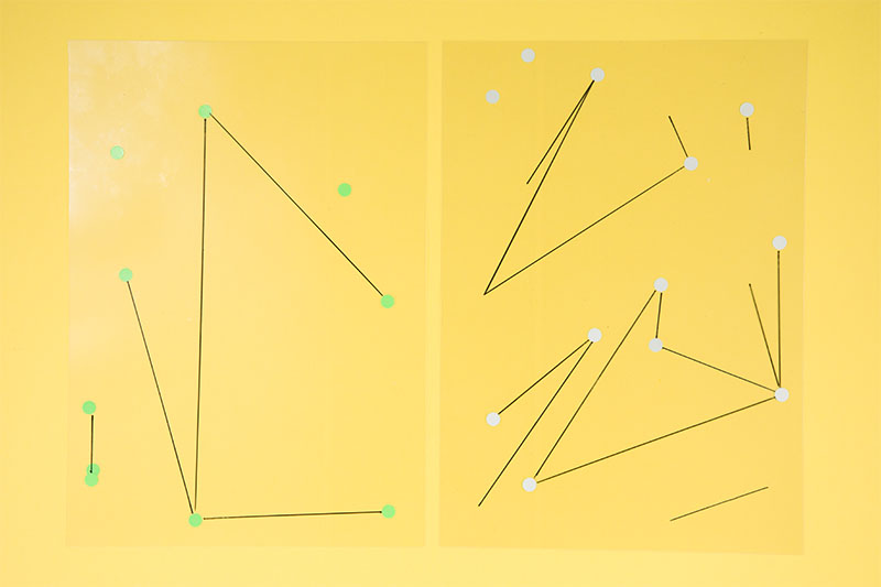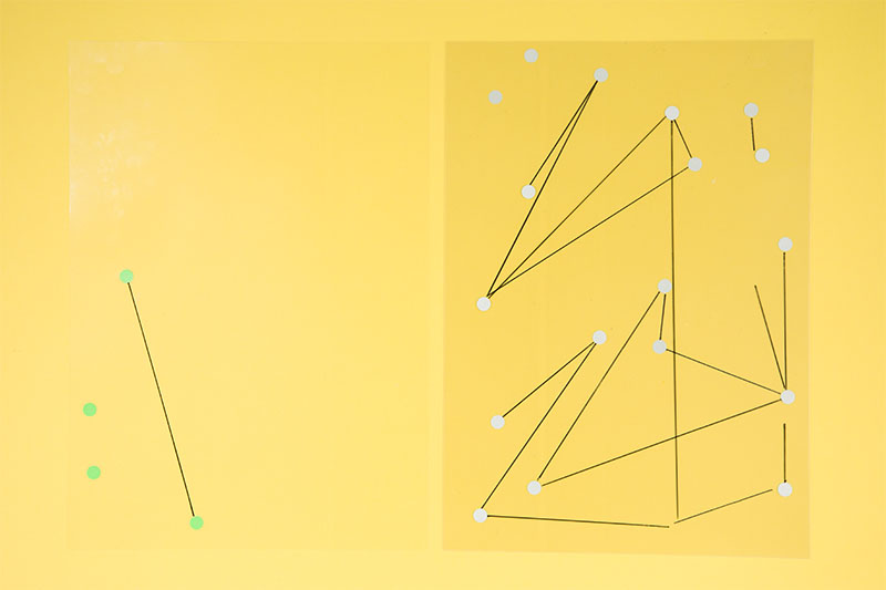 In this book, two algorithms also move back and forth through the book transforming its architecture. One algorithm that places dots begins at the front page, and the other algorithm that draws lines between dots begins at the back page. They run one after the other, so the dot algorithm runs once on a page, and then the line algorithm runs once on a page, and then the dot algorithm and so on. After each time they run they move ahead or backwards to the next page, depending on their current direction through the book. These processes move back and forth through the book until I decide to stop.