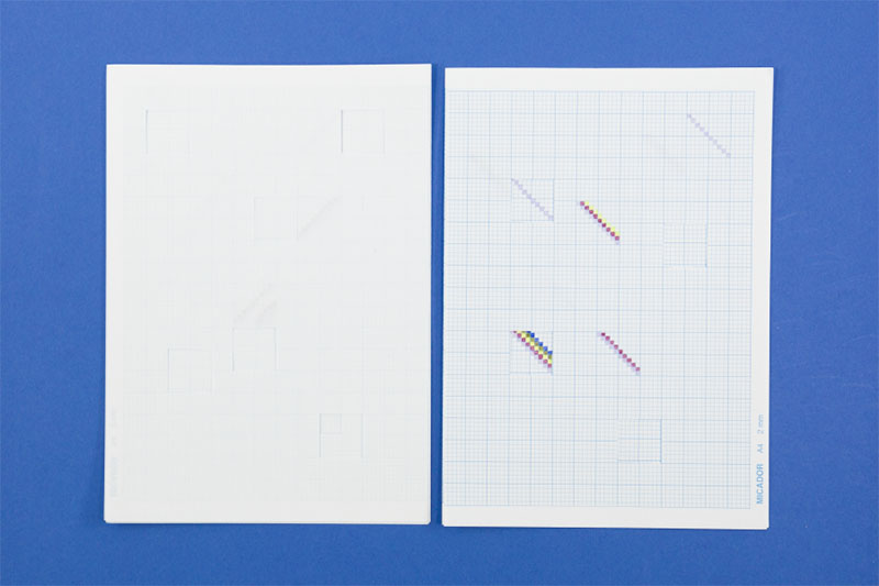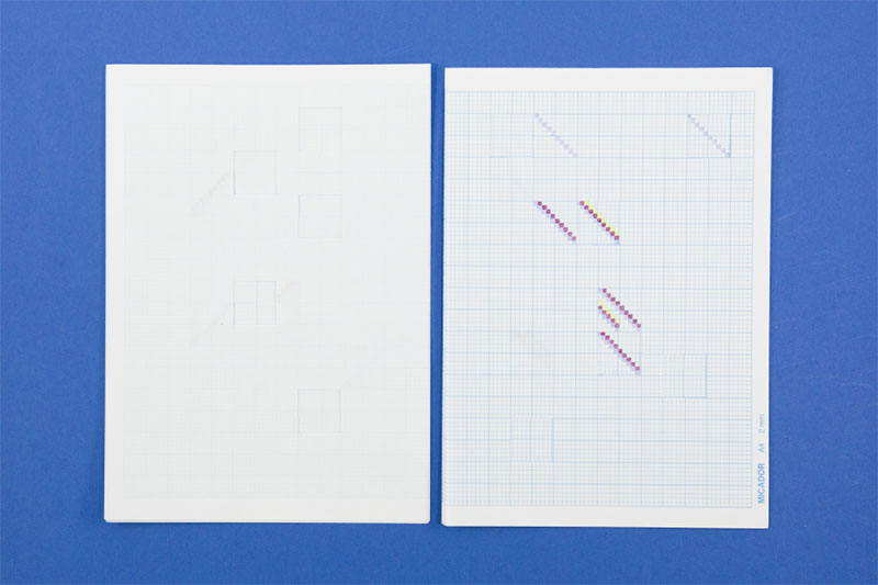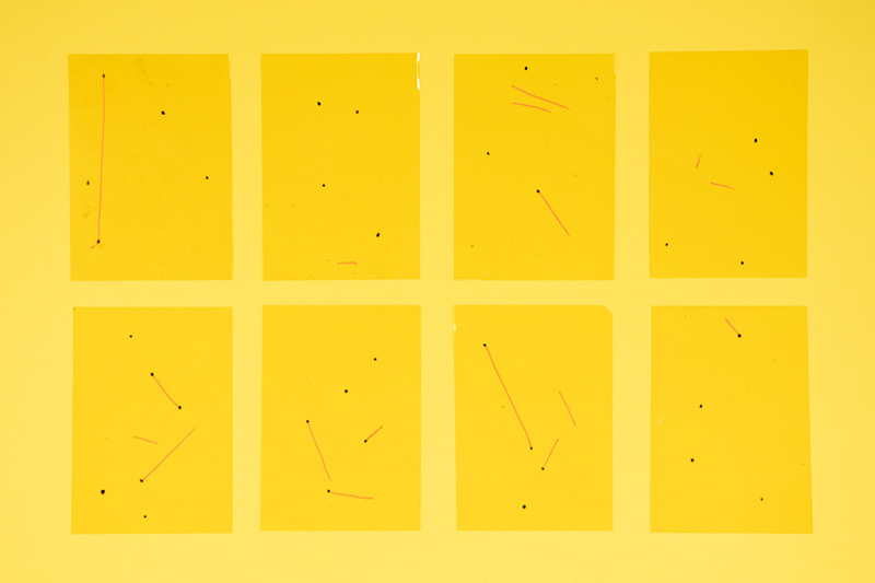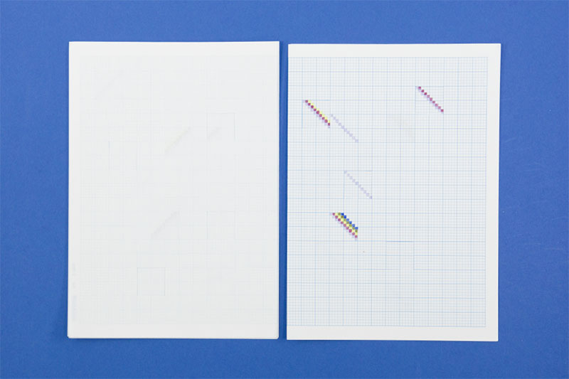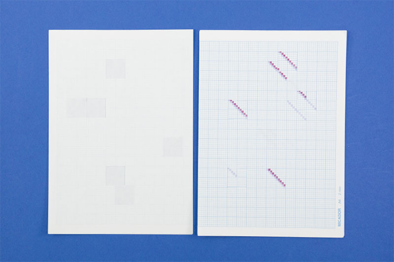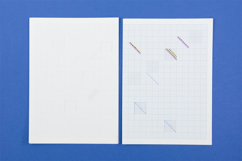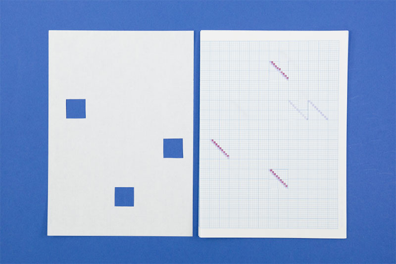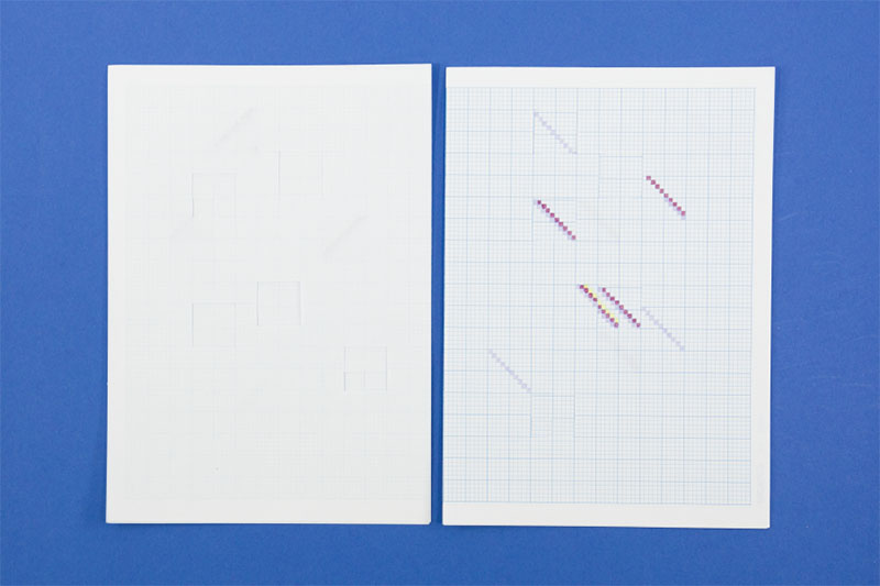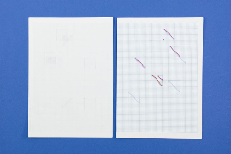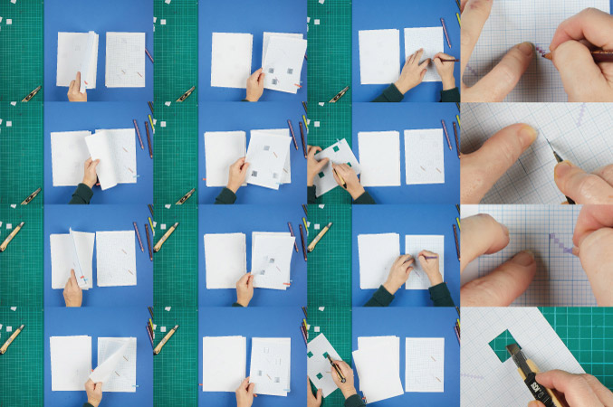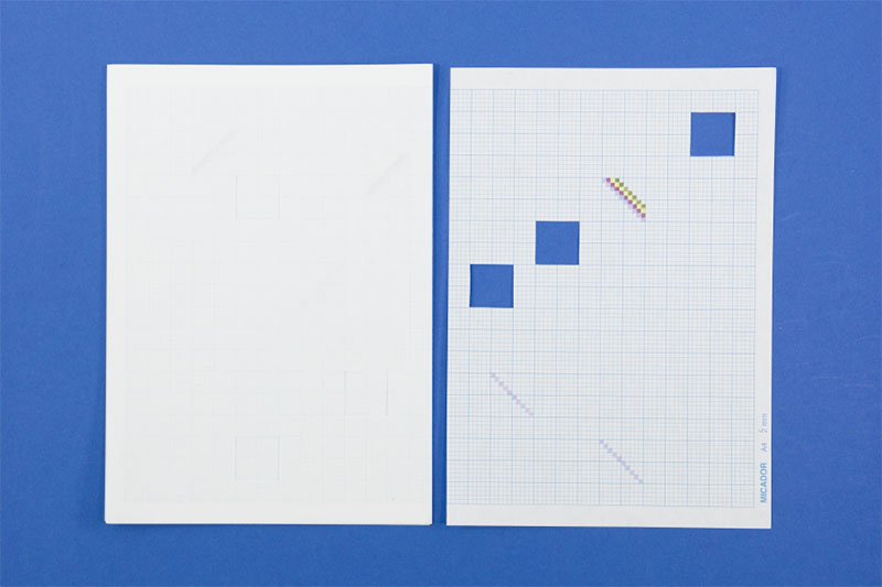 * This randomness could be worked out in a number of ways. When I made these books I used random.org. Windows were randomly selected through their order from top to bottom, left to right, and locations to cut a window using increments of the 1x1cm sections of the grids.