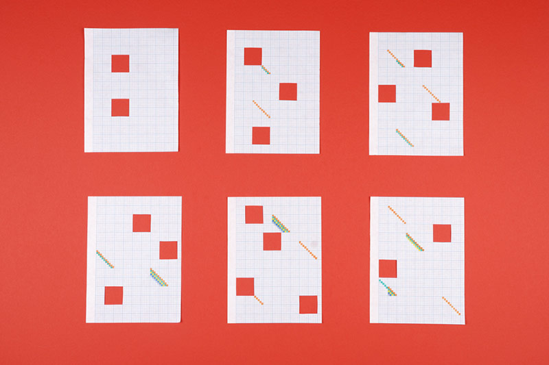 In this book, two algorithms move back and forth through the pages transforming its architecture. One (cutting) algorithm begins at the front page, and the other (drawing) algorithm begins at the back page. They run one after the other, so the cutting algorithm runs once on a page, the drawing algorithm runs once on a page, and then the cutting algorithm and so on. After each time they run, they move forwards or backwards to the next page, depending on their current direction through the book. These processes move back and forth through the book until I decide to stop.