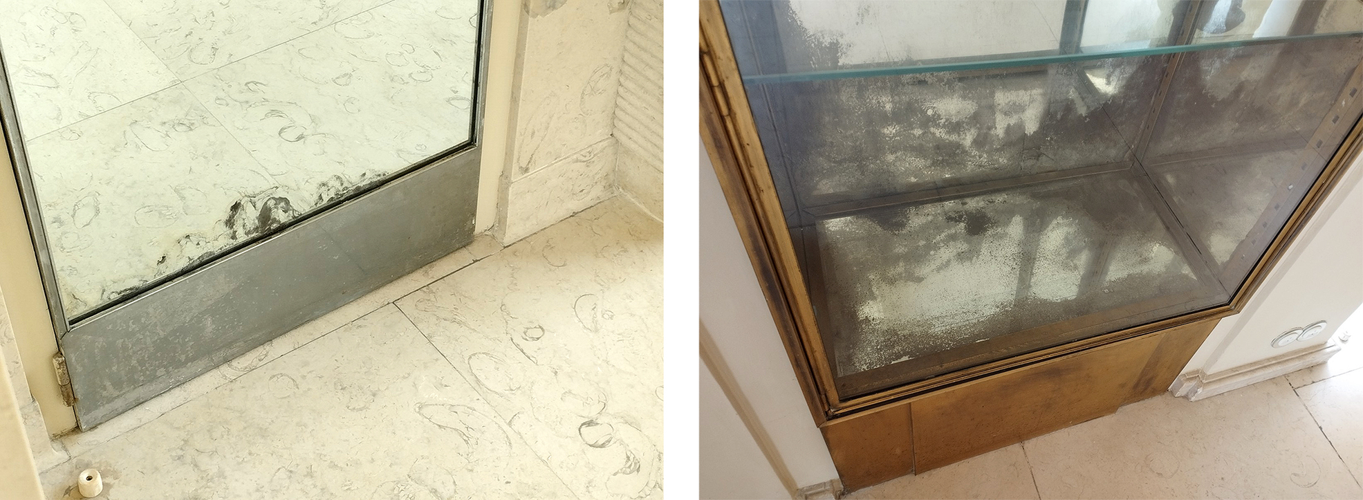 The Serralves Villa, an Art Deco villa from the 1930s in Porto's Serralves Museum of contemporary art, has within it doors and cabinets where mirror glass has corroded in ways that suggest organic fungal growth. While the corrosion in the example, below left, echoes in its own terms the marble veins of the floor both outside and reflected in the mirror, the example, below right, sees considerable corrosion of mirror glass on three sides and bases of a glass-fronted cabinet bouncing off one another, Figures 18/19.