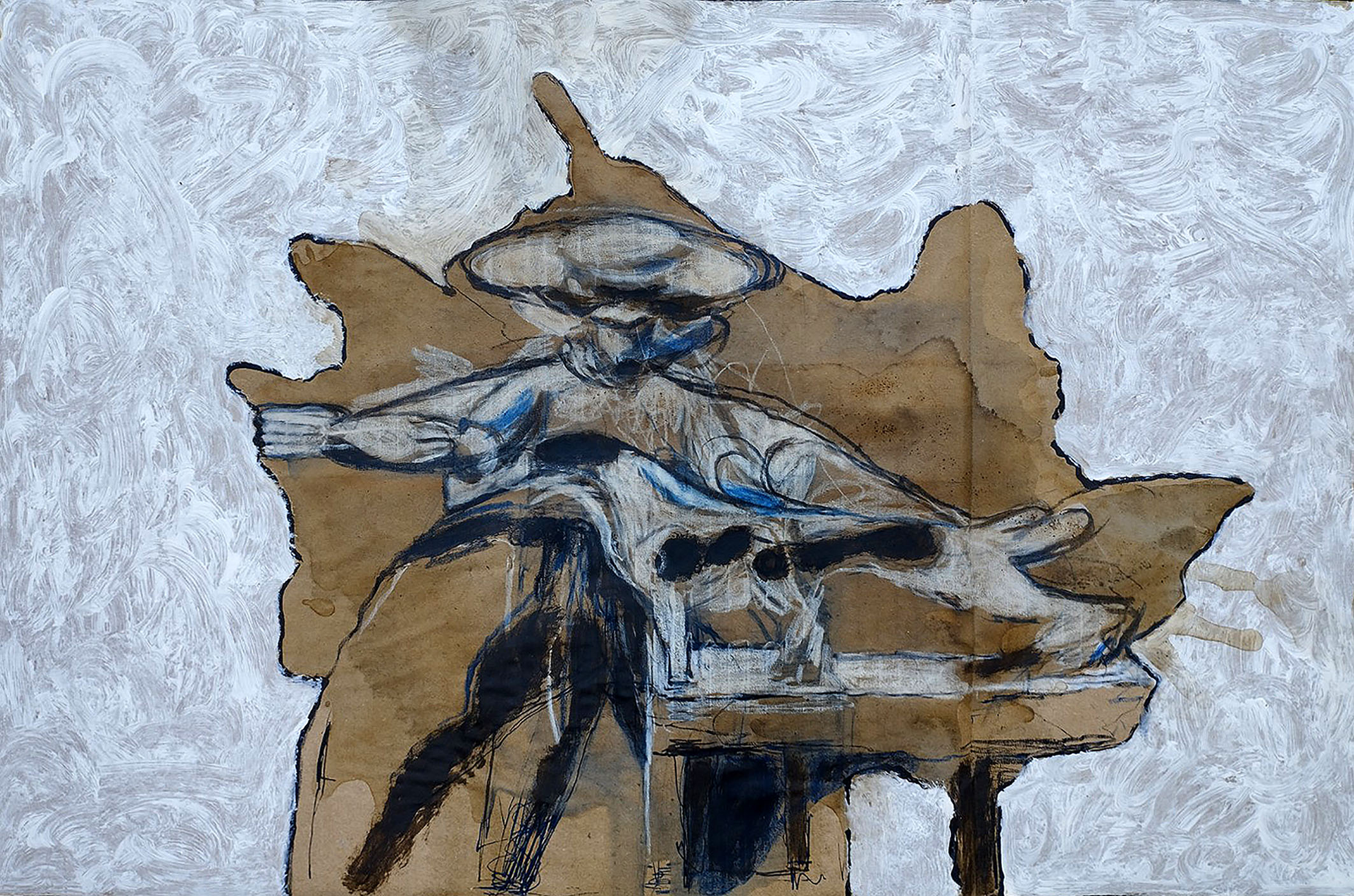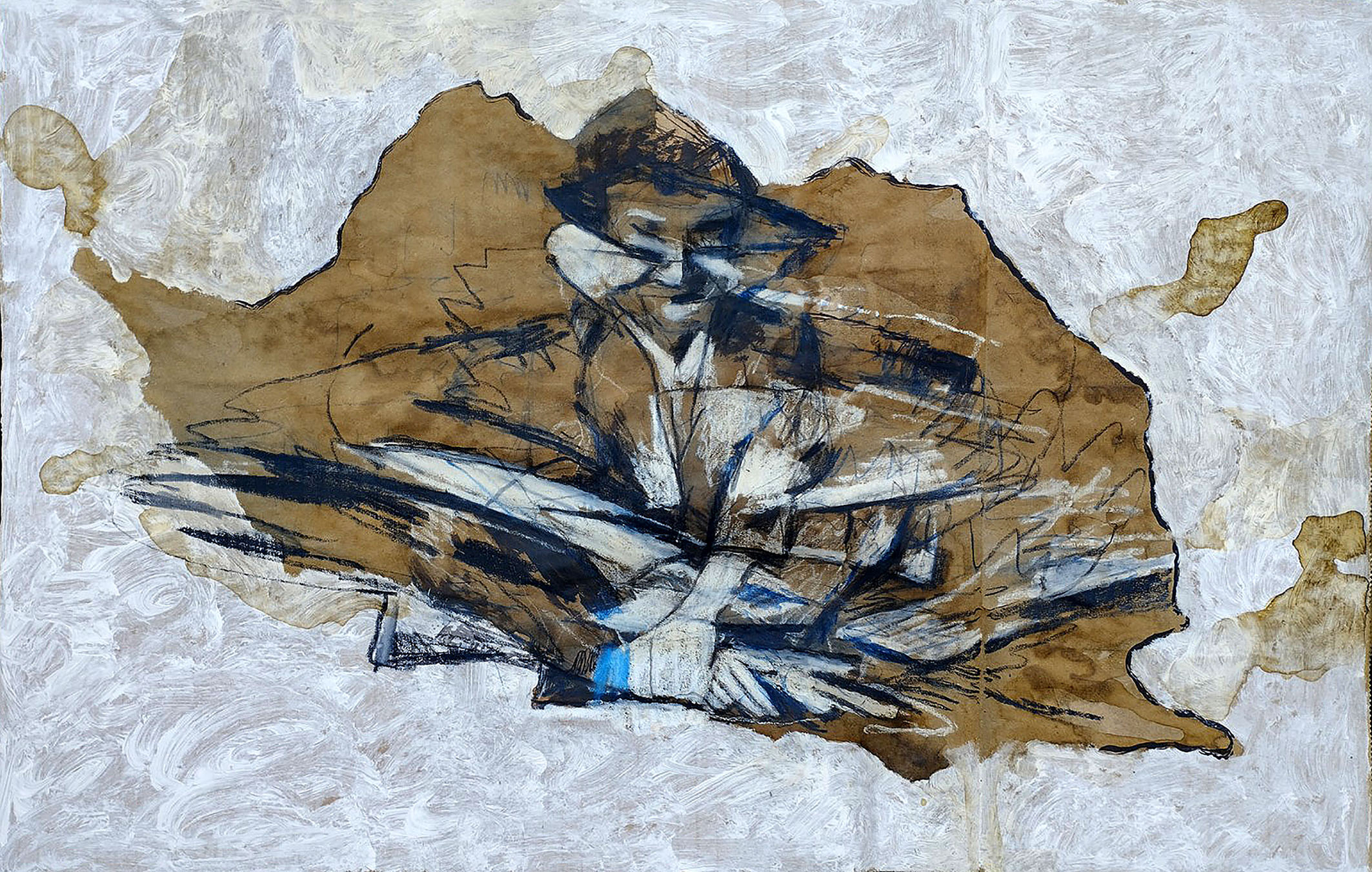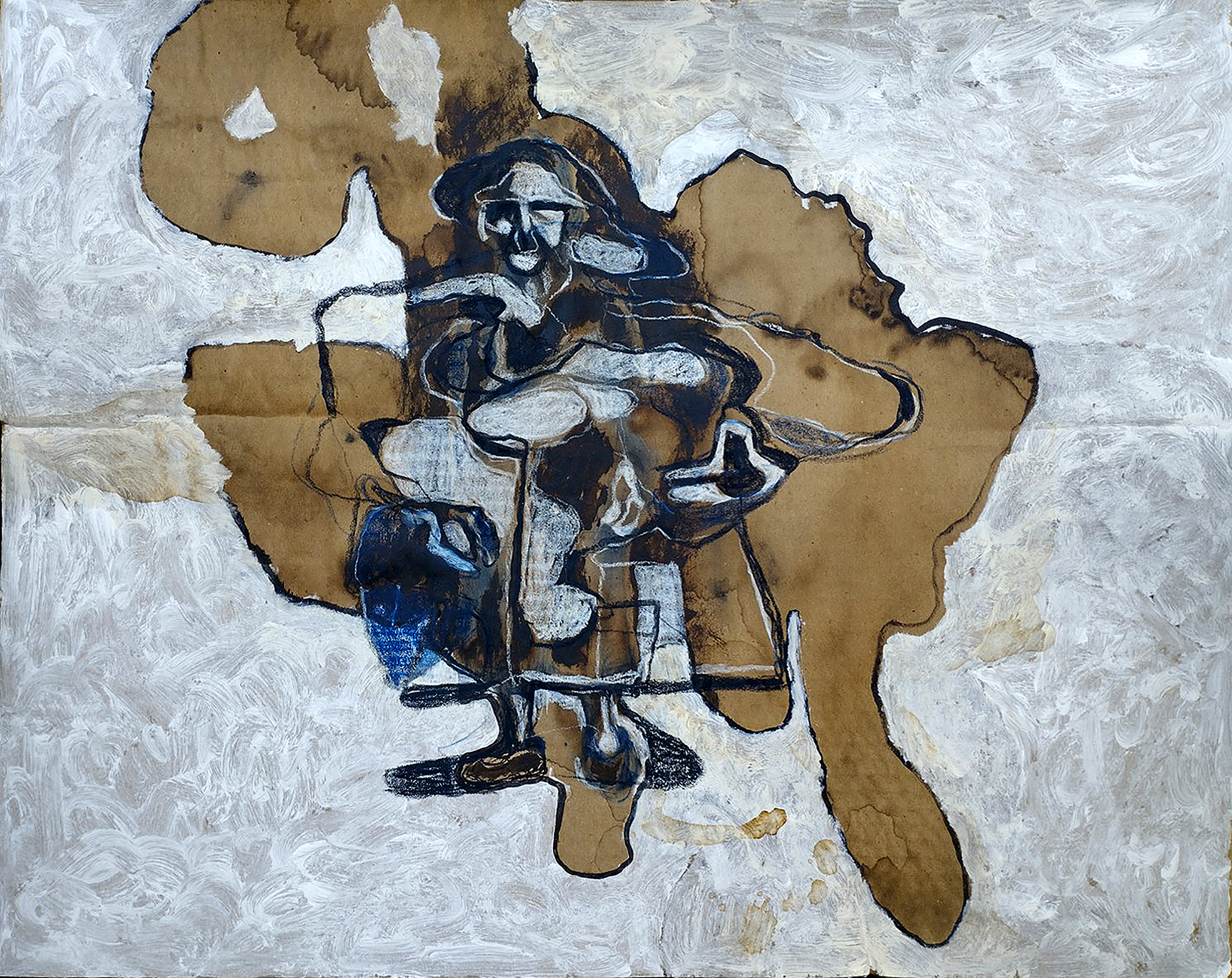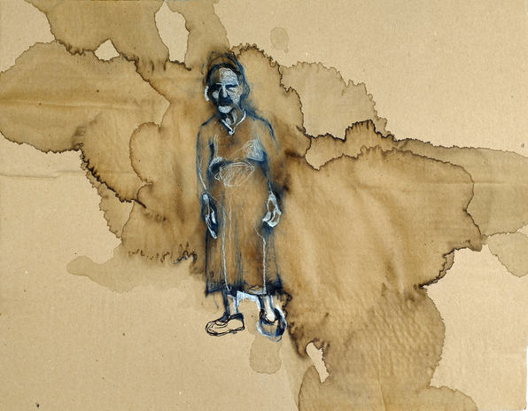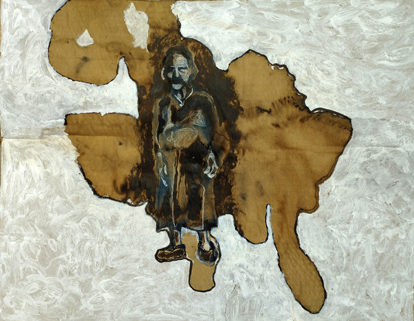 Fig 29: Grandfather image. Ink, crayon, coffee, white acrylic primer on corrugated cardboard, 55 x 35cm, attributed to M.