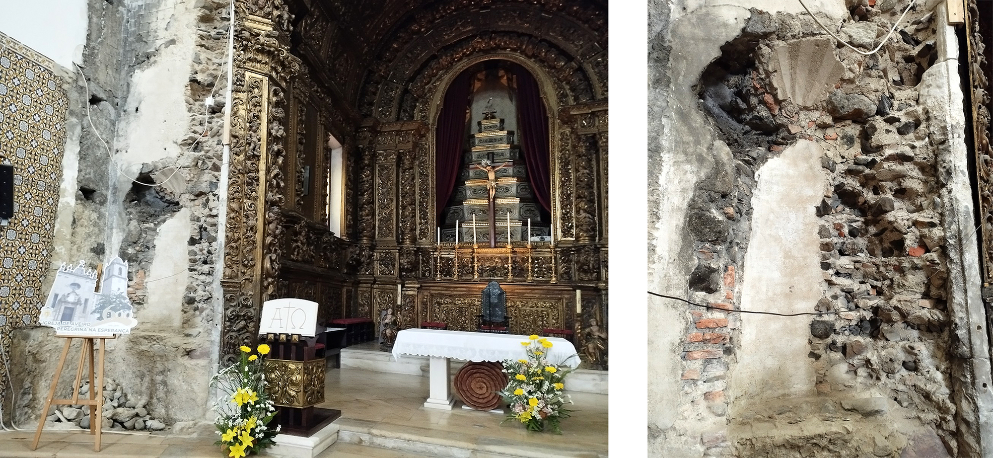 The left wall of the altar of a church in Aveiro, Portugal, below, with its facing decoration torn away, shows the wall's cellular rough-stone construction, with some mould or fungal infiltration of cement up from the floor, Figure 23.